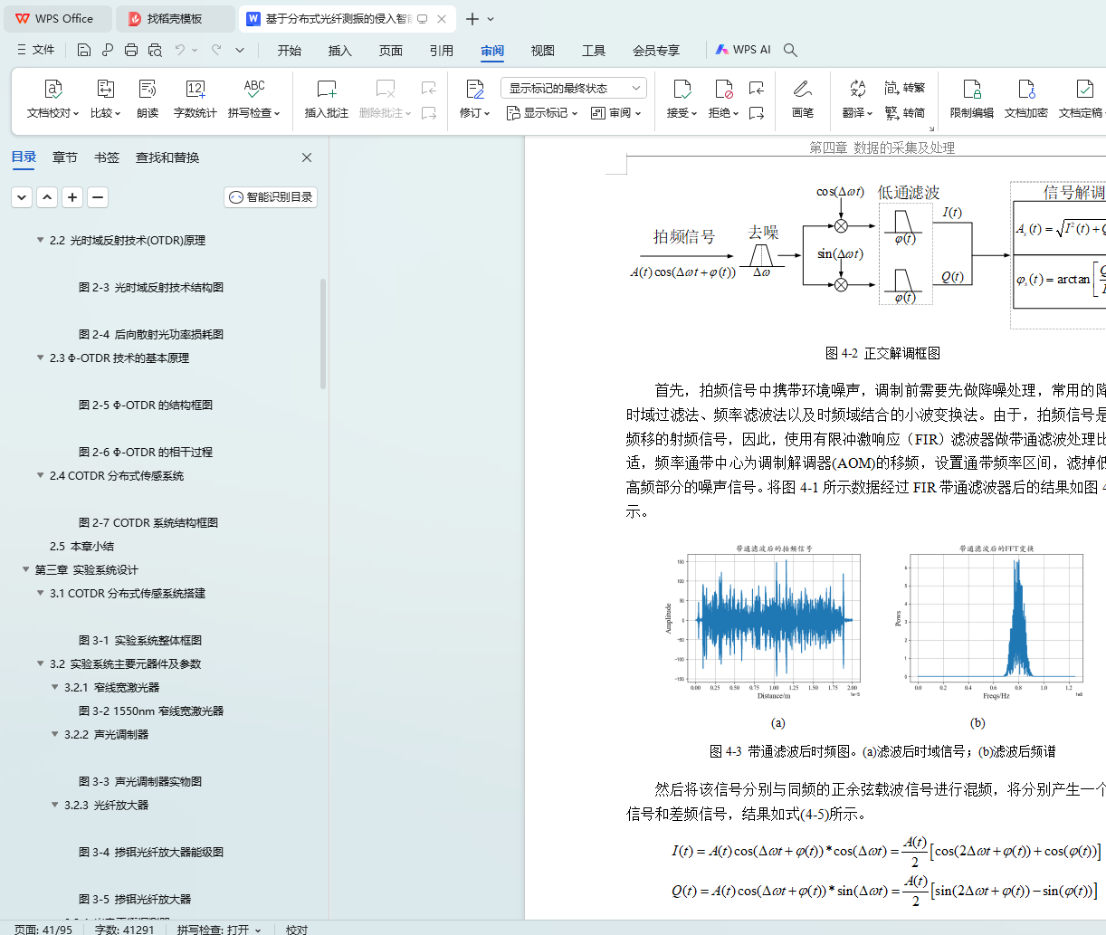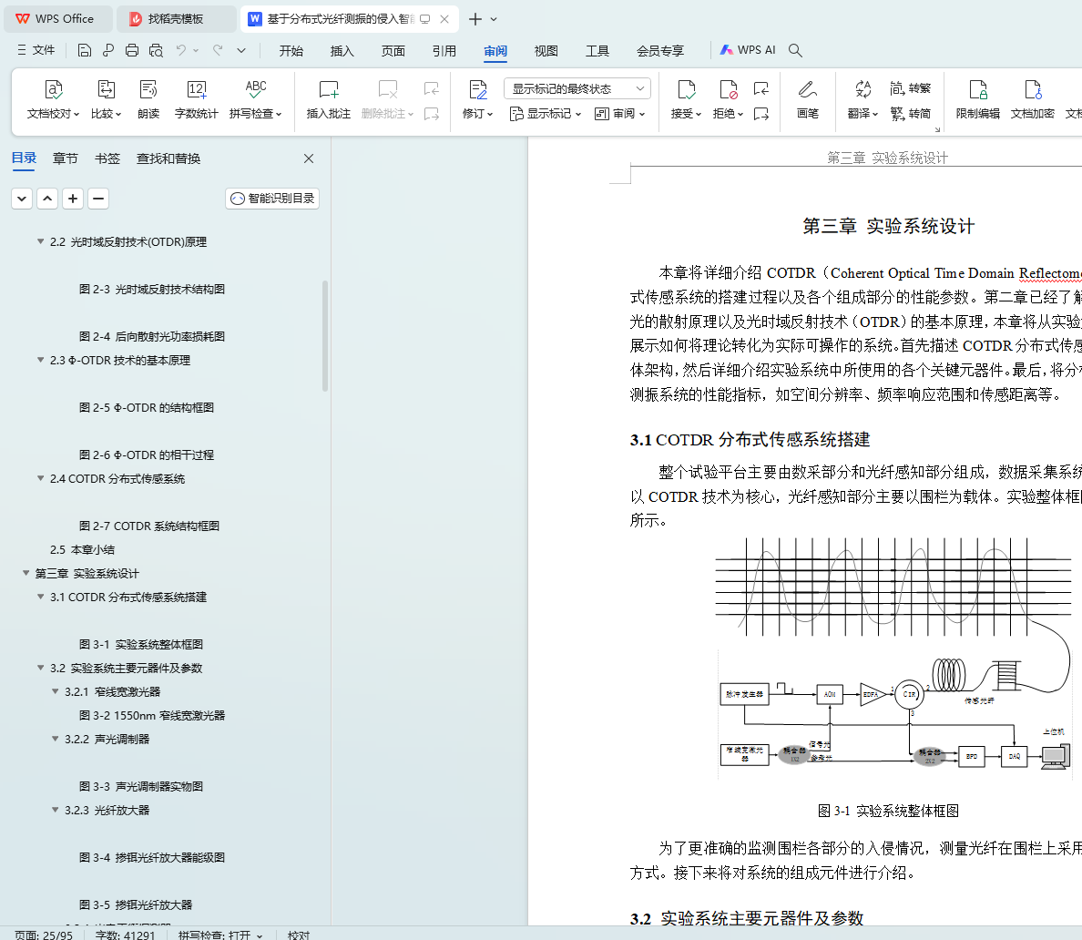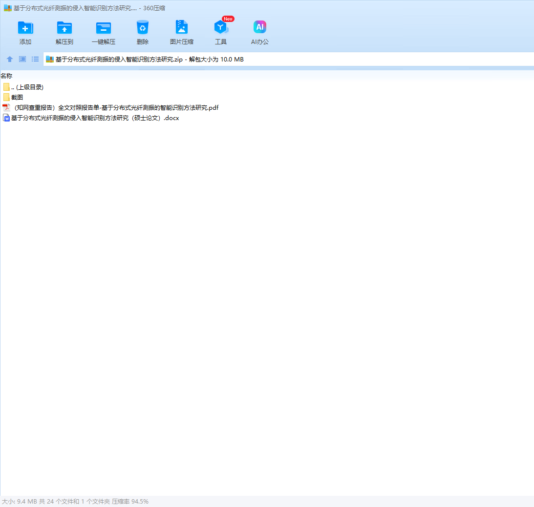 This thesis aims to discuss the application of distributed fiber optic vibration detection technology in fence security monitoring. Firstly, the research background of distributed optical fiber sensing technology and its importance in the field of security monitoring are introduced. Then, the theoretical basis of distributed fiber vibration detection is analyzed, and the development and improvement of optical time-domain reflectometry (OTDR) technology are introduced, which lays a foundation for the follow-up research. Then, the COTDR distributed sensing system is designed and built, and its performance index is evaluated. In terms of data acquisition and processing, VMD-wavelet improved threshold function denoising and guided filter processing algorithms are proposed for optical fiber vibration data, and the efficacy of the proposed algorithm is validated through comparison with the cumulative average, moving average, wavelet threshold and wavelet improved threshold function denoising. In order to solve the problem of intelligent identification of intrusion events, the data of quiet disturbance, climbing disturbance, knocking disturbance, false disturbance and blowing disturbance were collected by using fence as the experimental site. The event labels were 0, 1, 2, 3 and 4, and a total of 3108 sample data were collected. A neural network recognition algorithm based on BP+LightGBM is proposed and compared with the single LightGBM and BP neural network models. For the same data set, the prediction accuracy of LightGBM, BP neural network and BP+LightGBM neural network is 92.44%, 92.12% and 98.71%, respectively. In addition, the recognition accuracy of the LightGBM and BP neural network models for event 1 is only 71.0% and 86.3%, and the recognition accuracy of the BP+LightGBM neural network model for event 1 is 96.9%. The experimental results show that the proposed algorithm not only has higher recognition accuracy, but also can effectively improve the prediction unbalance of LightGBM and BP neural network models for various events.