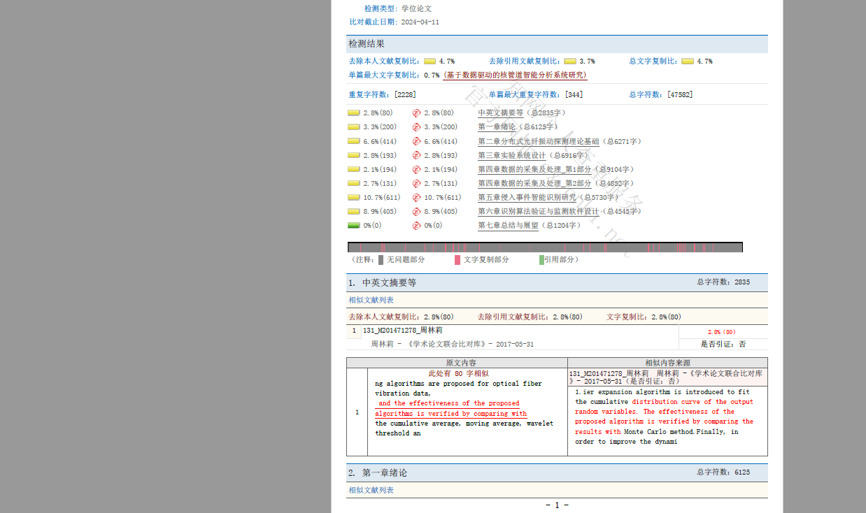 本文旨在探讨分布式光纤振动探测技术在围栏安防监控中的应用。首先,介绍了分布式光纤传感技术的研究背景及其在安防监控领域中的重要性。随后,通过对分布式光纤振动探测的理论基础进行解析,主要介绍了光纤中光的几种散射现象和光时域反射技术的发展和改进,为后续研究奠定了基础。然后,设计并搭建了COTDR分布式传感系统,并评估了其性能指标。在数据的采集及处理方面,针对光纤振动数据提出了VMD-小波改进阈值函数降噪以及导向滤波处理算法,并通过和累加平均、移动平均、小波阈值降噪、小波改进阈值函数降噪进行效果对比,验证了本文所提出的算法的有效性。针对侵入事件智能识别问题,以围栏作为实验场地,采集了安静、攀爬、敲击、虚假扰动和吹风扰动五种扰动事件数据,事件标签分别为0、1、2、3、4,共3108个样本数据。提出了基于BP+LightGBM的神经网络识别算法,并和单独的LightGBM、BP神经网络模型进行了对比实验。针对同一数据集,LightGBM、BP神经网络和BP+LightGBM神经网络识别模型的预测准确率分别为92.44%、92.12%、98.71%。并且,LightGBM、BP神经网络模型对事件1的识别准确率只有71.0%和86.3%,BP+LightGBM神经网络识别模型对事件1的识别准确率为96.9%。实验结果表明,本文所提算法不仅具有更高的识别准确率,还能够有效改善LightGBM、BP神经网络模型对各类事件的预测不平衡性。