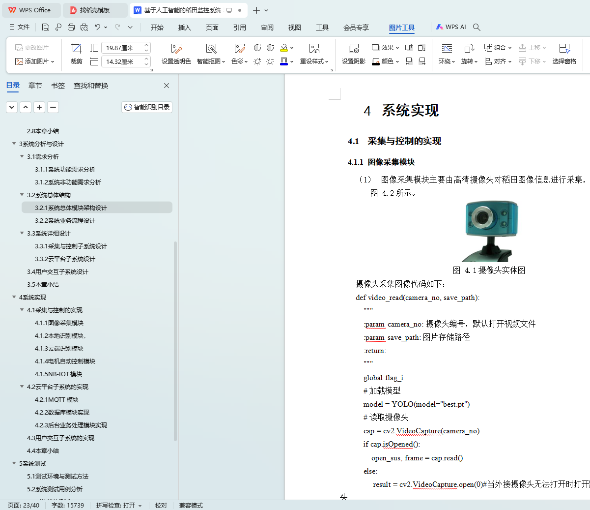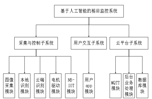 基于上述本文提出并设计一种基于人工智能的稻田监控系统,该系统旨在通过集成多种先进技术,如机器视觉、NB-IOT通信、MQTT技术和云平台技术等,来实现对稻田的实时监控和智能管理。系统的核心功能是通过摄像头模块采集图像,并利用机器视觉技术进行识别处理,以实现对鸟类的有效驱赶,从而保护农作物免受侵害。