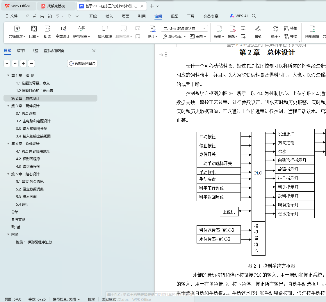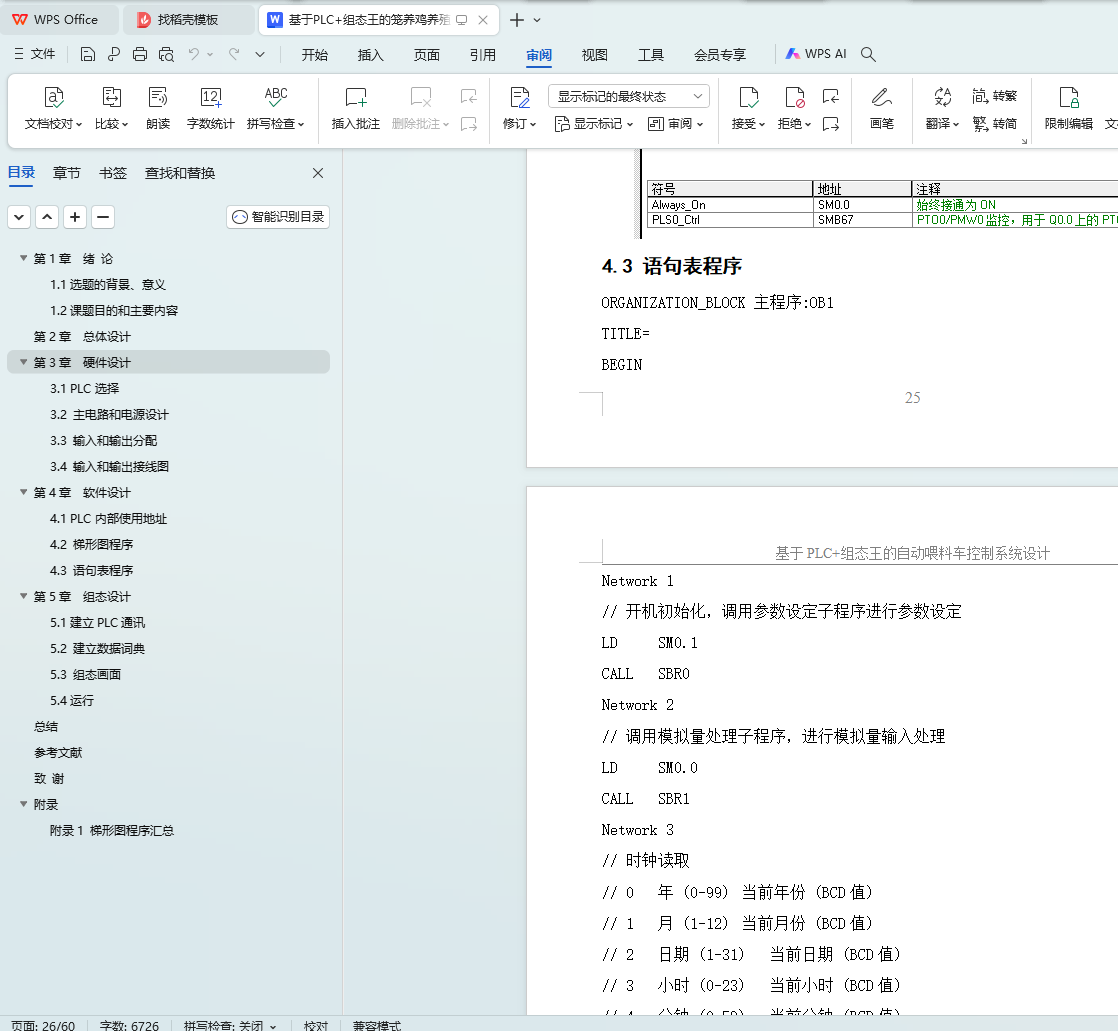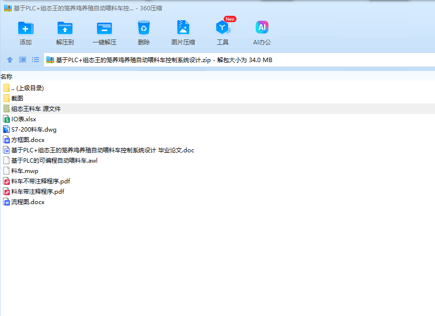 本课题是基于PLC的自动喂料车控制系统的设计,采用西门子的小型可编程控制器S7-200,外加步进驱动器和步进电机,组态王为上位机,设计了一套基于PLC的自动喂料车控制系统。通过设定饮水时间和定时,喂料时间和速度等,通过控制步进驱动运行距离和速度调节喂料多少和次数。通过分析控制要求,进行了总体设计,进行了硬件设计,包括主电路,PLC输入和输出,进行了软件设计包括梯形图和语句表程序,进行了组态设计,设计了监控画面,进行参数设定,实时和历史曲线,实时和历史报警,实时和历史报表等。系统具有自动和手动模式,使用灵活,可以通过组态王进行各种参数设定,有多种保护措施,使用安全。