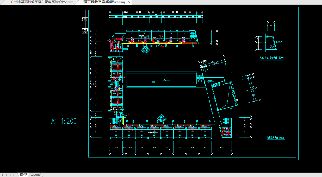 两个教师休息室。三层则为教室和办公室、2个绘图教室、1个多功能厅。四到六层为标准层,由教室、办公室、绘图教室组成。一到六层每层面积约为3000平方米。七层为顶层,面积较小,约1800平方米,只有教师办公室、展厅以及教师活动大会议室。
