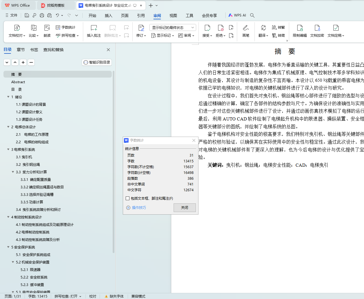 在设计过程中,我们首先对曳引机、钢丝绳等核心部件进行了细致的选型与设计,随后通过精确的计算,确定了各部件的结构参数与尺寸。为确保设计的准确性与实用性,我们进一步对这些关键机械部件进行了设计,并通过动画仿真技术模拟了电梯的运行状态。最后,利用AUTO CAD软件绘制了电梯起升机构中的限速器、操纵装置、安全钳、缓冲器等关键部分的图纸,并绘制了电梯系统的总图。
