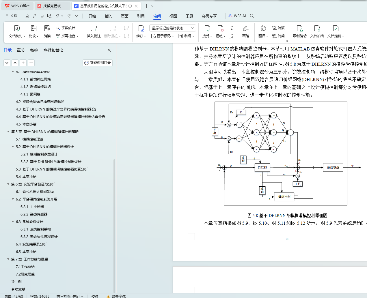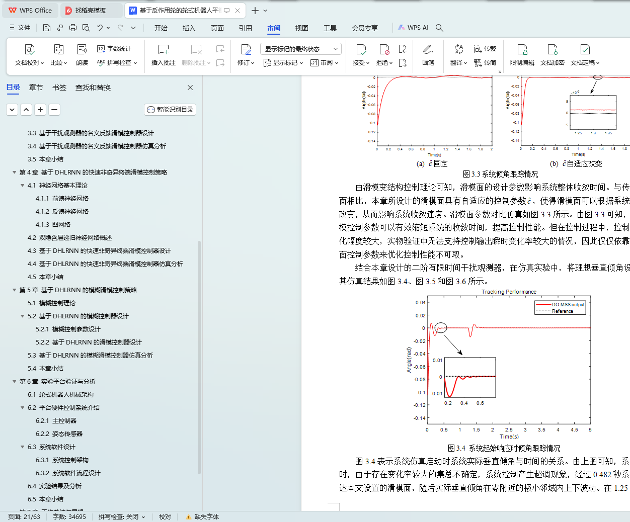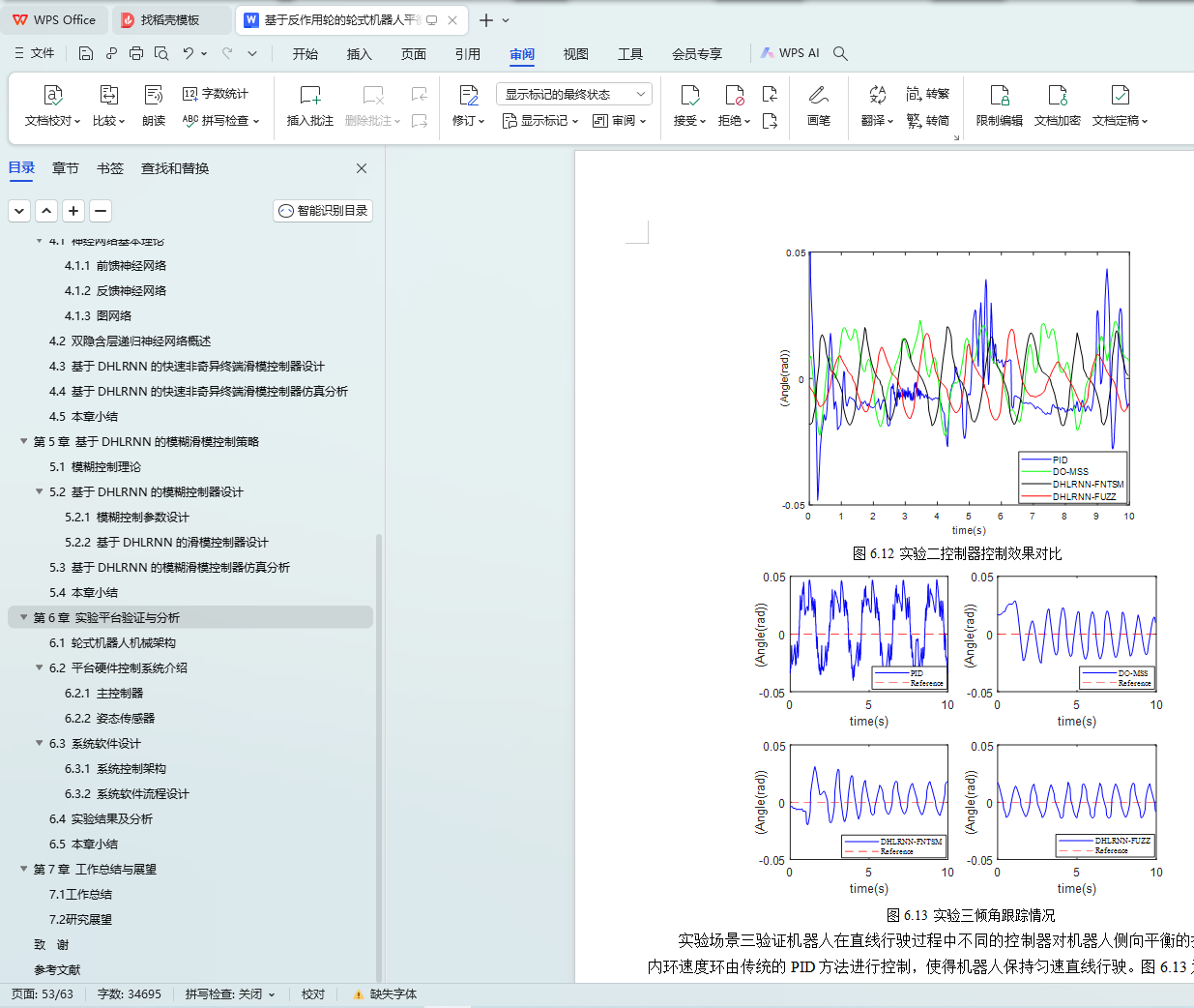 最后,本文使用李亚普诺夫函数对所设计控制器进行稳定性证明,并搭建MATLAB仿真环境验证控制器的控制性能。同时,使用STM32芯片、姿态传感器MPU6050、陀螺仪、显示屏等硬件搭建基于反作用轮的轮式机器人实测平台,根据实测结果,所设计的三种滑模控制器具有优越的控制效果,其中基于DHLRNN的模糊滑模控制器控制性能最佳,控制误差最小。