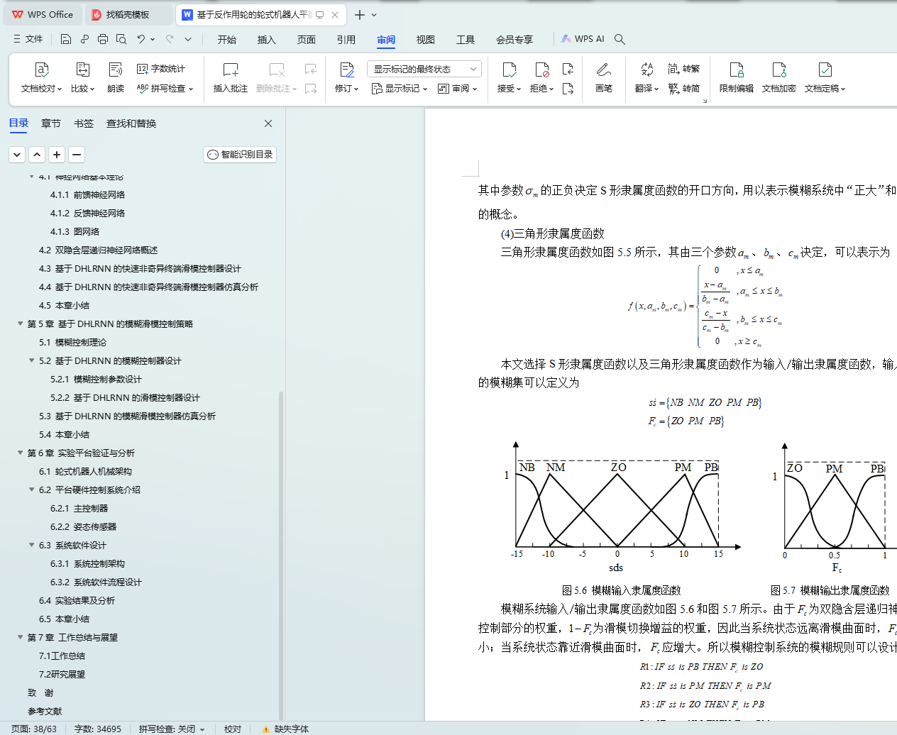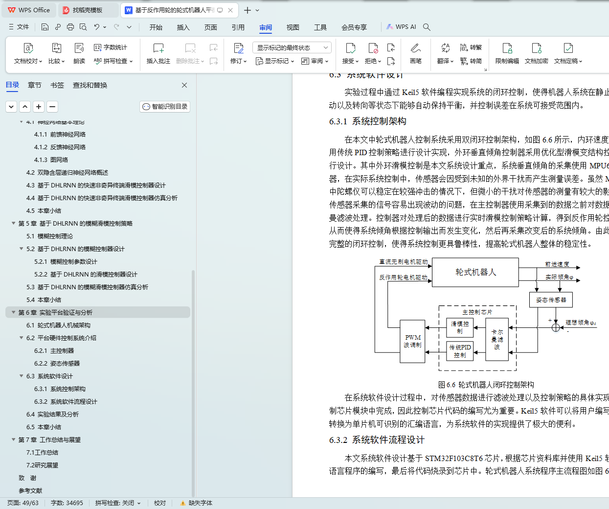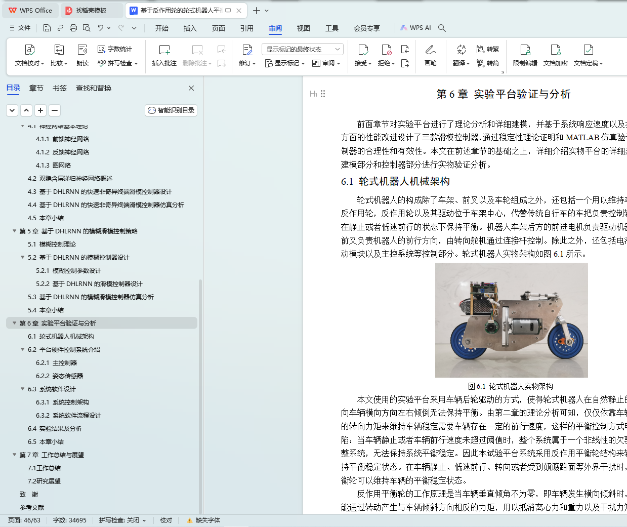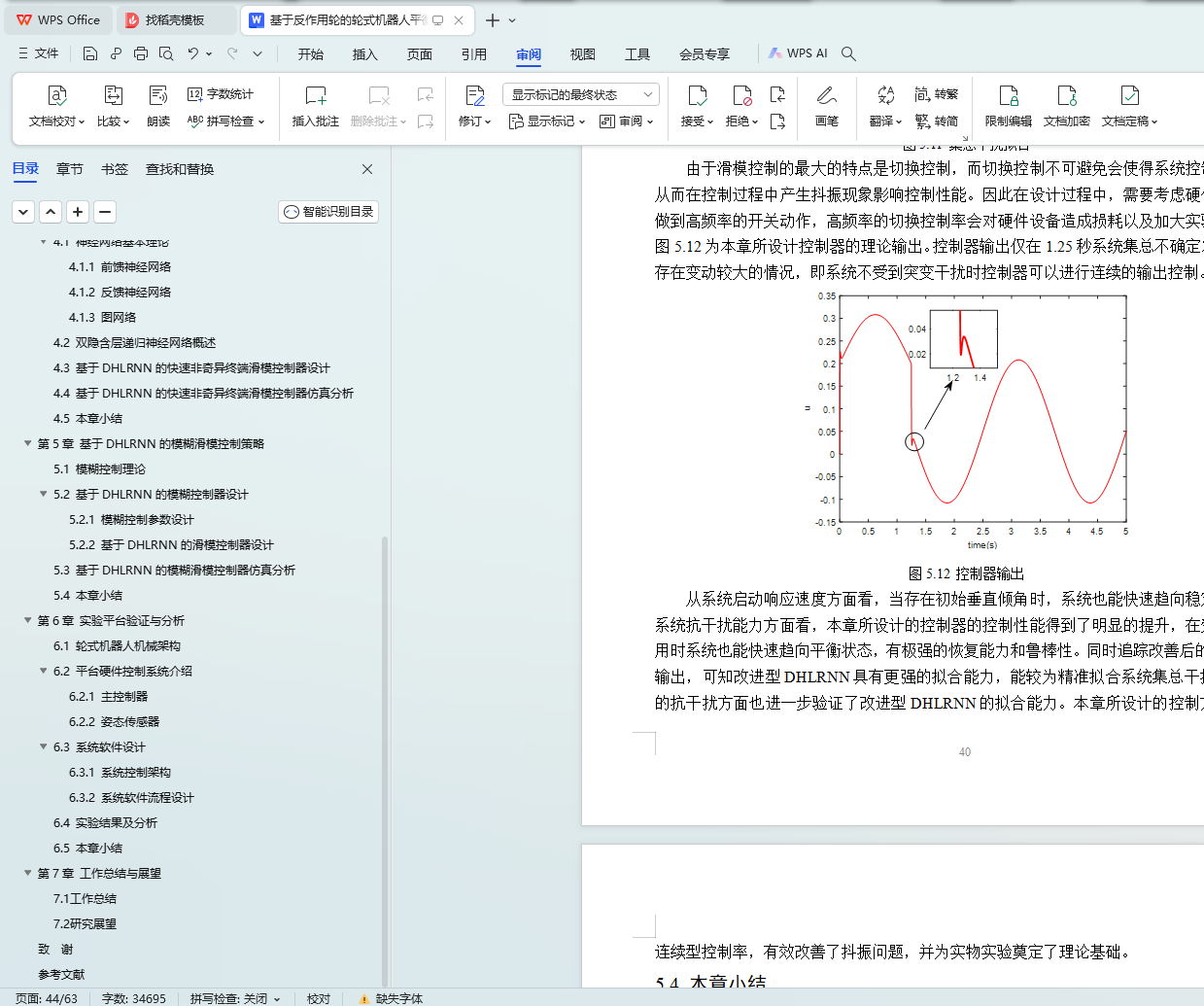 最后,本文使用李亚普诺夫函数对所设计控制器进行稳定性证明,并搭建MATLAB仿真环境验证控制器的控制性能。同时,使用STM32芯片、姿态传感器MPU6050、陀螺仪、显示屏等硬件搭建基于反作用轮的轮式机器人实测平台,根据实测结果,所设计的三种滑模控制器具有优越的控制效果,其中基于DHLRNN的模糊滑模控制器控制性能最佳,控制误差最小。