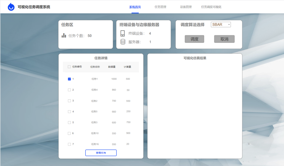 本文设计了完备的仿真实验对本文算法的调度性能进行全面评估,并进一步实现了可视化任务调度系统。实验结果表明本文提出的方法能够在满足能耗约束的前提下,有效降低系统的响应时间。本文实现的一系列方法和系统,能够应用在工业物联网和智慧城市等实际场景,对于提升系统能效、节省运营成本具有重要意义。