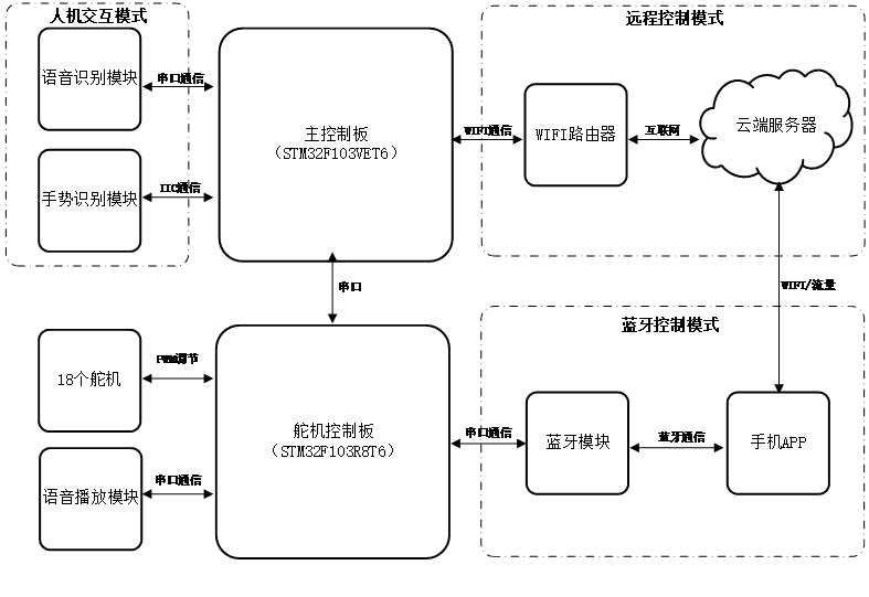 本设计主要是基于单片机的六足机器人控制系统设计,综合分析六足机器人的结构、步态和控制算法,结合云端服务器、WIFI技术、蓝牙技术、语音识别技术和手势识别技术进行多种控制模式的设计,并提出不同应用场景的不同构建方案。