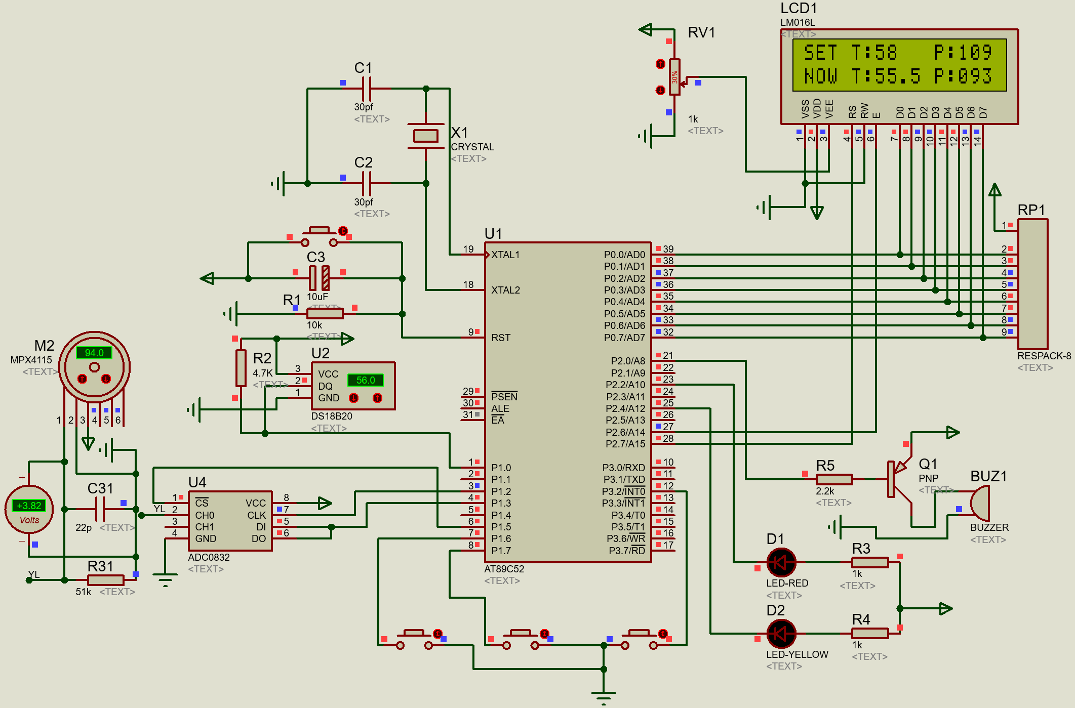 This system is the research and design of the boiler control system. With the continuous development of industry, the boiler control system needs further research, the current boiler control system can not accurately detect the boiler interior, such as temperature, pressure and other parameters for unified verification. Only through the boiler pressure or temperature of a certain value to check, will not carry out alarm processing. In view of this phenomenon, a boiler control system which can realize temperature and pressure alarm and is integrated is designed. It can be realized that the temperature and pressure are worth setting, and when the system exceeds the set value, the alarm is given through acoustics and optics, through this monitoring can be achieved to save energy and prevent the occurrence of a good accident control system. Through the analysis and study of the system, the system chooses MPX4115 sensor, DS18B20 temperature sensor, STC89C52 single chip computer, LCD1602 liquid crystal display as the core components of the system, the system hardware circuit building software programming. Through the PROTEUS simulation software through the temperature and pressure test, we can find that the designed control system can meet the design requirements, achieve the desired effect to complete the system design. In the design process, considering the system's working environment requirements and the system's stability and interference ability, the system has high popularization significance and use value.