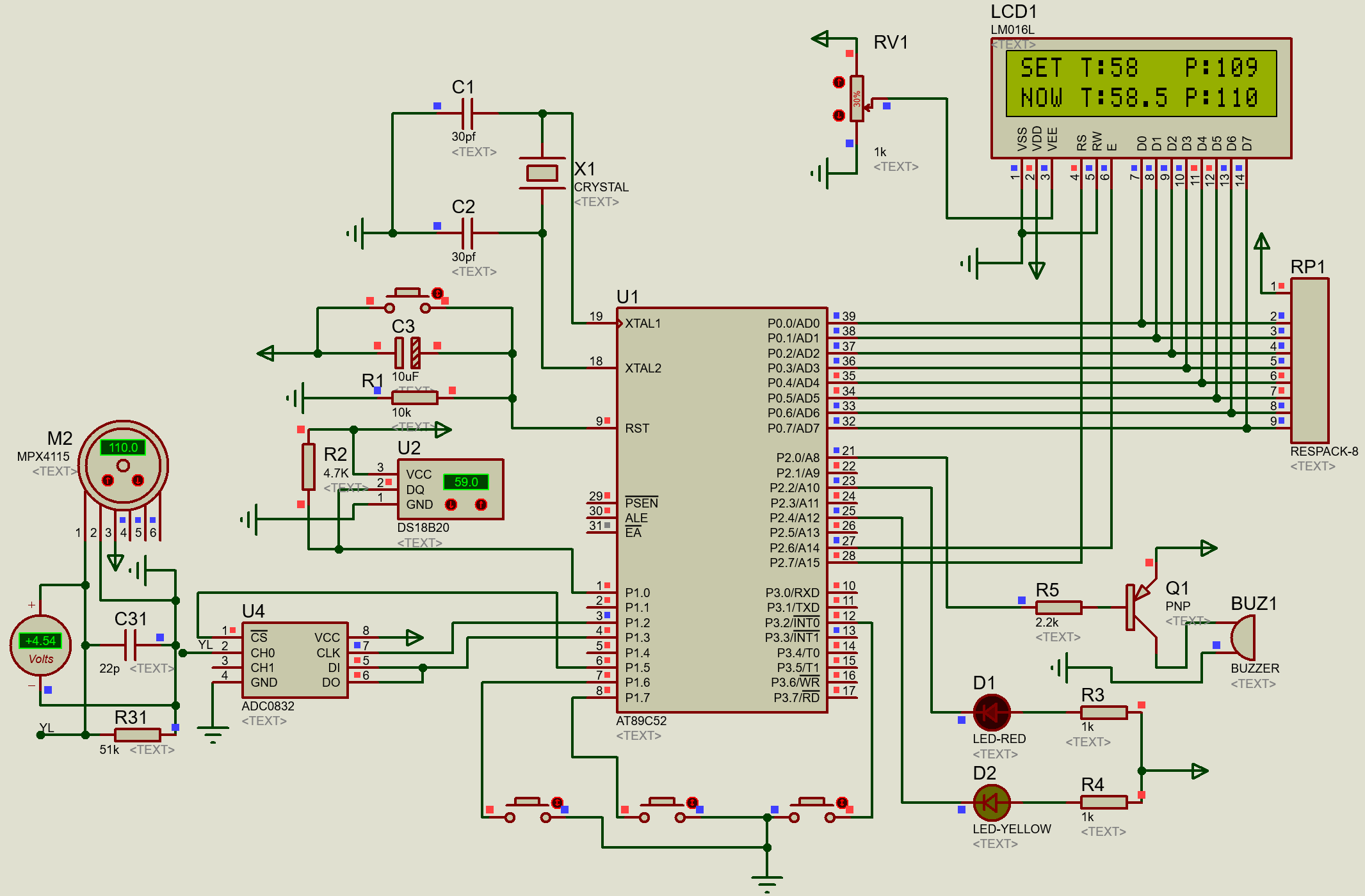 本系统通过对系统的分析研究,选择使用MPX4115传感器、ADC0832模数转换器、DS18B20温度传感器,STC89C52单片机、LCD1602液晶显示器作为本次系统的核心元器件,对系统的硬件电路搭建软件程序编写。通过PROTEUS仿真软件通过对温度和气压的测试,可以发现所设计的控制系统能够满足设计要求,达到了预期的效果完成系统设计。