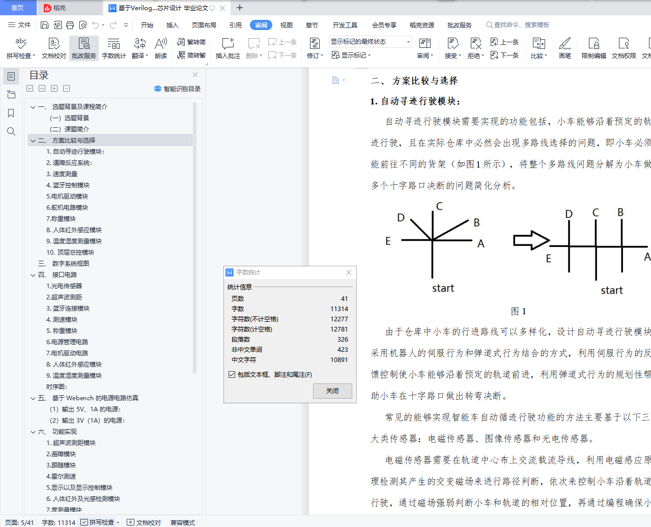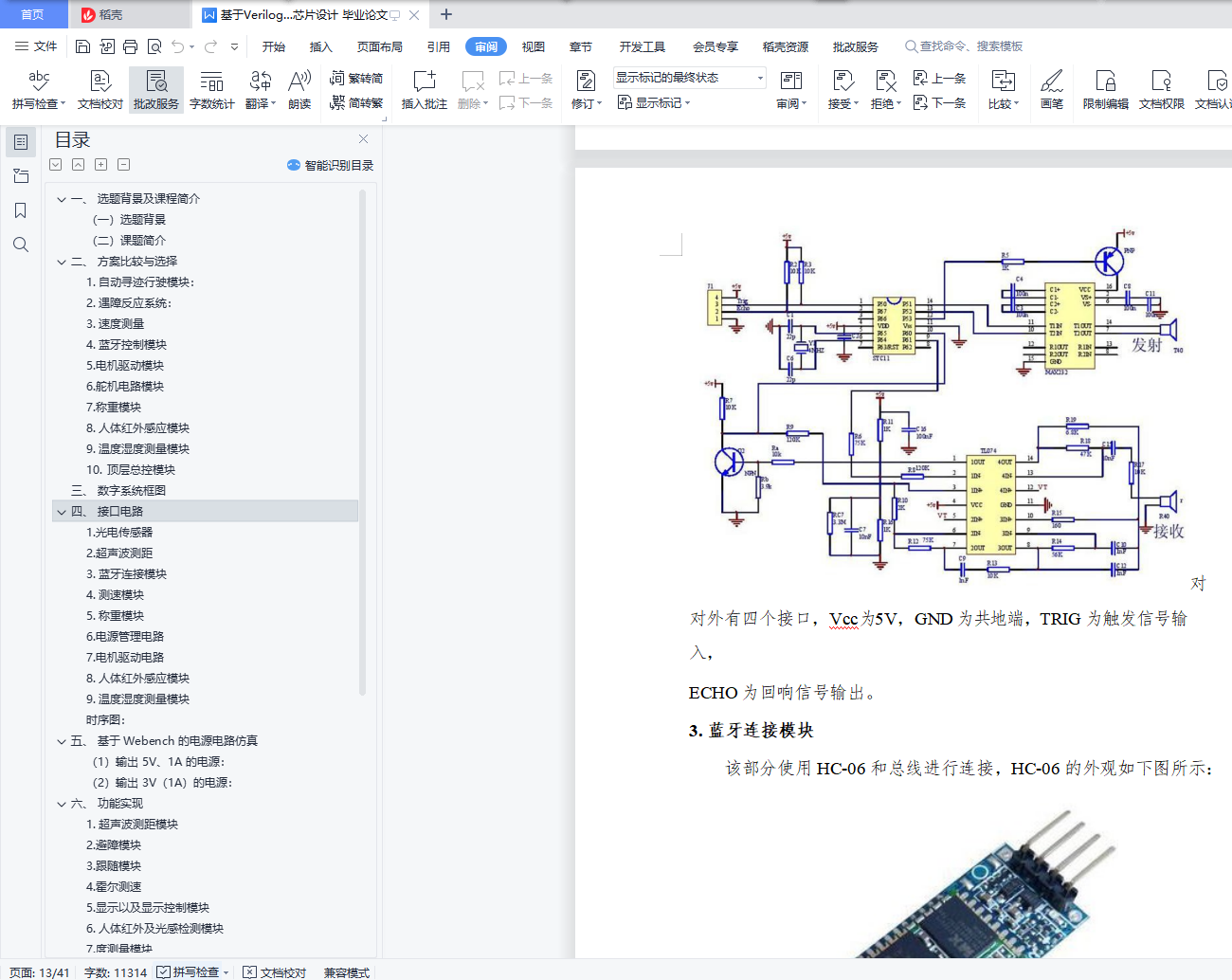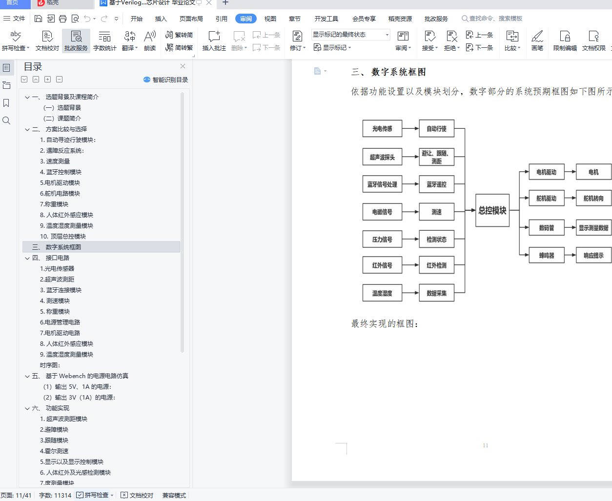 目录一、 选题背景及课程简介 3(一)选题背景 3(二)课题简介 3二、 方案比较与选择 61. 自动寻迹行驶模块: 62. 遇障反应系统: 83. 速度测量 94. 蓝牙控制模块 105. 电机驱动模块 116. 舵机电路模块 107. 称重模块 108. 人体红外感应模块 109. 温度湿度测量模块 1010. 顶层总控模块 10三、 数字系统框图 11四、 接口电路 121. 光电传感器 122. 超声波测距 133. 蓝牙连接模块 154. 测速模块 175. 称重模块 196. 电源管理电路 217. 电机驱动电路 228. 人体红外感应模块 209. 温度湿度测量模块 21时序图: 22五、 基于 Webench 的电源电路仿真 22(1)输出 5V、1A 的电源: 22(2)输出 3V(1A)的电源: 23六、 功能实现 241. 超声波测距模块 242. 避障模块 263. 跟随模块 274. 霍尔测速 275. 显示以及显示控制模块 286. 人体红外及光感检测模块 287. 度测量模块 298. 压力传感称重模块(基于 Arduino) 309. 基于 Arduino 的 LED 显示 3110. 基于红外发射和接收管的循迹功能 3211. 基于 LM2940 和 LM2596 的电源管理 3212. 基于 HC-05 的蓝牙遥控 3313. 基于 BTS7960 的电机驱动 3314. 电机模块 3415. 舵机模块 34七.问题及解决方案 35八、收获与反思 371.团队协作的重要性 372. 项目从设计到实现 383. Verilog 代码的模块化 384. PCB 制作 395. 电机和舵机的驱动 396. 蓝牙的连接和调试 40参考文献: 41[D]. 太原:太原理工大学.2015.06 41一、 选题背景及课程简介(一)选题背景近年来,随着物流业的迅速发展,与之相匹配的智能仓库也越来越受各大物流企业以及电商的青睐,特别是以阿里和京东为代表的电商巨头,更是把智能仓库作为自己的核心竞争力之一。而仓库机器人则是智能仓库最重要的组成部分,近年来有大量的巨头企业和初创企业加入到了仓库机器人的研发当中。因此,在经过一番讨论和比较之后,我们选择“仓库机器人”这一题目,以智能仓库为应用场景,以移动机器人为载体,使用可编程器件 FPGA 作为移动机器人的控制系统,通过外接多路传感器获取信息,模型真实场景和情形,设计和实现仓库机器人的一些基本的功能。(二)课题简介在设计移动机器人的功能时,我们充分考虑实际场景和应用当中仓库机器人应该具有的基本功能和可能会遇到的情形及对应的解决方案,同时考虑成本以及可实现性,总结为以下几点:(1)自动行驶:模拟仓库机器人在预定轨道自动行使,对应移动机器人能够按照预先搭建设计好的轨道自动行驶,并根据轨道调整前进方向。(2)“十字路口”自动决策:模拟在行使过程当中,遇到轨道交叉点时,仓库机器人能够按照预先设定的路线做出正确的轨道转向。(3)“防止追尾”功能:在后车遇到前车时停止前进,等待前车走出一段距离后,再继续行驶。(4)避让障碍物:在无轨道处行驶时,如果前方出现障碍物,移动机器人能够自动避让,防止碰撞。(5)跟随前进:仓库机器人能够跟随仓库管理员前进,运输货物。(6)称重模块:该模块用于测量小车上搭载的货物的重量。(7)蓝牙连接:管理员在手机端对仓库机器人的移动进行控制。(8)人体红外感应模块:考虑到仓库机器人在仓库来回行走,这样对于参考机器人有一定的危险,因此加入人体红外感应模块,当有行人靠近小车时,小车能够给予回应,目前以蜂鸣器作为回应的载体。(9)温度湿度测量模块:考虑到实际智能仓库对温度湿度要求严苛,本模块实现对仓库温度湿度的测量。(10)数据测量:A.距离测量:检测移动机器人与前方的障碍物或者前车的距离;B.速度检测:检测移动机器人移动的速度,也能控制速度在不同的档位;C.对(6)称重模块采集的数据进行分析计算,得出载物重量;D.温度湿度测量:实现对仓库温度湿度的测量。E.A\B\C\D 的检测到的数据,能够在 FPGA 数码管进行显示;。