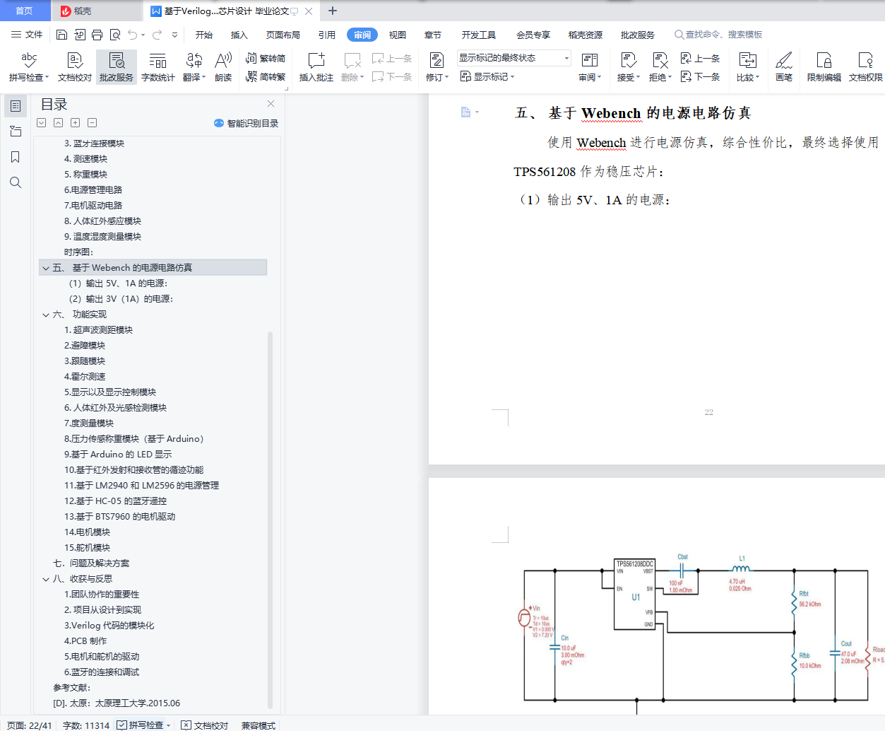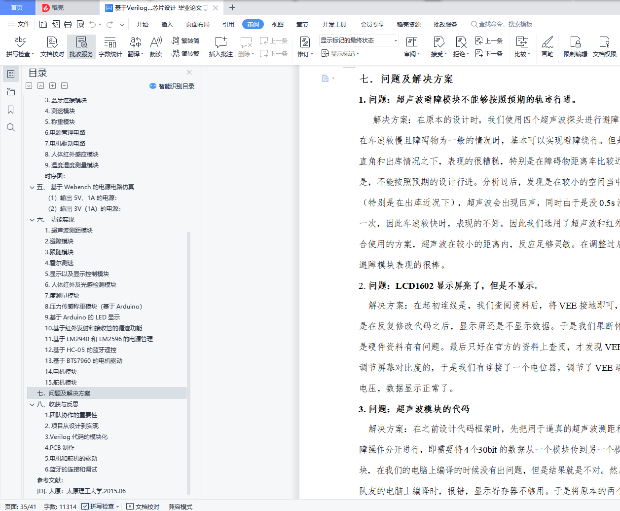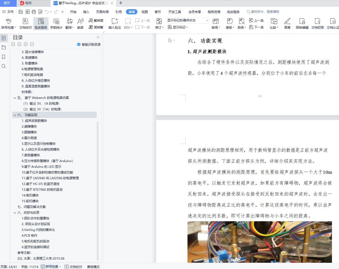 目录一、 选题背景及课程简介 3(一)选题背景 3(二)课题简介 3二、 方案比较与选择 61. 自动寻迹行驶模块: 62. 遇障反应系统: 83. 速度测量 94. 蓝牙控制模块 105. 电机驱动模块 116. 舵机电路模块 107. 称重模块 108. 人体红外感应模块 109. 温度湿度测量模块 1010. 顶层总控模块 10三、 数字系统框图 11四、 接口电路 121. 光电传感器 122. 超声波测距 133. 蓝牙连接模块 154. 测速模块 175. 称重模块 196. 电源管理电路 217. 电机驱动电路 228. 人体红外感应模块 209. 温度湿度测量模块 21时序图: 22五、 基于 Webench 的电源电路仿真 22(1)输出 5V、1A 的电源: 22(2)输出 3V(1A)的电源: 23六、 功能实现 241. 超声波测距模块 242. 避障模块 263. 跟随模块 274. 霍尔测速 275. 显示以及显示控制模块 286. 人体红外及光感检测模块 287. 度测量模块 298. 压力传感称重模块(基于 Arduino) 309. 基于 Arduino 的 LED 显示 3110. 基于红外发射和接收管的循迹功能 3211. 基于 LM2940 和 LM2596 的电源管理 3212. 基于 HC-05 的蓝牙遥控 3313. 基于 BTS7960 的电机驱动 3314. 电机模块 3415. 舵机模块 34七.问题及解决方案 35八、收获与反思 371.团队协作的重要性 372. 项目从设计到实现 383. Verilog 代码的模块化 384. PCB 制作 395. 电机和舵机的驱动 396. 蓝牙的连接和调试 40参考文献: 41[D]. 太原:太原理工大学.2015.06 41一、 选题背景及课程简介(一)选题背景近年来,随着物流业的迅速发展,与之相匹配的智能仓库也越来越受各大物流企业以及电商的青睐,特别是以阿里和京东为代表的电商巨头,更是把智能仓库作为自己的核心竞争力之一。而仓库机器人则是智能仓库最重要的组成部分,近年来有大量的巨头企业和初创企业加入到了仓库机器人的研发当中。因此,在经过一番讨论和比较之后,我们选择“仓库机器人”这一题目,以智能仓库为应用场景,以移动机器人为载体,使用可编程器件 FPGA 作为移动机器人的控制系统,通过外接多路传感器获取信息,模型真实场景和情形,设计和实现仓库机器人的一些基本的功能。(二)课题简介在设计移动机器人的功能时,我们充分考虑实际场景和应用当中仓库机器人应该具有的基本功能和可能会遇到的情形及对应的解决方案,同时考虑成本以及可实现性,总结为以下几点:(1)自动行驶:模拟仓库机器人在预定轨道自动行使,对应移动机器人能够按照预先搭建设计好的轨道自动行驶,并根据轨道调整前进方向。(2)“十字路口”自动决策:模拟在行使过程当中,遇到轨道交叉点时,仓库机器人能够按照预先设定的路线做出正确的轨道转向。(3)“防止追尾”功能:在后车遇到前车时停止前进,等待前车走出一段距离后,再继续行驶。(4)避让障碍物:在无轨道处行驶时,如果前方出现障碍物,移动机器人能够自动避让,防止碰撞。(5)跟随前进:仓库机器人能够跟随仓库管理员前进,运输货物。(6)称重模块:该模块用于测量小车上搭载的货物的重量。(7)蓝牙连接:管理员在手机端对仓库机器人的移动进行控制。(8)人体红外感应模块:考虑到仓库机器人在仓库来回行走,这样对于参考机器人有一定的危险,因此加入人体红外感应模块,当有行人靠近小车时,小车能够给予回应,目前以蜂鸣器作为回应的载体。(9)温度湿度测量模块:考虑到实际智能仓库对温度湿度要求严苛,本模块实现对仓库温度湿度的测量。(10)数据测量:A.距离测量:检测移动机器人与前方的障碍物或者前车的距离;B.速度检测:检测移动机器人移动的速度,也能控制速度在不同的档位;C.对(6)称重模块采集的数据进行分析计算,得出载物重量;D.温度湿度测量:实现对仓库温度湿度的测量。E.A\B\C\D 的检测到的数据,能够在 FPGA 数码管进行显示;。
