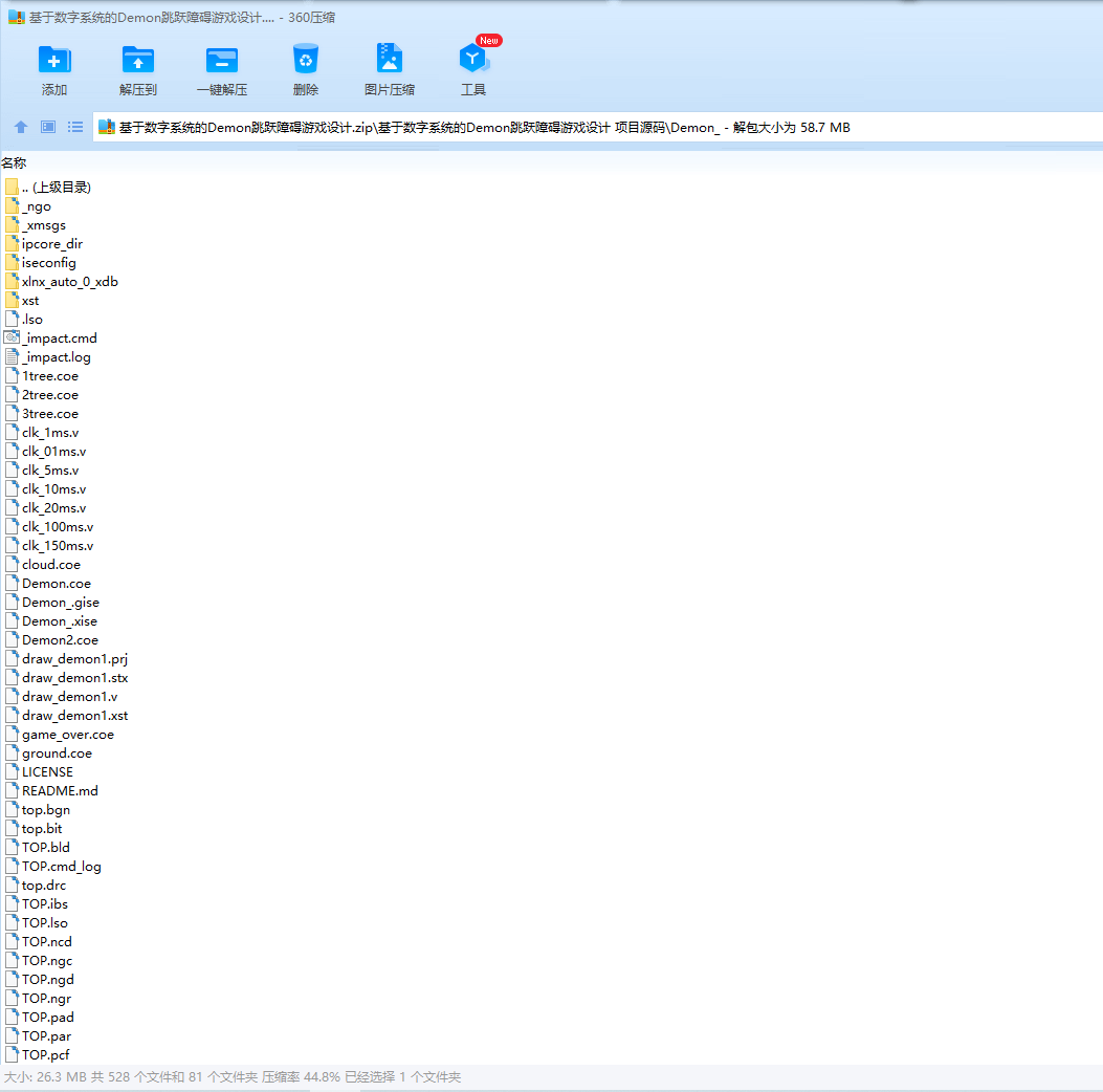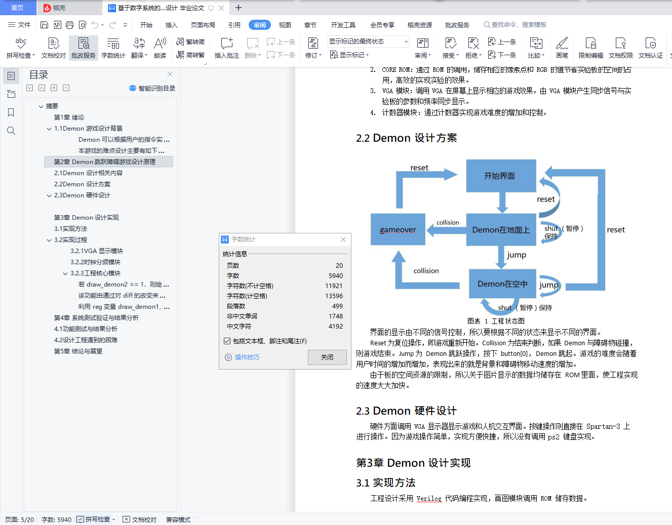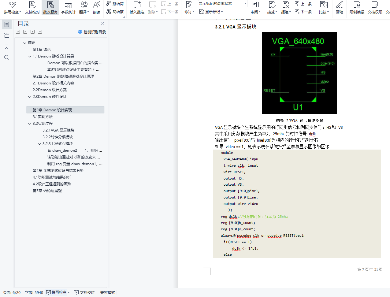 摘要基于数字系统的 Demon 小游戏是指玩家通过对 button 的操作实现对 Demon 的控制, 跳跃障碍的游戏。通过调用 VGA 显示屏来显示游戏界面。游戏操作简单快捷,容易掌握, 游戏画面精细生动。工程使用时序状态机模型,采用层次化、模块化方法,使用 VerilogHDL 语言编写程序,基于 Xilinx Spartan-3 实验平台实现工程。本设计能够实现简单的人机交互功能,并且游戏难度会随着时间的推移而增加,来提高游戏的趣味性和挑战性。关键词:VGA 显示 FPGA Verilog 语言 Demon 跳跃障碍目录目录摘要 ii目录 3图目录 4第 1 章 绪论 51.1Demon 游戏设计背景 51.2国内外现况分析 51.3主要内容和难点 5第 2 章 Demon 跳跃障碍游戏设计原理 52.1Demon 设计相关内容 52.2Demon 设计方案 62.3Demon 硬件设计 6第 3 章 Demon 设计实现 63.1实现方法 63.2实现过程 73.2.1VGA 显示模块 73.2.2时钟分频模块 83.2.3工程核心模块 9第 4 章 系统测试验证与结果分析 184.1功能测试与结果分析 184.2设计工程遇到的困难 20第 5 章 结论与展望 20
