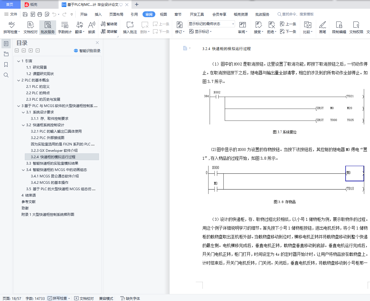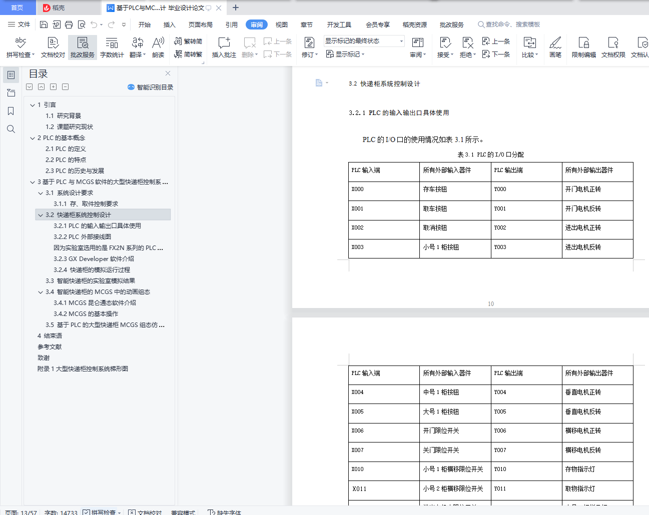 目 录1 引言 11.1 研究背景 11.2 课题研究现状 12 PLC的基本概念 32.1 PLC的定义 32.2 PLC的特点 32.3 PLC的历史与发展 43基于PLC与MCGS软件的大型快递柜控制系统设计 73.1 系统设计要求 73.1.1 存、取件控制要求 73.2 快递柜系统控制设计 83.2.1 PLC的输入输出口具体使用 83.2.2 PLC外部接线图 83.2.3 GX Developer软件介绍 103.2.4 快递柜的模拟运行过程 123.3 智能快递柜的实验室模拟结果 143.4 智能快递柜的MCGS中的动画组态 203.4.1 MCGS昆仑通态软件介绍 203.4.2 MCGS的基本操作 213.5 基于PLC的大型快递柜MCGS组态仿真小结 394结束语 40参考文献 40致谢 42附录1 大型快递柜控制系统梯形图 43基于PLC与组态软件的大型快递柜控制系统设计摘要:本文主要介绍了课题的背景、国内外研究现状、研究的目的与意义、可编程控制器(PLC)的基本概念、工作原理、发展过程及其在工业生产中的地位,针对现实生活中各小区住户快递越来越频繁的实际情况设计了快递柜。简单地介绍了快递柜的用途、发展和运行模式,介绍了组态软件的特点和使用方法,详细论述了控制系统的总体框架、硬件结构。本文主要利用三菱FX2N系列的PLC控制快递柜,明确快递柜的控制要求,设计符合要求的解决方案,对输入输出节点合理分配,编写梯形图,利用已有的实验仪器调试控制系统,并完成PLC与组态软件之间的通讯,达到使用PLC外部硬件开关和梯形图来控制组态软件中的模拟动画的预期目标。根据最终结果分析,用PLC设计出来的控制系统具有稳定、可靠、便捷的特点。关键词:PLC;快递柜控制;梯形图;组态仿真Design of Control System for Large Express Cabinet Based on PLC and Configuration SoftwareAbstract: This paper mainly introduces the background of the subject, the status quo of research at home and abroad, the purpose and significance of the study, the basic concept, working principle, development process and status of programmable logic controller (PLC) in industrial production. Household delivery more and more frequent the actual situation and the design of the express cabinet. This paper introduces the use, development and operation mode of the express cabinet, introduces the characteristics and usage of the configuration software, and discusses the overall framework and hardware structure of the control system in detail. This article mainly uses the Mitsubishi FX2N series PLC to control the express cabinet, expressly expresses the control request of the express delivery cabinet, designs the meet the request solution, the reasonable allocation to the input and output section, prepares the T chart, uses the existing experimental instrument to debug the control system, and completes PLC and configuration software communication between the use of PLC external hardware switch to control the configuration software simulation animation in the expected target. According to the final results analysis, with the PLC design out of the control system compared to more stable, reliable and convenient.Key words: PLC; express cabinet control; ladder diagram; configuration simulation