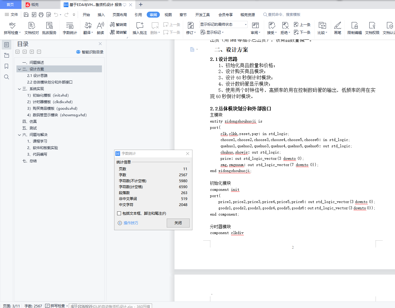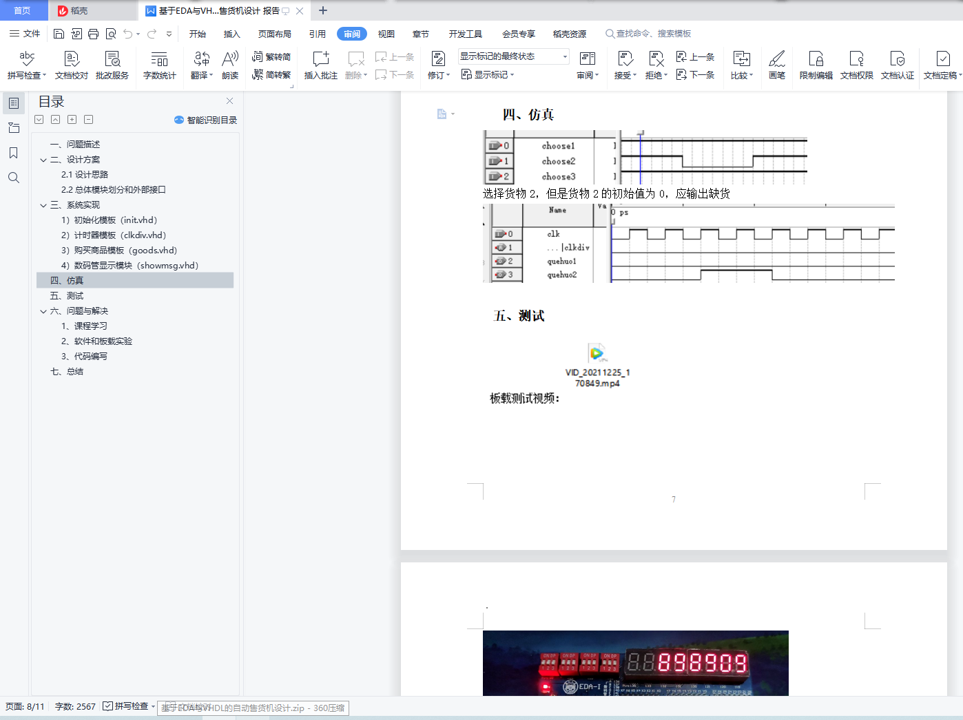目录一、 问题描述 2二、 设计方案 22.1设计思路 22.2总体模块划分和外部接口 2三、 系统实现 31)初始化模板(init.vhd) 32)计时器模板(clkdiv.vhd) 33) 购买商品模板(goods.vhd) 54) 数码管显示模块(showmsg.vhd) 6四、仿真 7五、测试 7六、 问题与解决 101、 课程学习 102、软件和板载实验 103、代码编写 10七、 总结 10目录1.问题描述;・・・・・・・・・・・・・・・・・・・・・・・・・・・・・22.设计方案;・・・・・・・・・・・・・・・・・・・・・・・・・・・・・23.系统实现(各个具体模块实现原理描述,原理图说明,代码说明);・・・・34.仿真(部分功能的仿真设计和结果分析);・・・・・・・・・・・・・・・75.测试(板载测试的过程和结果分析);・・・・・・・・・・・・・・・・・76.问题和解决;・・・・・・・・・・・・・・・・・・・・・・・・・・・・107.总结(总结主要工作内容和结果,描述设计心得和体会)・・・・・・・・・10一、问题描述自动售货机设计1)6个数码管代表六种商品,每种商品数量0-9;2)6个按键代表对应商品的选择按钮,按下表示选择购买,只有该商品数量大于0是可以购买,为零时提示缺货,用一个LED灯指示;3)使用一组LED显示选中商品的价格,并开始计时(用剩下两个数码管显示倒计时),60秒内没有收到成功付款(扫码付款)信号,则取消该交易,恢复成选择购买前状态;4)用剩下按键或者拨码开关给出成功付款信号,收到该信号,倒计时结束,并出货(用led等指示已出货),该商品数量减一。二、设计方案2.1设计思路1、初始化商品数量和价格;2、设计购买商品模块;3、设计60秒倒计时模块;4、设计数码管显示模块;5、使用两个时钟信号,高频率的用在控制数码管的输出,低频率的用在实现60秒倒计时模块。