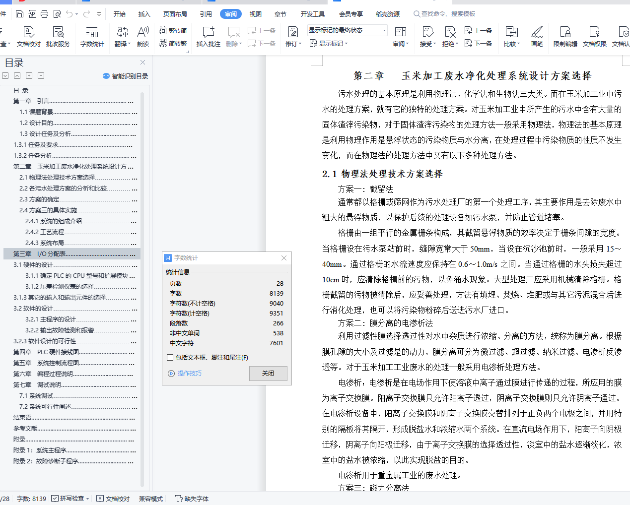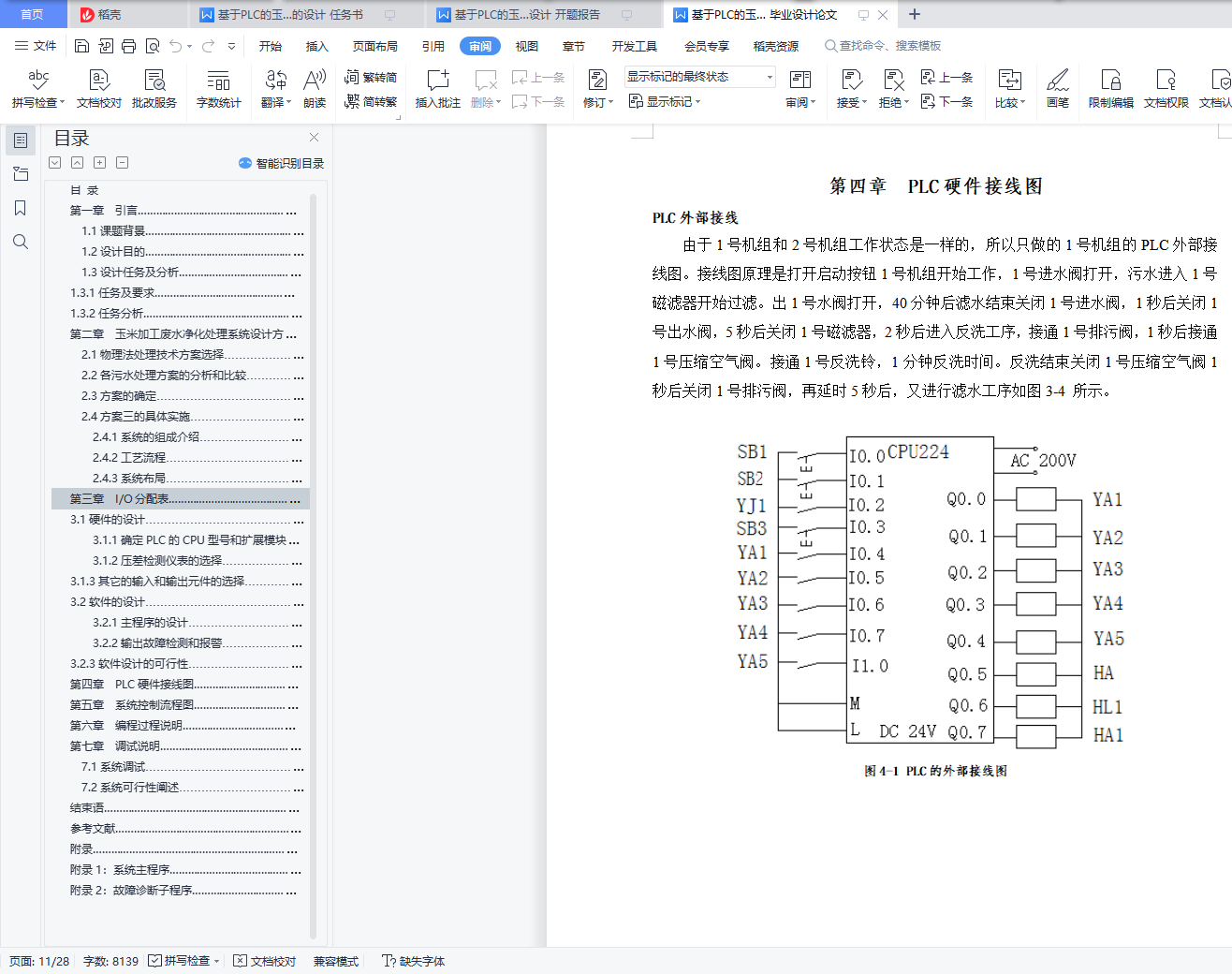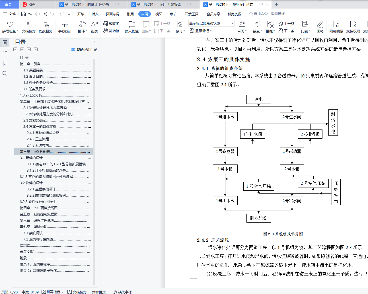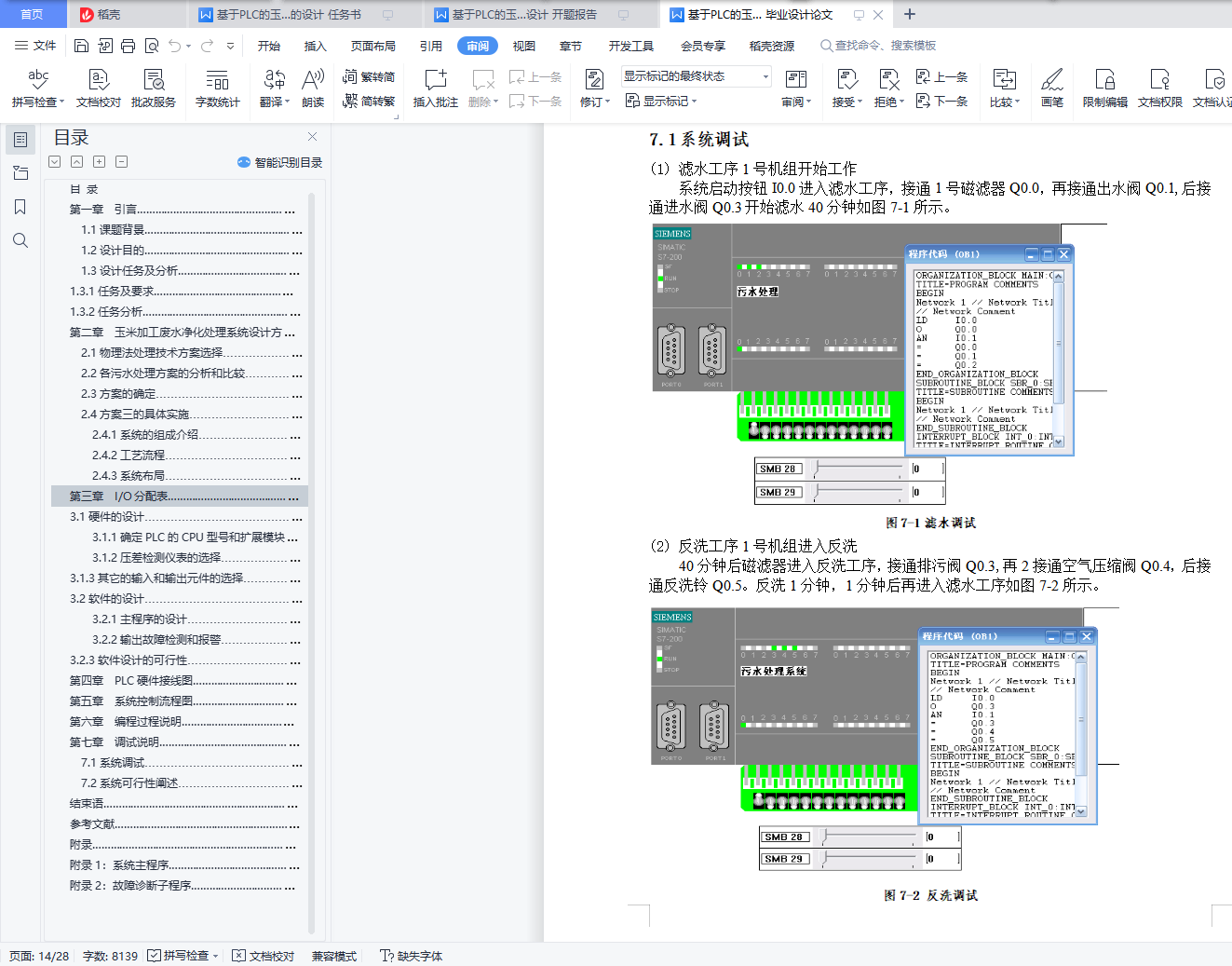 目 录第一章 引言………………………………………………………………………… 11.1课题背景……………………………………………………………………… 11.2设计目的………………………………………………………………………… 11.3设计任务及分析………………………………………………………………… 11.3.1任务及要求………………………………………………………………… 11.3.2任务分析…………………………………………………………………… 1第二章 玉米加工废水净化处理系统设计方案选择…………………………………………… 32.1物理法处理技术方案选择……………………………………………………… 32.2各污水处理方案的分析和比较………………………………………………… 42.3方案的确定……………………………………………………………………… 42.4方案三的具体实施……………………………………………………………… 52.4.1系统的组成介绍…………………………………………………………… 52.4.2工艺流程…………………………………………………………………… 52.4.3系统布局…………………………………………………………………… 6第三章 I/O分配表…………………………………………………………………… 73.1硬件的设计……………………………………………………………………… 73.1.1确定PLC的CPU型号和扩展模块型号…………………………………… 73.1.2压差检测仪表的选择……………………………………………………… 73.1.3其它的输入和输出元件的选择…………………………………………… 73.2软件的设计……………………………………………………………………… 83.2.1主程序的设计……………………………………………………………… 83.2.2输出故障检测和报警……………………………………………………… 83.2.3软件设计的可行性………………………………………………………… 9第四章 PLC硬件接线图……………………………………………………………… 10第五章 系统控制流程图……………………………………………………………… 11第六章 编程过程说明………………………………………………………………… 12第七章 调试说明……………………………………………………………………… 137.1系统调试………………………………………………………………………… 147.2系统可行性阐述………………………………………………………………… 15结束语………………………………………………………………………………… 16参考文献………………………………………………………………………………… 17附录……………………………………………………………………………………… 18附录1:系统主程序………………………………………………………………… 18附录2:故障诊断子程序…………………………………………………………… 24第一章 引言1.1课题背景可编程控制器即PLC是综合了计算机技术、自动控制技术和通信技术的一种新型的、通用的自动控制装置。现在可编程控制器已经成为最重要、最可靠、应用场合最广泛的工业控制微型计算机。它具有功能强、可靠性高、使用灵活方便、易于编程以及适应工业环境等一系列优点。为了提高污水处理厂的运行管理水平, PLC也成为了该系统的重要组成单元之一,在该系统中各单元按一定拓扑结构互相连接构成污水处理厂的控制系统。1.2设计目的在玉米加工企业中,有大量的工业用水用于冷却,为此每天消耗大量的水资源,由于用过的冷却水含有氧化玉米杂质,不宜多次循环使用。为保护环境、节约用水,需要对含有氧化玉米杂质的污水进行净化处理。1.3设计任务及分析1.3.1任务及要求(1)两台机组的滤水工序可单独进行,也可同时进行。而反洗工序只允许单台机组进行工作,一台机组反洗时,另一台必须等待。两台机组同时要求反洗时,1号机组优先。(2)为保证滤水工艺的正常进行,在每台机组的管道上均安装了压差检测仪表,只要出现了“管压差高”信号,则应立即停止滤水工序,自动进入反洗工序。(3)为增强系统的可靠性,将每台机组的磁滤器及各个电磁阀线圈的接通信号反馈到PLC输入端,一旦某一输出信号不正常,要立即停止系统工作,这样可避免发生事故。(4)接触器输出故障检测报警。