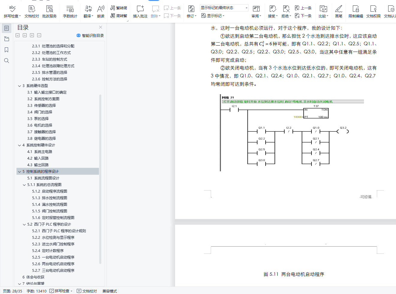 摘 要随着城市的发展,城市交通越来越拥堵,人们都在寻找其他便捷的交通工具,而地铁的出现完美地解决了这个问题。地铁方便、快捷,是当今最流行的交通方式。因此,对地铁系统排水系统的收集与排放进行研究具有重要的理论和现实意义。本文首先介绍了地铁的研究背景和发展现状,提出了总体设计方法。 CAD和流程图展示了系统的主要工作模式,通过PLC程序进行编程控制,利用传感器的水位感应达到排水目的,最后对设计的系统提出改进和建议。关键词:多重自动控制PLC顺序控制ABSTRACTWith the development of the city, the urban traffic is becoming more and more congested, and people are looking for other convenient means of transportation, and the emergence of the subway solves this problem perfectly.Subway is convenient, fast, and is the most popular mode of transportation today.Therefore, studying the collection and discharge of subway drainage system has important theoretical and practical significance.This paper first introduces the research background and development status of subway, and proposes the overall design method.CAD and flow chart show the main working mode of the system, programming control through PLC program, using the sensor, and finally make improvements and suggestions for the designed system.Key words: multiple automatic control PLC sequence control目 录摘 要 IABSTRACTII1 绪论11.1 研究背景11.2 研究意义11.3 国内研究现状11.4 地铁排水设计方法22 排水系统总体方案设计32.1 地铁水的来源及排放方式32.2 排水系统实现的功能32.3 系统控制功能设计32.3.1 处理池的选择和分配 32.3.2 处理池的工作方式 42.3.3 车站的控制方式 42.3.4 处理池故障处理方式 52.3.5 排水管道的选择 52.3.6 控制方法的选择 53 系统硬件选型73.1 输入输出接口的确定73.2 系统控制方案图83.3 传感器的选择93.4 阀门的选择103.5 泵的选择103.6 电机的选择113.7 接触器的选择113.8 继电器的选择124 系统控制硬件设计134.1 系统主电路134.2 输入回路134.3 输出回路135 控制系统的程序设计145.1 系统流程图设计145.1.1系统的总流程图145.1.2 启动程序流程图 165.1.3 排水控制流程图 175.1.4 满水控制流程图 185.1.5 阀门控制流程图 195.1.6 定时报警控制流程图 205.2 西门子PLC程序的设计215.2.1 西门子PLC程序的设计规则 215.2.2 水位检测与显示程序 215.2.3 进出水阀门控制程序 225.2.4 定时计数程序 225.2.5 一台电动机启动程序 235.2.6 两台电动机启动程序 245.2.7 三台电动机启动程序 246 体会与收获 267 结论与展望 287.1 结论287.2课题的展望28致 29参考文献 30