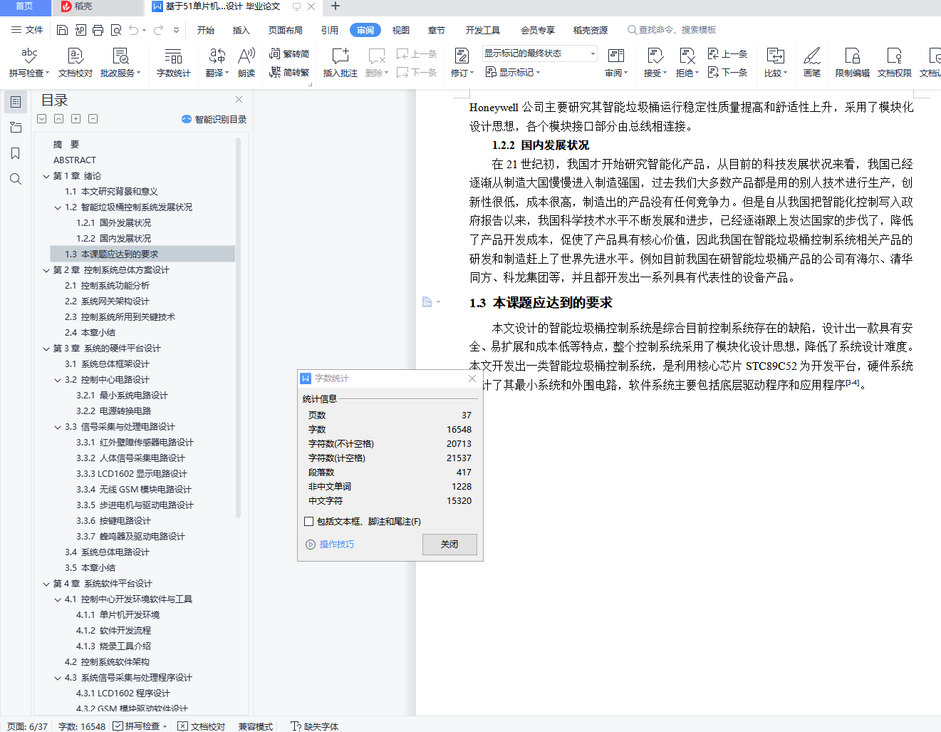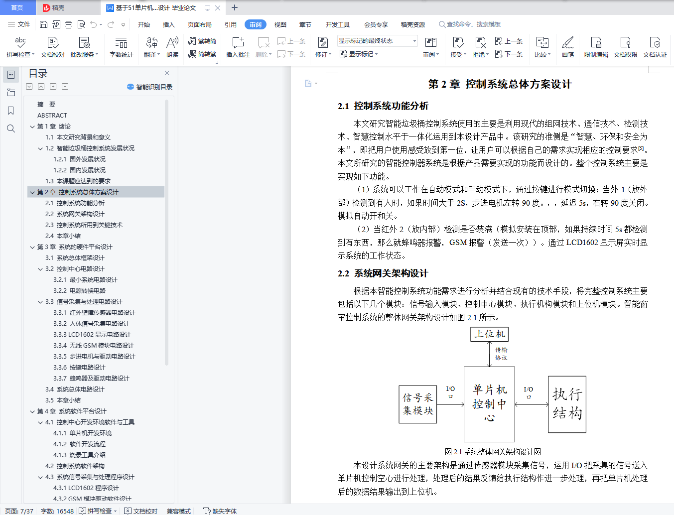 摘 要随着科学技术与物联网的发展,推动着智能化产品逐渐进入人们的生活中,人们为了追求高的生活质量,普通垃圾桶系统已经不能科学的需求。为了设计一款基于单片机红外感应垃圾桶系统控制器,此设计利用STC系列单片机,设计出一款智能化垃圾桶控制系统。本设计的完整的系统主要包括STC89C52单片机最小系统、人体红外采集电路、红外避障采集电路、蜂鸣器报警电路、按键组件电路、LED指示灯电路、液晶显示电路、无线GSM模块电路、步进电机及其驱动电路和电源转换电路组成。系统可以工作在自动和手动模式,运用按键进行切换,在自动模式下,运用红外传感器采集人体和垃圾信号,从而实现垃圾桶自动打开关闭和报警功能;在手动模式,运用按键打开或者关闭垃圾桶,通过步进电机正反转模拟垃圾桶打开与关闭,在液晶屏上显示垃圾桶的工作状态。本设计软件系统采用模块设计思想,采用C语言作为程序设计语言,通过KEIL完成程序设计,使用51程序下载软件完成程序的烧录。本文中设计了各个模块运行流程图和程序运行思想。在系统硬件和软件系统都完成后,经过相应的软硬件测试后,通过搭建实验平台,逐步验证系统功能。最后,经过实际试验,验证了本系统具有很好的实用性和稳定性。关键词:单片机;红外电路;蜂鸣器;GSM模块;LCD1602ABSTRACTWith the development of science and technology and Internet of things, intelligent products are gradually entering into people's life. In order to pursue the high quality of life, the ordinary trash bin system has been unable to scientific demand. In order to design a controller of infrared induction trash can system based on single chip microcomputer, an intelligent garbage can control system is designed by using STC series single chip microcomputer.The whole system mainly includes the minimum system of STC89C52 microcontroller, infrared acquisition circuit of human body, acquisition circuit of infrared obstacle avoidance, alarm circuit of buzzer, key module circuit of LED indicator lamp circuit, liquid crystal display circuit, wireless GSM module circuit. Stepper motor, driving circuit and power conversion circuit. The system can work in the automatic and manual mode, use the key to switch, in the automatic mode, using infrared sensors to collect human body and garbage signal, so as to realize the garbage can automatically open and close and alarm function; in manual mode, Use the keys to open or close the trash can, step through the electricity The machine turns on and off the dumpster and displays the working state of the trash can on the LCD screen.The design software system adopts the module design idea, the C language as the programming language, completes the program design through the KEIL, and uses 51 programs to download the software to complete the program burning. In this paper, the flow chart of each module and the idea of program operation are designed.After the completion of the system hardware and software system, after the corresponding software and hardware tests, the system function is verified step by step by setting up the experimental platform. Finally, the system has good practicability and stability.Key words: single chip microcomputer; infrared circuit; buzzer / GSM module LCD1602目 录摘 要 IABSTRACT II第1章 绪论 11.1本文研究背景和意义 11.2智能垃圾桶控制系统发展状况 11.2.1国外发展状况 11.2.2国内发展状况 21.3本课题应达到的要求 2第2章 控制系统总体方案设计 32.1控制系统功能分析 32.2系统网关架构设计 32.3控制系统所用到关键技术 32.4本章小结 4第3章 系统的硬件平台设计 53.1系统总体框架设计 53.2控制中心电路设计 63.2.1最小系统电路设计 63.2.2电源转换电路 83.3信号采集与处理电路设计 83.3.1红外壁障传感器电路设计 83.3.2人体信号采集电路设计 93.3.3 LCD1602显示电路设计 103.3.4无线GSM模块电路设计 123.3.5步进电机与驱动电路设计 133.3.6 按键电路设计 143.4系统总体电路设计 153.5本章小结 16第4章 系统软件平台设计 174.1控制中心开发环境软件与工具 174.1.1 单片机开发环境 174.1.2 软件开发流程 184.1.3烧录工具介绍 184.2控制系统软件架构 194.3系统信号采集与处理程序设计 204.3.1 LCD1602程序设计 204.3.2 GSM模块驱动软件设计 214.3.3步进电机处理程序设计 224.3.4人体热式信号检测程序设计 234.3.5按键检测程序设计 244.3.6红外传感器程序流程图设计 254.4 本章小结 26第5章 系统调试与性能验证 275.1系统调试环境搭建 275.2系统软硬件调试 275.2.1系统软件调试 285.2.2系统硬件调试 285.3测试结果分析 295.4性能验证 295.4.1系统从启动验证 295.4.2系统稳定性验证 295.5本章小结 29第6章 总结与展望 31参考文献 32致 谢 32