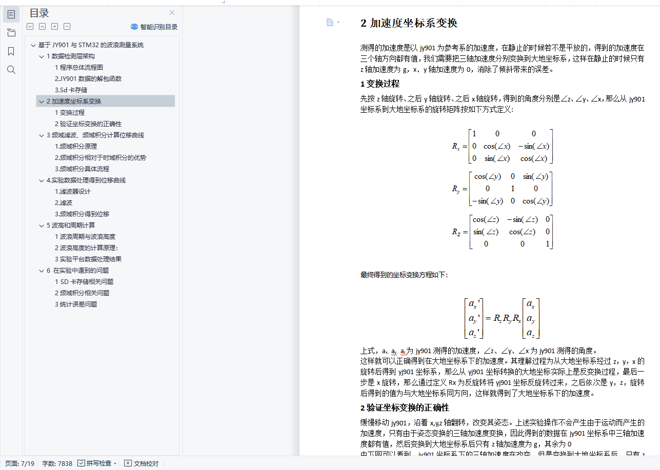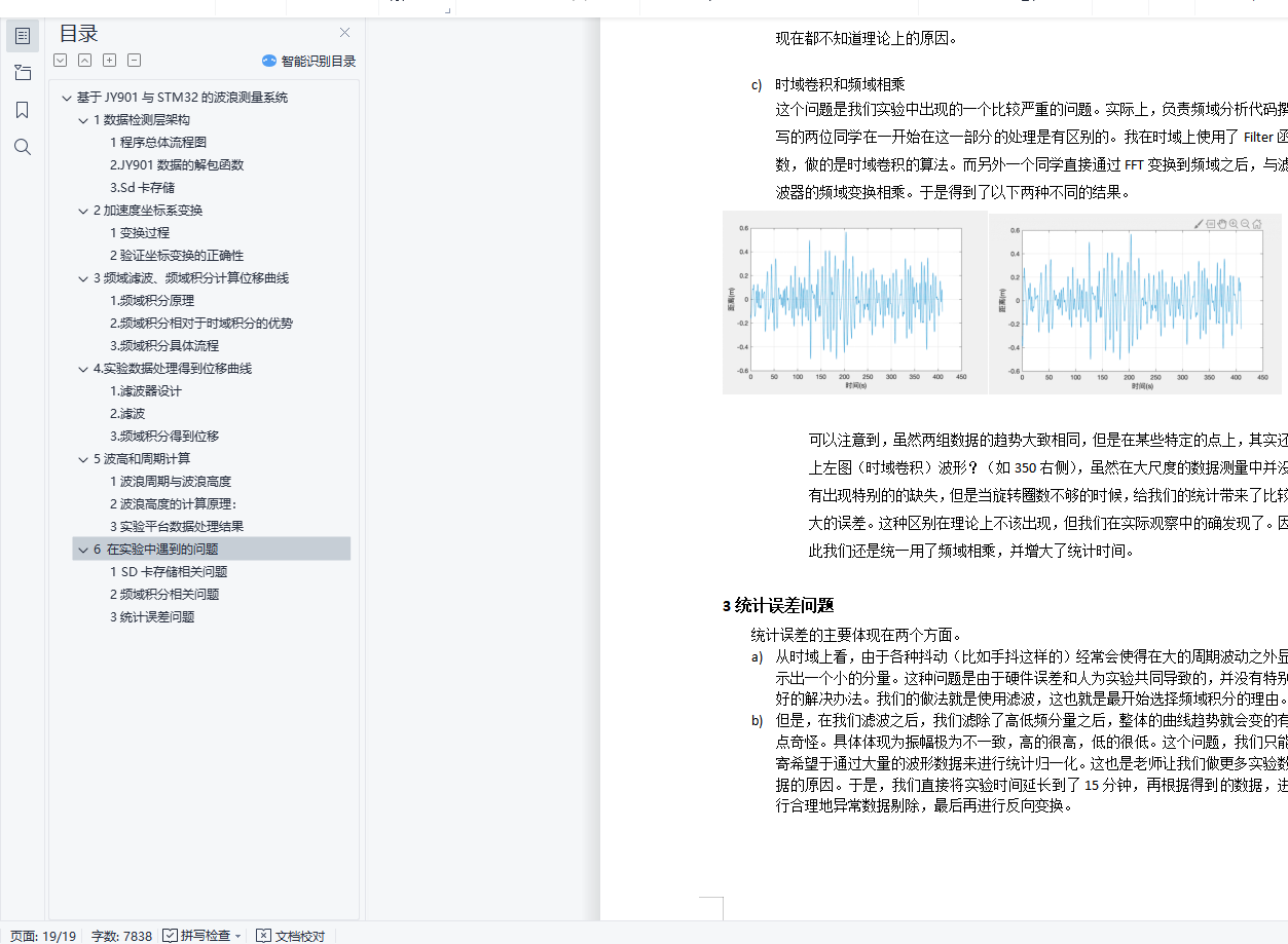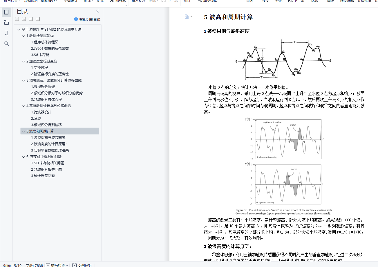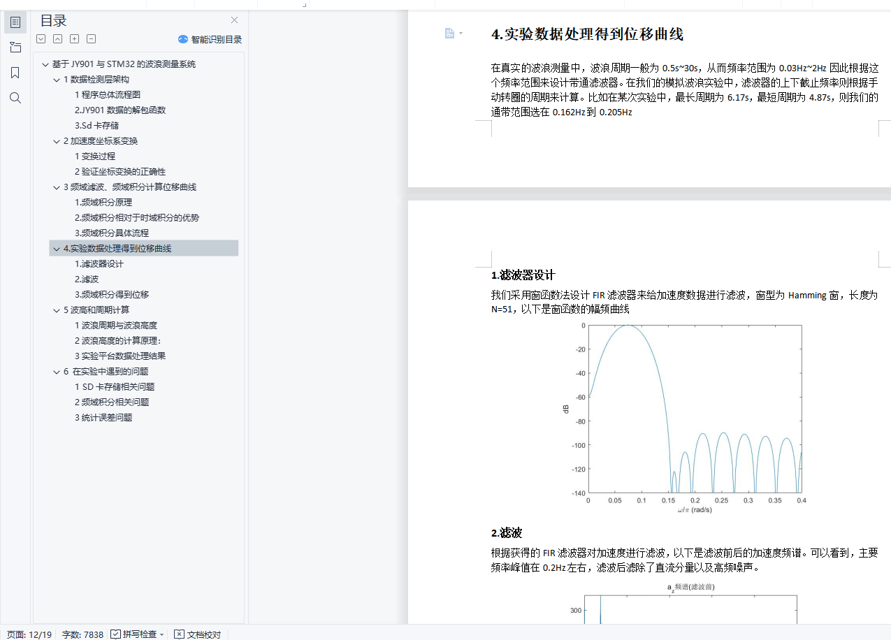 基于JY901与STM32的波浪测量系统注:这份技术报告大体上是我们组共同完成的,该份报告为总结报告的一点细节补充。在本次项目中,本人负责的内容主要是STM32数据送SD卡存储和数据处理中的频域积分。因此,在第六部分(项目中遇到的问题),我只记录了这两部分的内容。但其实,两份报告在技术综述的部分有大量重复的描述,因此老师检查的时候,这份不看只看总结报告也问题不大。目录基于JY901与STM32的波浪测量系统 11数据检测层架构 31程序总体流程图 42.JY901数据的解包函数 43.Sd卡存储 62加速度坐标系变换 71变换过程 72验证坐标变换的正确性 73频域滤波、频域积分计算位移曲线 81.频域积分原理 82.频域积分相对于时域积分的优势 93.频域积分具体流程 94.实验数据处理得到位移曲线 121.滤波器设计 132.滤波 133.频域积分得到位移 135波高和周期计算 151波浪周期与波浪高度 152波浪高度的计算原理: 153实验平台数据处理结果 166 在实验中遇到的问题 171 SD卡存储相关问题 172频域积分相关问题 183统计误差问题 19摘要:在我们的实习期间,我们花费将近两周半时间,完成了一套给予九轴加速度计JY901和单片机STM32的波浪参数测量系统。该系统的应用意义在于,通过测量JY901随着波浪起伏的加速度数据,绘制出波浪的位移曲线。在该系统中,JY901和STM32共同构成了下位机系统,将读取到的加速度数据存储在SD卡后送入上位机并通过matlab进行处理。在将加速度数据通过频域积分得到位移曲线之后,我们通过统计分析的手段得到了波高与周期的相关结果。