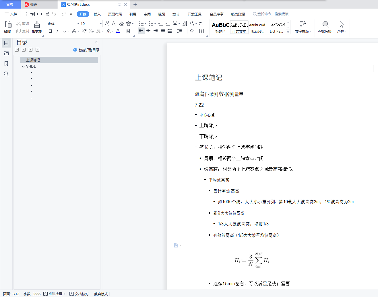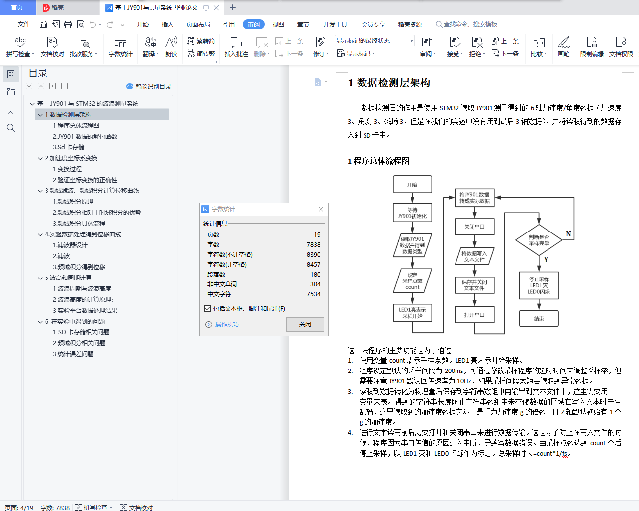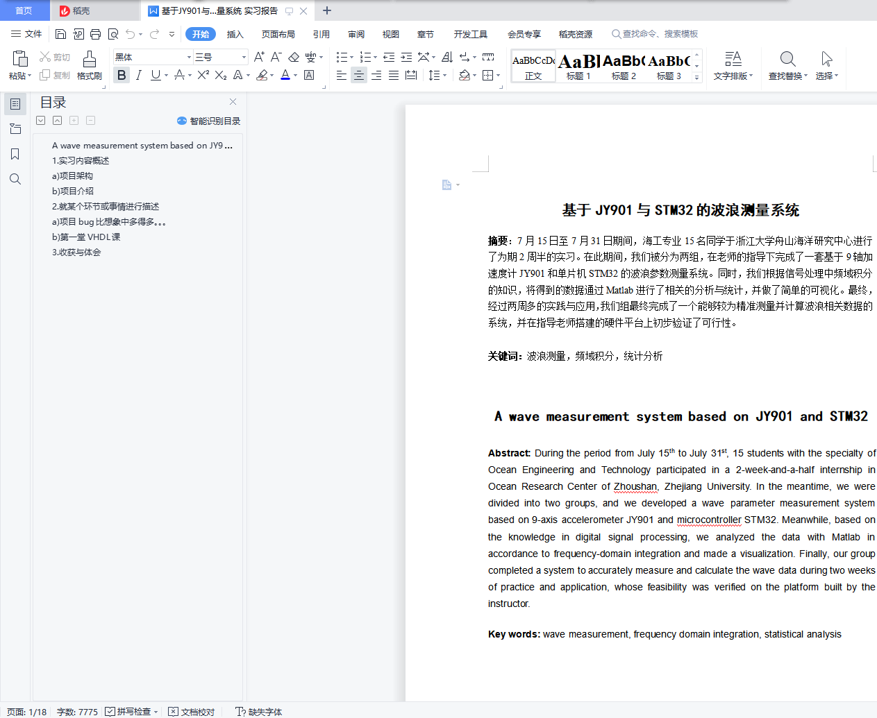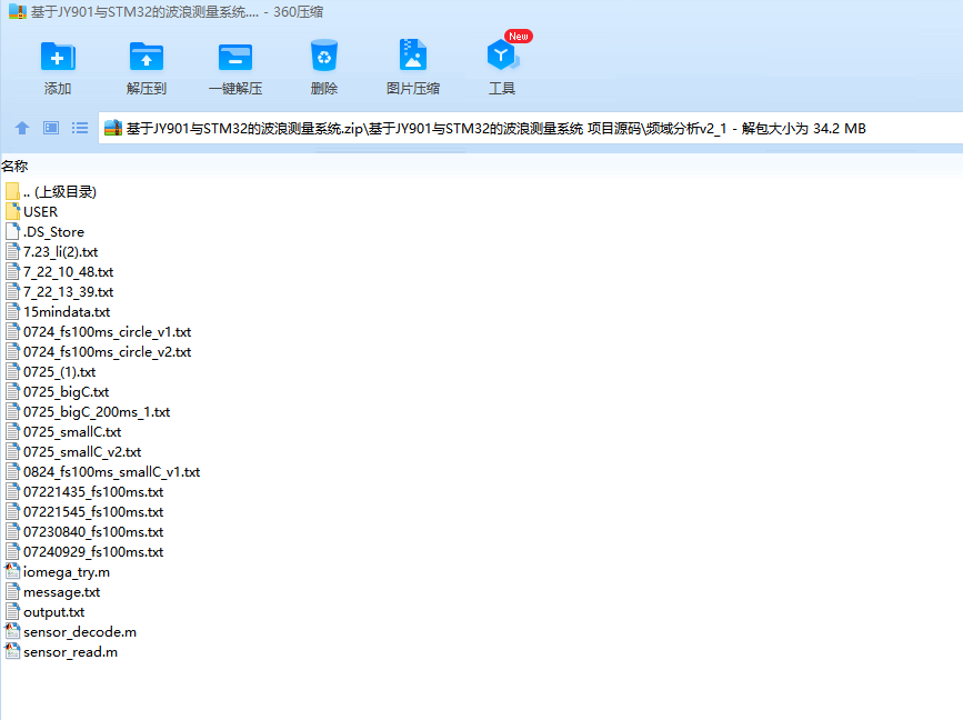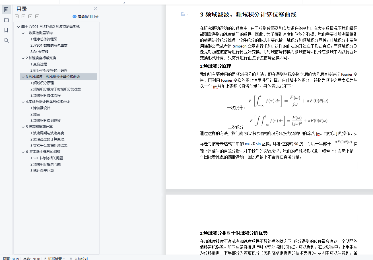 基于JY901与STM32的波浪测量系统注:这份技术报告大体上是我们组共同完成的,该份报告为总结报告的一点细节补充。在本次项目中,本人负责的内容主要是STM32数据送SD卡存储和数据处理中的频域积分。因此,在第六部分(项目中遇到的问题),我只记录了这两部分的内容。但其实,两份报告在技术综述的部分有大量重复的描述,因此老师检查的时候,这份不看只看总结报告也问题不大。目录基于JY901与STM32的波浪测量系统 11数据检测层架构 31程序总体流程图 42.JY901数据的解包函数 43.Sd卡存储 62加速度坐标系变换 71变换过程 72验证坐标变换的正确性 73频域滤波、频域积分计算位移曲线 81.频域积分原理 82.频域积分相对于时域积分的优势 93.频域积分具体流程 94.实验数据处理得到位移曲线 121.滤波器设计 132.滤波 133.频域积分得到位移 135波高和周期计算 151波浪周期与波浪高度 152波浪高度的计算原理: 153实验平台数据处理结果 166 在实验中遇到的问题 171 SD卡存储相关问题 172频域积分相关问题 183统计误差问题 19摘要:在我们的实习期间,我们花费将近两周半时间,完成了一套给予九轴加速度计JY901和单片机STM32的波浪参数测量系统。该系统的应用意义在于,通过测量JY901随着波浪起伏的加速度数据,绘制出波浪的位移曲线。在该系统中,JY901和STM32共同构成了下位机系统,将读取到的加速度数据存储在SD卡后送入上位机并通过matlab进行处理。在将加速度数据通过频域积分得到位移曲线之后,我们通过统计分析的手段得到了波高与周期的相关结果。