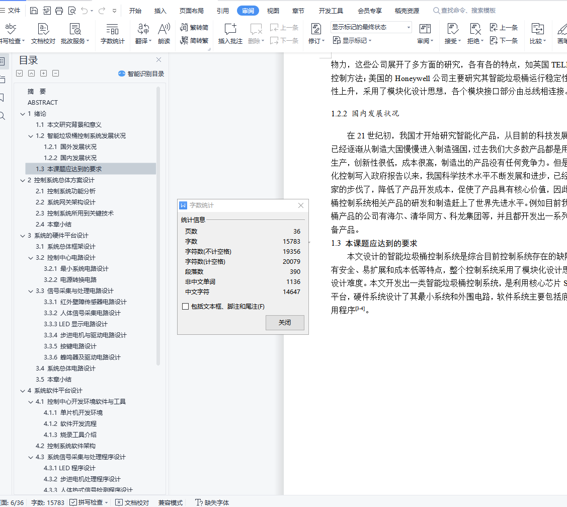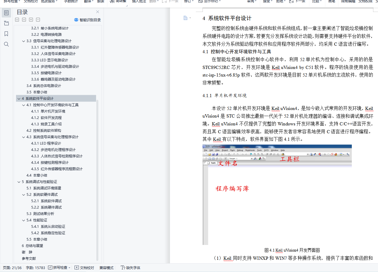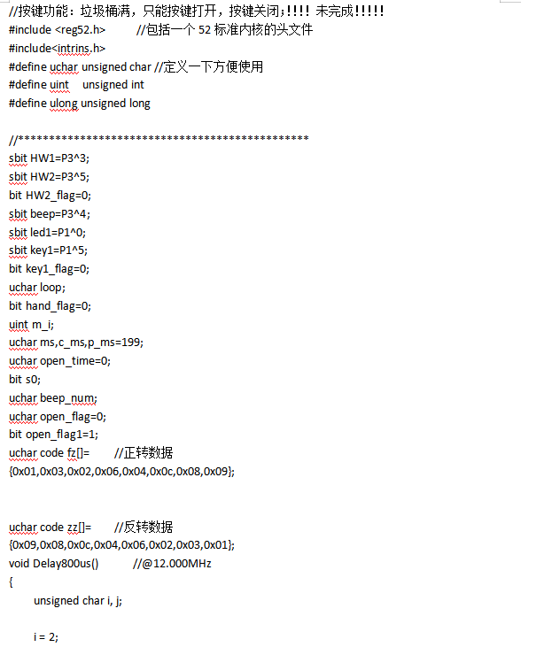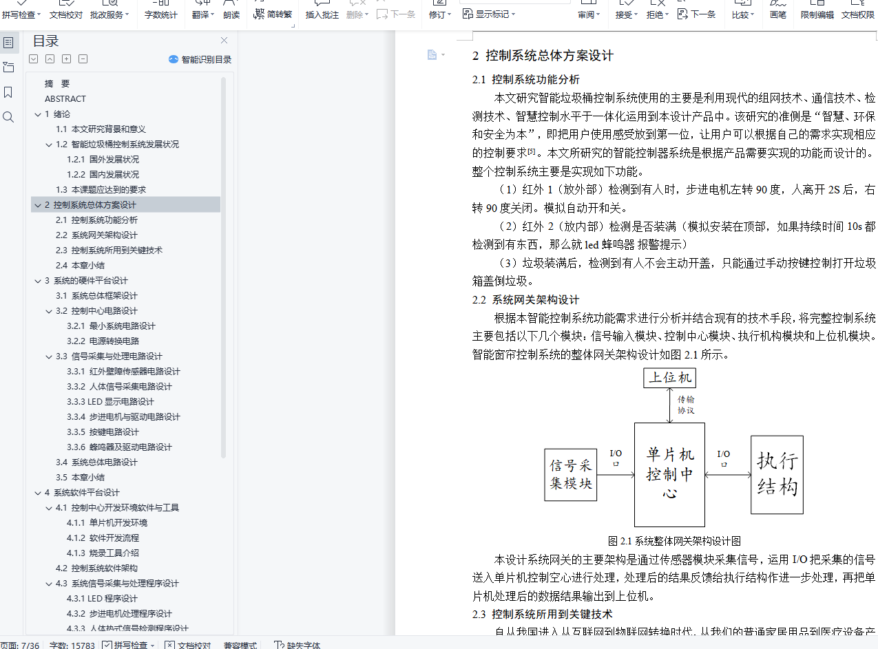 摘 要随着科学技术与物联网的发展,推动着智能化产品逐渐进入人们的生活中,人们为了追求高的生活质量,普通垃圾桶系统已经不能科学的需求。为了设计一款基于单片机红外感应垃圾桶系统控制器,此设计利用STC系列单片机,设计出一款智能化垃圾桶控制系统。本设计的完整的系统主要包括STC89C52单片机最小系统、人体红外采集电路、红外避障采集电路、蜂鸣器报警电路、按键组件电路、LED指示灯电路、液晶显示电路、步进电机及其驱动电路和电源转换电路组成。系统可以工作在自动和手动模式,运用按键进行切换,在自动模式下,运用红外传感器采集人体和垃圾信号,从而实现垃圾桶自动打开关闭和报警功能;在手动模式,运用按键打开或者关闭垃圾桶,通过步进电机正反转模拟垃圾桶打开与关闭,在液晶屏上显示垃圾桶的工作状态。本设计软件系统采用模块设计思想,采用C语言作为程序设计语言,通过KEIL完成程序设计,使用51程序下载软件完成程序的烧录。本文中设计了各个模块运行流程图和程序运行思想。在系统硬件和软件系统都完成后,经过相应的软硬件测试后,通过搭建实验平台,逐步验证系统功能。最后,经过实际试验,验证了本系统具有很好的实用性和稳定性。关键词:单片机;红外电路;蜂鸣器;LEDABSTRACTWith the development of science and technology and Internet of things, intelligent products are gradually entering into people's life. In order to pursue the high quality of life, the ordinary trash bin system has been unable to scientific demand. In order to design a controller of infrared induction trash can system based on single chip microcomputer, an intelligent garbage can control system is designed by using STC series single chip microcomputer.The whole system mainly includes the minimum system of STC89C52 microcontroller, infrared acquisition circuit of human body, acquisition circuit of infrared obstacle avoidance, alarm circuit of buzzer, key module circuit of LED indicator lamp circuit, liquid crystal display circuit, wireless module circuit. Stepper motor, driving circuit and power conversion circuit. The system can work in the automatic and manual mode, use the key to switch, in the automatic mode, using infrared sensors to collect human body and garbage signal, so as to realize the garbage can automatically open and close and alarm function; in manual mode, Use the keys to open or close the trash can, step through the electricity The machine turns on and off the dumpster and displays the working state of the trash can on the LCD screen.The design software system adopts the module design idea, the C language as the programming language, completes the program design through the KEIL, and uses 51 programs to download the software to complete the program burning. In this paper, the flow chart of each module and the idea of program operation are designed.After the completion of the system hardware and software system, after the corresponding software and hardware tests, the system function is verified step by step by setting up the experimental platform. Finally, the system has good practicability and stability.Key words: single chip microcomputer; LED目 录摘 要 1ABSTRACT 21 绪论 51.1 本文研究背景和意义 51.2 智能垃圾桶控制系统发展状况 51.2.1 国外发展状况 51.2.2 国内发展状况 61.3 本课题应达到的要求 62 控制系统总体方案设计 72.1 控制系统功能分析 72.2 系统网关架构设计 72.3 控制系统所用到关键技术 72.4 本章小结 83 系统的硬件平台设计 93.1 系统总体框架设计 93.2 控制中心电路设计 103.2.1 最小系统电路设计 103.2.2 电源转换电路 123.3 信号采集与处理电路设计 133.3.1 红外壁障传感器电路设计 133.3.2 人体信号采集电路设计 143.3.3 LED显示电路设计 143.3.4 步进电机与驱动电路设计 163.3.5 按键电路设计 183.3.6 蜂鸣器及驱动电路设计 183.4 系统总体电路设计 193.5 本章小结 204 系统软件平台设计 214.1 控制中心开发环境软件与工具 214.1.1 单片机开发环境 214.1.2 软件开发流程 224.1.3 烧录工具介绍 224.2 控制系统软件架构 234.3 系统信号采集与处理程序设计 244.3.1 LED程序设计 244.3.2 步进电机处理程序设计 264.3.3 人体热式信号检测程序设计 264.3.4 按键检测程序设计 274.3.5 红外传感器程序流程图设计 284.4 本章小结 295 系统调试与性能验证 305.1 系统调试环境搭建 305.2 系统软硬件调试 305.2.1 系统软件调试 315.2.2 系统硬件调试 325.3 测试结果分析 325.4 性能验证 325.4.1 系统从启动验证 325.4.2 系统稳定性验证 335.5 本章小结 336 总结与展望 34谢 辞 35参考文献 36