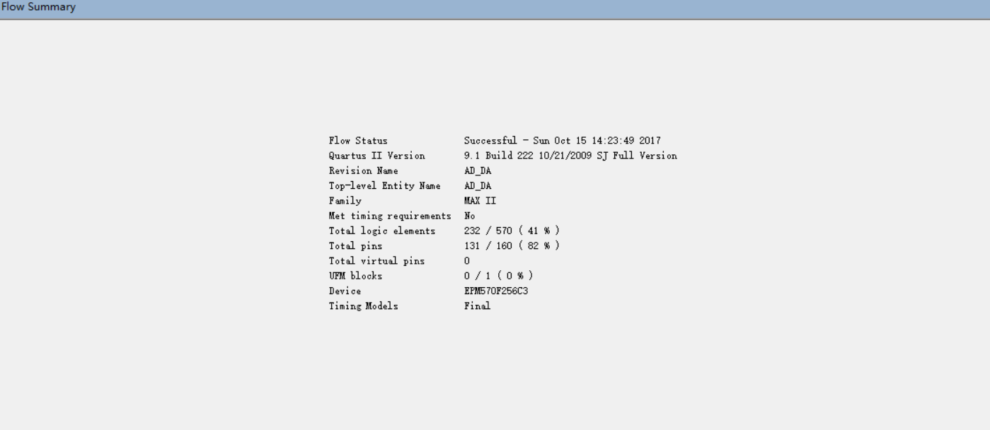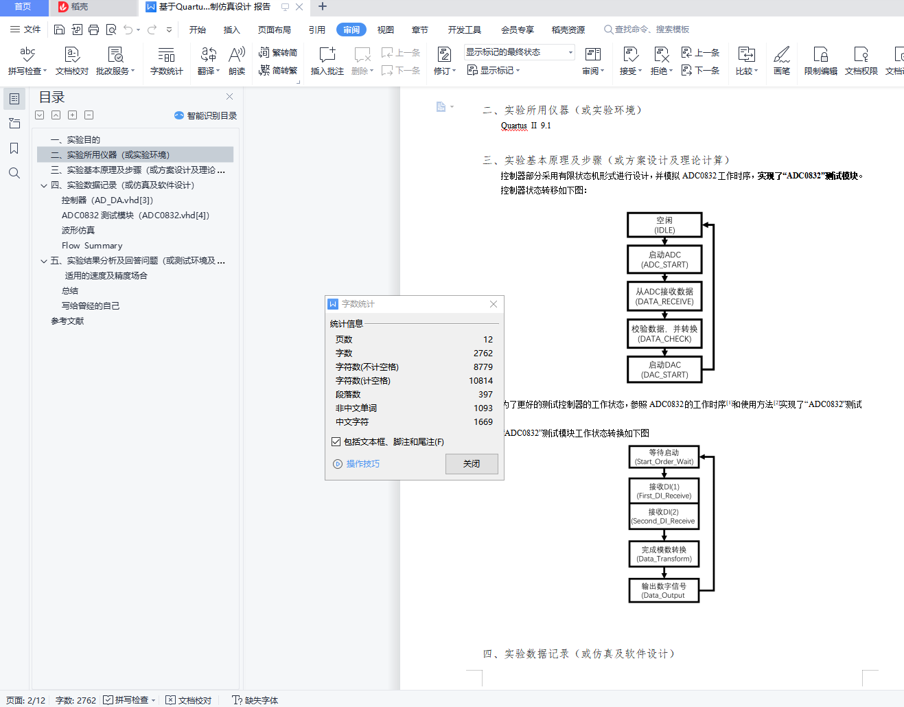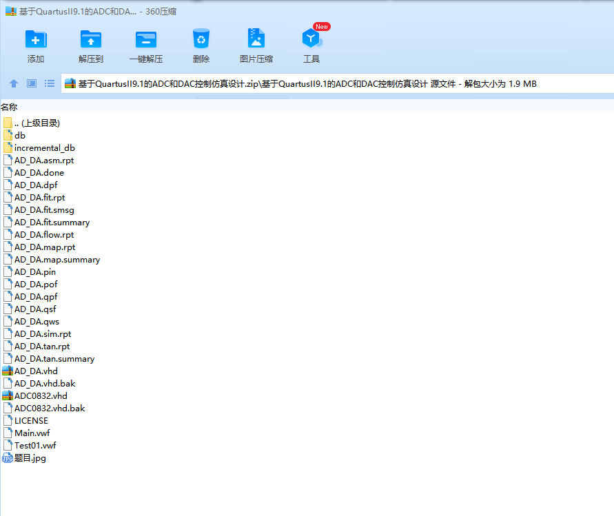 目录一、实验目的 1二、实验所用仪器(或实验环境) 1三、实验基本原理及步骤(或方案设计及理论计算) 1四、实验数据记录(或仿真及软件设计) 2控制器(AD_DA.vhd[3]) 2ADC0832测试模块(ADC0832.vhd[4]) 6波形仿真 10Flow Summary 10五、实验结果分析及回答问题(或测试环境及测试结果) 11适用的速度及精度场合 11总结 11写给曾经的自己 11参考文献 12一、实验目的1. 掌握模数、数模转换相关概念2. 实现FPGA对ADC和DAC的控制二、实验所用仪器(或实验环境)Quartus II 9.1三、实验基本原理及步骤(或方案设计及理论计算)控制器部分采用有限状态机形式进行设计,并模拟ADC0832工作时序,实现了“ADC0