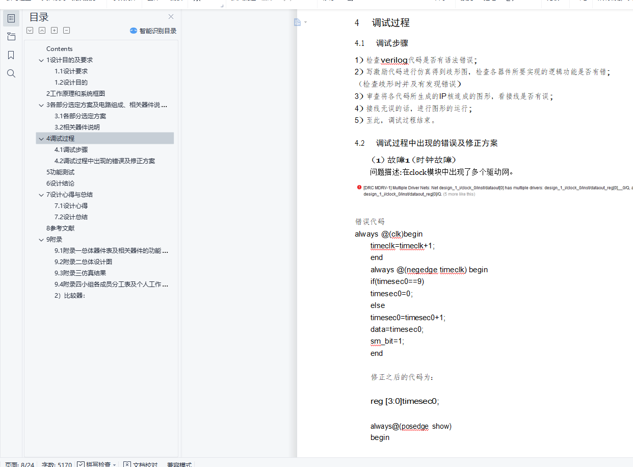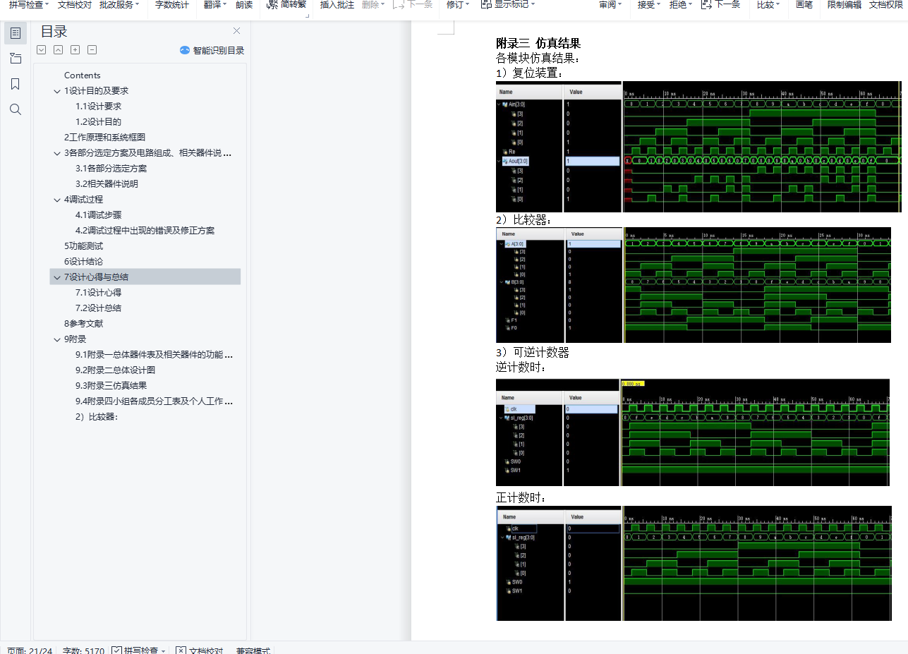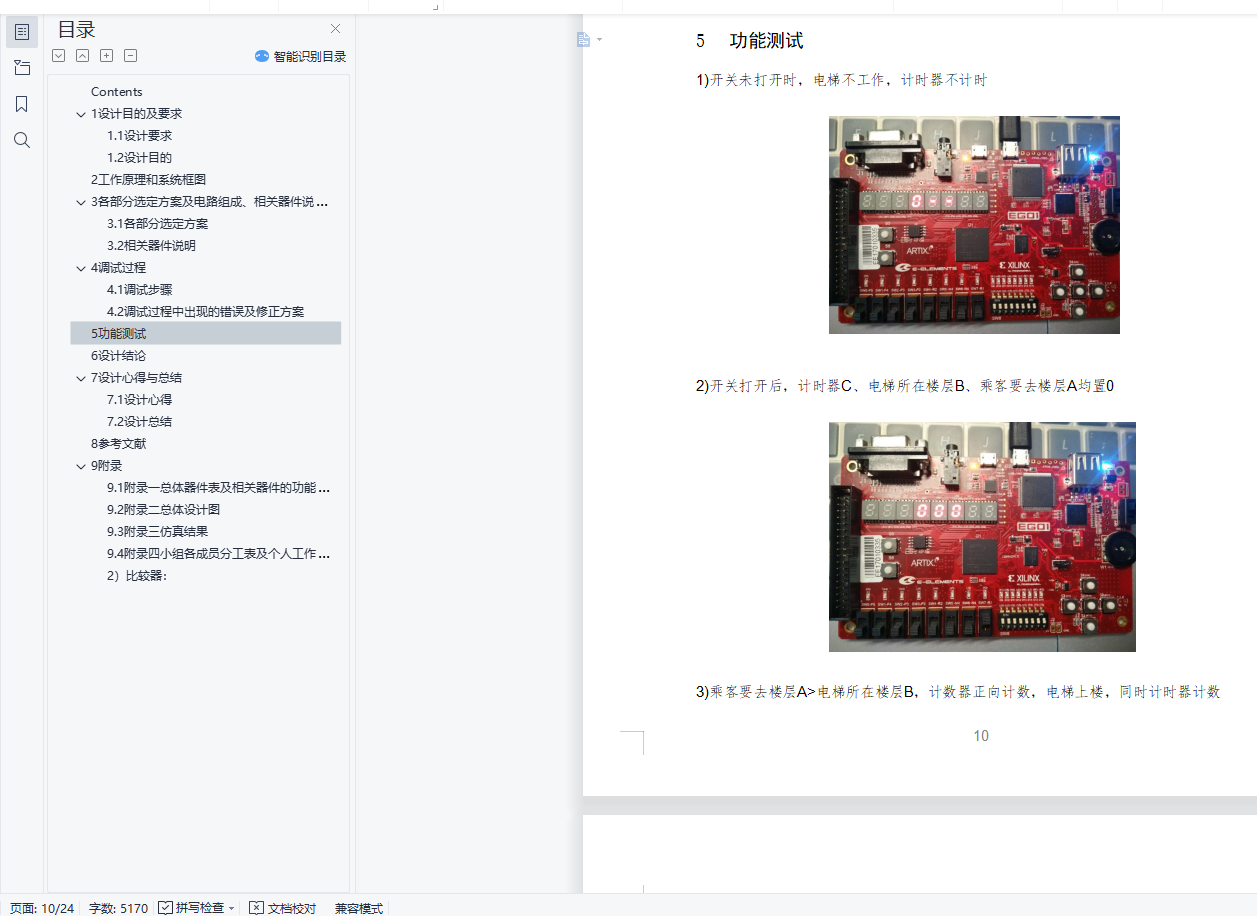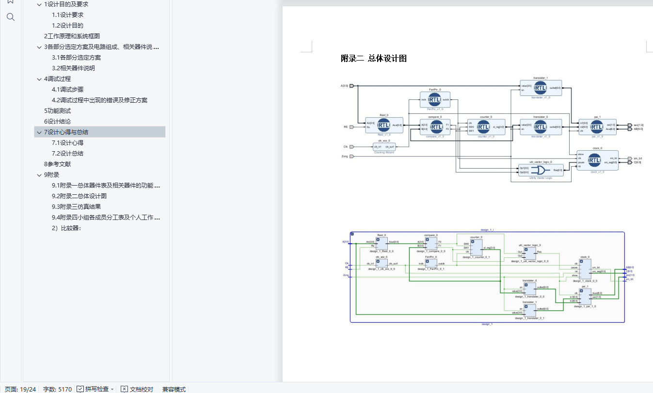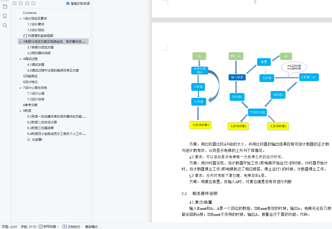 摘要毕业设计是在学完学业后,对所学知识的综合性考察. 知识覆盖面宽,实验所盂时间长。要求学生灵活运用学过的计数器、触发器、译码电路等方面的知识,独立完成从设计、选片、连线、调试、排除故障到实现一个数字系统的全过程,详细书写项H 报告。通过综合设计性实验,培养学生灵活运用所学知识解决比较复杂的实际问题的能力。关键词:电梯控制器设计Contents1设计目的及要求 21.1设计要求 21.2设计H的 22工作原理和系统框图 23各部分选定方案及电路组成、相关器件说明 23.1各部分选定方案 23.2相关器件说明 34调试过程 84.1调试步骤 84.2调试过程中出现的错误及修正方案 85功能测试 106设计结论 127设计心得与总结 127.1设计心得 127.2设计总结 138参考文献 139 附录 149.1附录一总体器件表及相关器件的功能表、管脚分布 149.2附录二总体设计图 149.3附录三仿真结果 149.4附录四小组各成员分工表及个人工作时间表 141设计目的及要求1.1设计要求(1)电梯最少可以往返千0――9层楼。(2)乘客要去的楼层数A可手动输入并显示,按取消键可消除本次输入。(3)可自动显示电梯运行的楼层数B。 (4)当A>B时,电梯上升当A