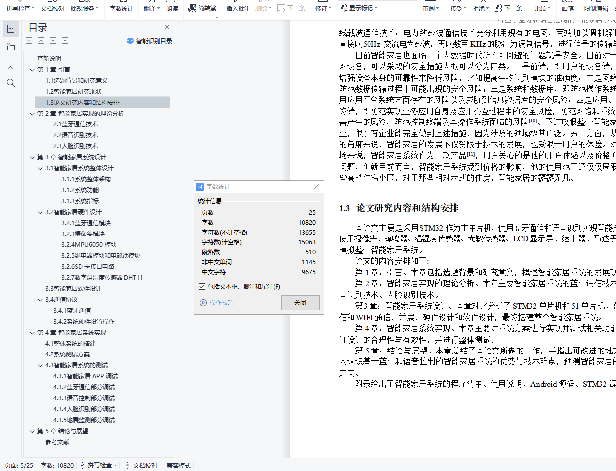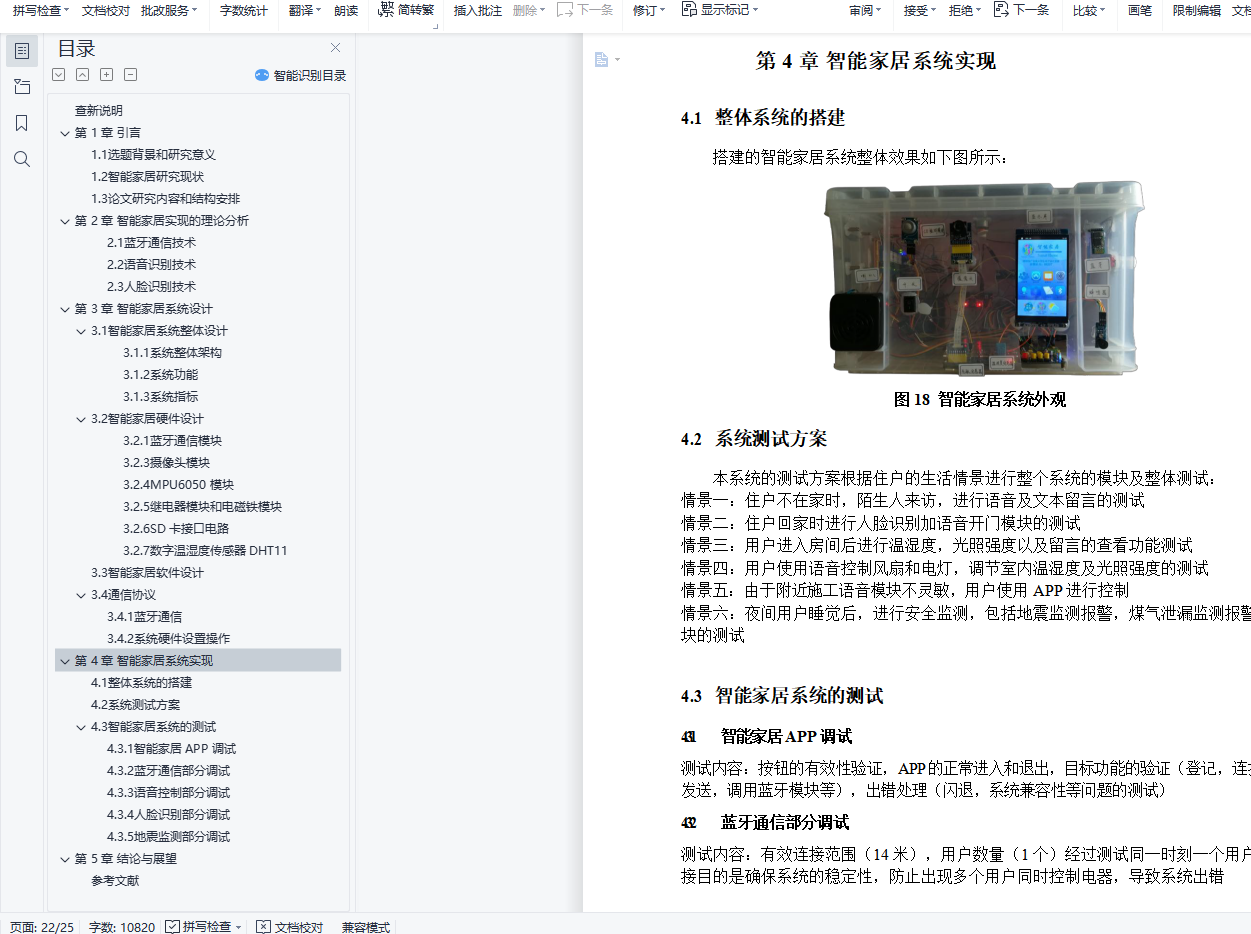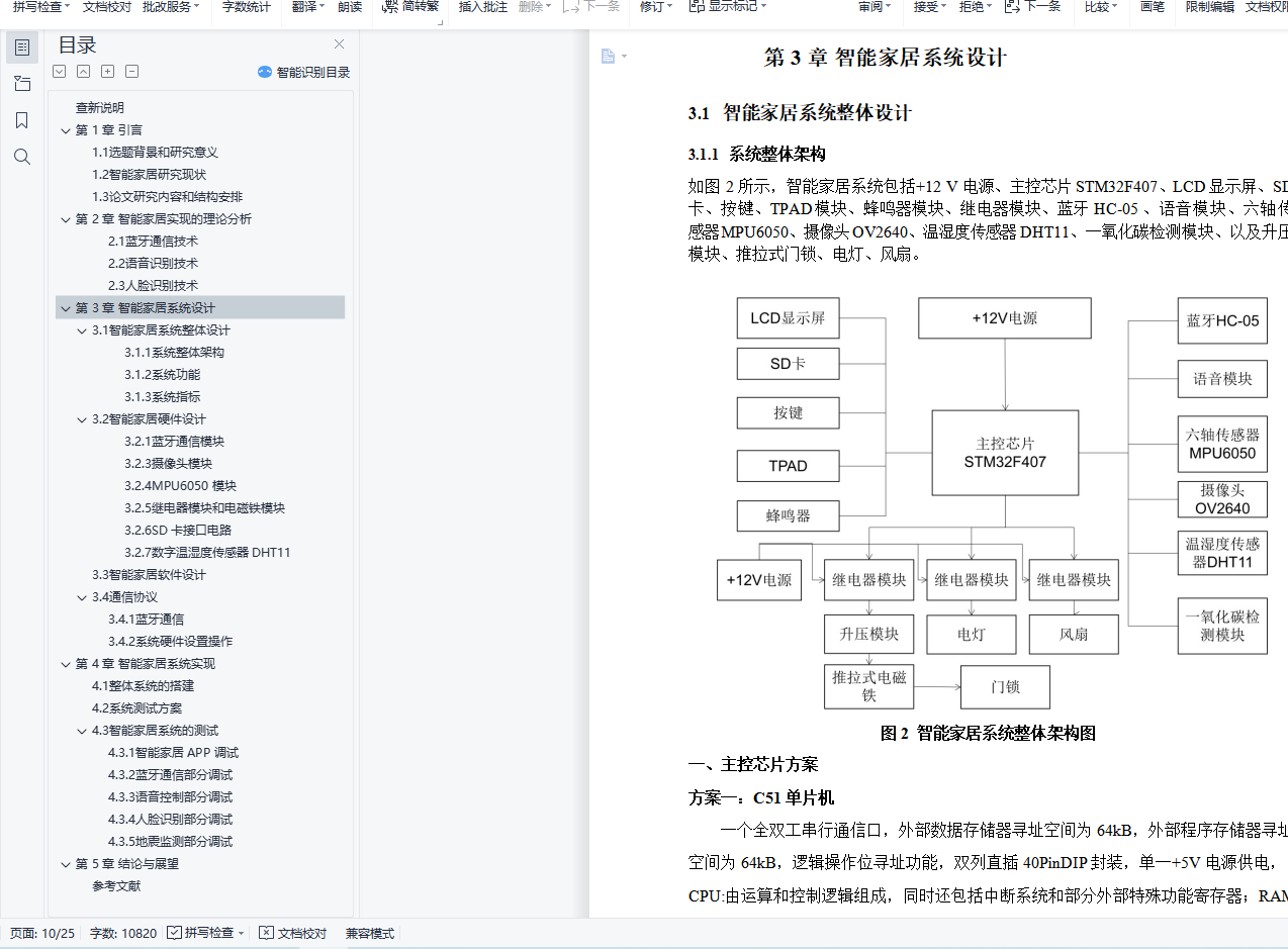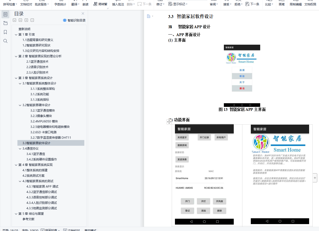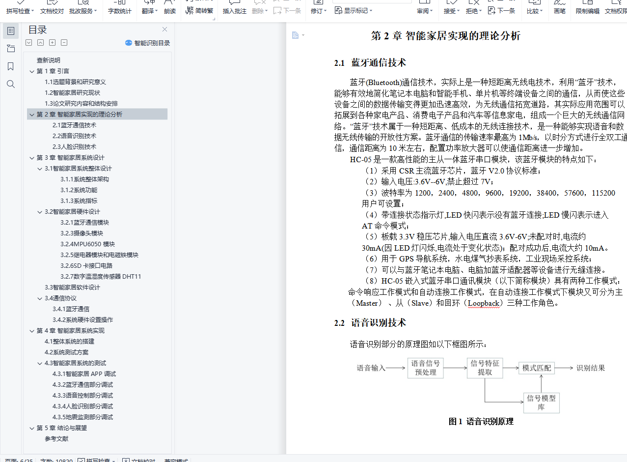 摘要:本项目使用 STM32F407 作为主控芯片,通过蓝牙和语音控制实现安全、便宜的智能家居系统。实现了手机实现家电控制;语音识别+人脸识别开门/关门;语音控制开关灯、开关风扇以及切歌,关闭音乐等;地震、CO、温度、湿度、光强监测等;用户可通过 LCD 显示屏操作 APP 实现人脸管理、人脸登记、语音留言、文本留言、查看语音、查看文本留言、查看门外情况(监控),以及控制开门/关门、开灯/关灯、开风扇/关风扇等等。相比于现有的智能家居方案,我们的方案通过使用 Android ID 作为手机用户唯一识别码以及语音识别+人脸识别双重开门检测,使得整个系统更为安全。同时,我们的方案成本更低,可用于高校学生宿舍推广。关键词:智能家居;STM32;蓝牙;语音识别;人脸识别ABSTRACT This project uses STM32F407 as the main control chip to realize a safe and cheap smart home system through Bluetooth and voice control. Achieve mobile phone to achieve home appliance control; voice recognition + face recognition to open / close the door; voice control switch lights, switch fans and cut songs, turn off music, etc.; earthquake, CO, temperature, humidity, light intensity monitoring, etc.; users can pass LCD Display operation APP implements face management, face registration, voice message, text message, view voice, view text message, view door condition (monitoring), and control door opening/closing, turning on/off, turning on/off Fans and so on. Compared with the existing smart home solution, our solution makes the whole system more secure by using the Android ID as the unique identification code of the mobile phone user and the dual recognition detection of voice recognition + face recognition. At the same time, our program costs are lower and can be used to promote college students' dormitory.INDEX TERMS Smart home; STM32; Bluetooth; Speech recognition; Face recognition目录查新说明 4第 1 章 引言 51.1 选题背景和研究意义 51.2 智能家居研究现状 51.3 论文研究内容和结构安排 6第 2 章 智能家居实现的理论分析 72.1 蓝牙通信技术 72.2 语音识别技术 72.3 人脸识别技术 8第 3 章 智能家居系统设计 103.1 智能家居系统整体设计 103.2 智能家居硬件设计 133.3 智能家居软件设计 183.4 通信协议 223.4.1 蓝牙通信 223.4.2 系统硬件设置操作 22第 4 章 智能家居系统实现 234.1 整体系统的搭建 234.2 系统测试方案 234.3 智能家居系统的测试 234.3.1 智能家居 APP 调试 234.3.2 蓝牙通信部分调试 234.3.3 语音控制部分调试 244.3.4 人脸识别部分调试 244.3.5 地震监测部分调试 24第 5 章 结论与展望 25参考文献 26