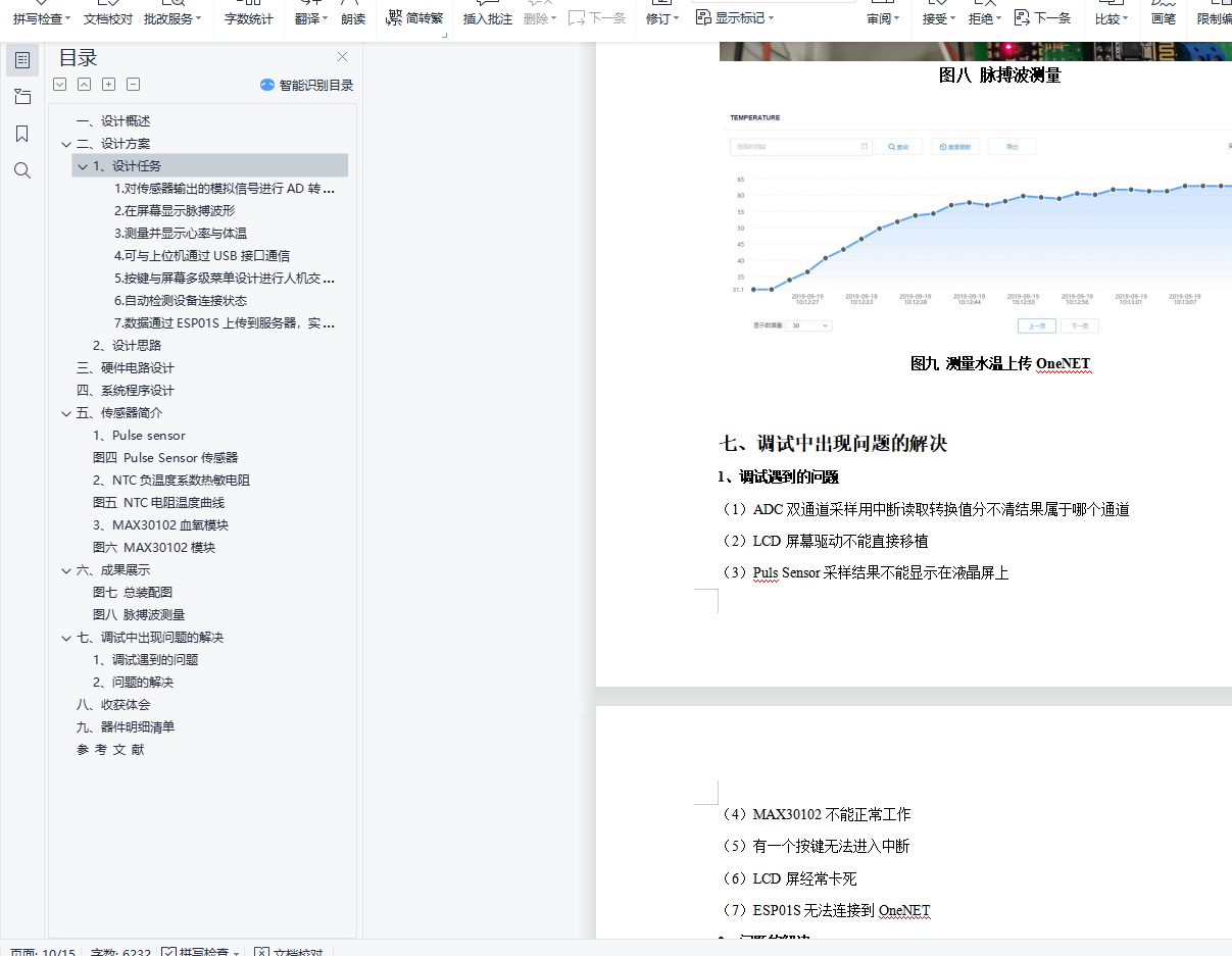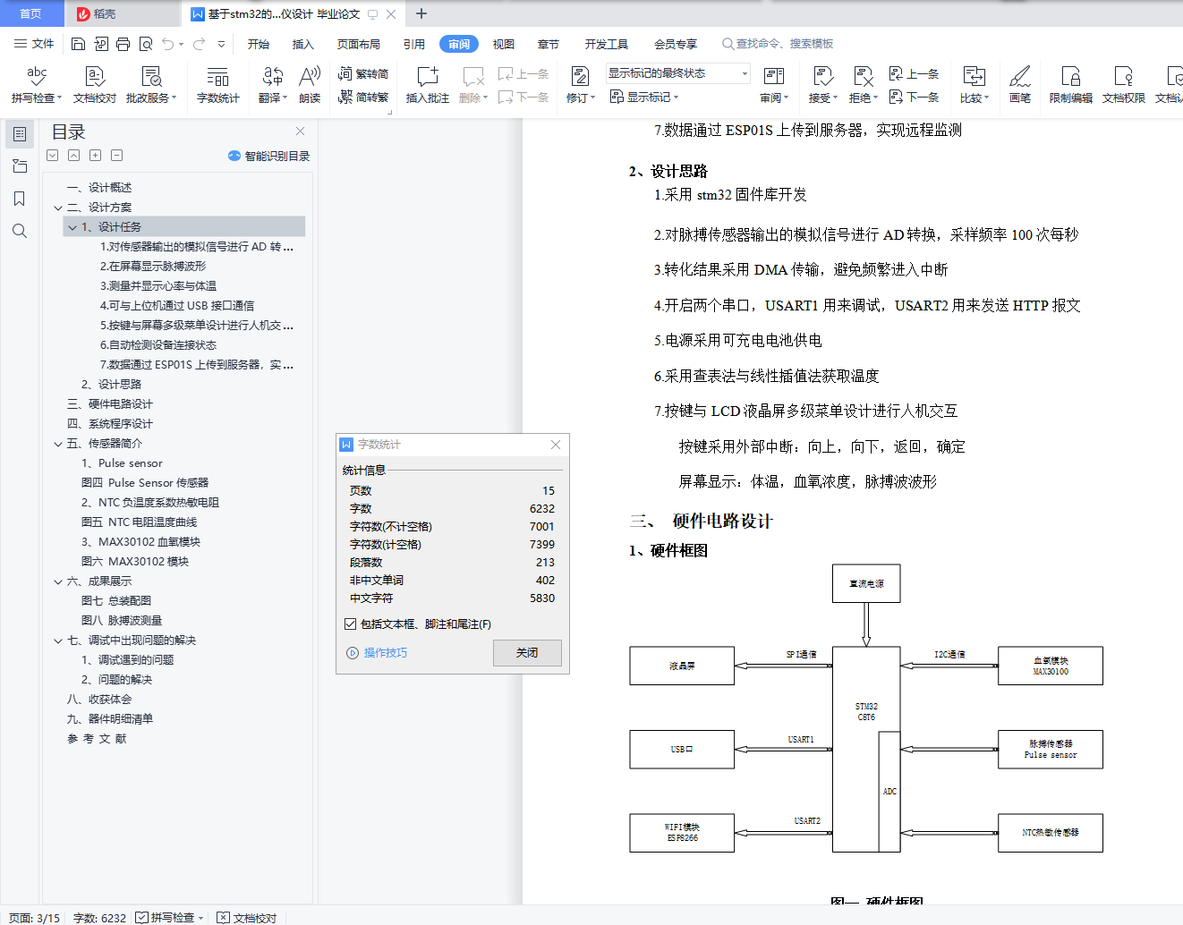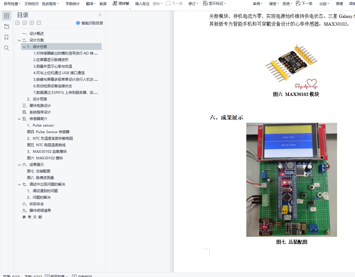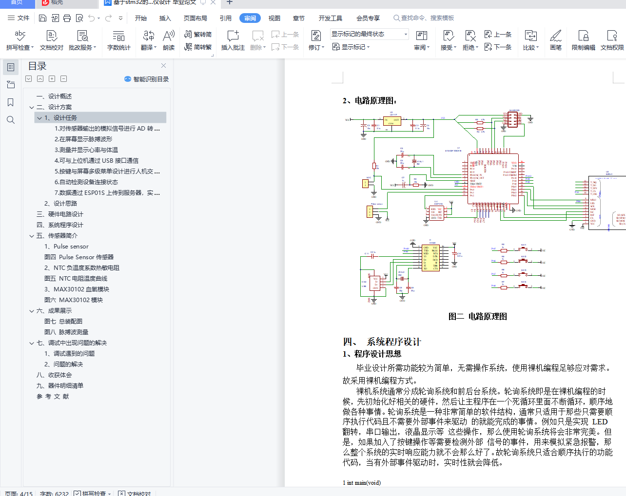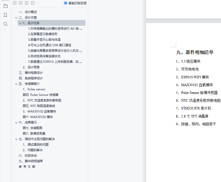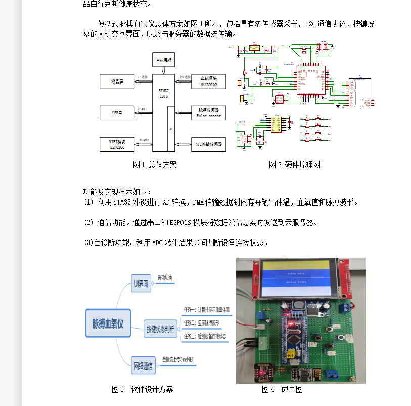 目录一、设计概述 1二、设计方案 21、设计任务 21.对传感器输出的模拟信号进行AD转换 22.在屏幕显示脉搏波形 23.测量并显示心率与体温 24.可与上位机通过USB接口通信 25.按键与屏幕多级菜单设计进行人机交互 26.自动检测设备连接状态 27.数据通过ESP01S上传到服务器,实现远程监测 22、设计思路 2三、 硬件电路设计 3四、 系统程序设计 4五、 传感器简介 81、Pulse sensor 8图四 Pulse Sensor传感器 92、NTC负温度系数热敏电阻 9图五 NTC电阻温度曲线 93、MAX30102血氧模块 9图六 MAX30102模块 10六、成果展示 10图七 总装配图 11图八 脉搏波测量 11七、调试中出现问题的解决 121、调试遇到的问题 122、问题的解决 12八、收获体会 13九、器件明细清单 14参 考 文 献 15一、设计概述仪器是科学技术发展的重要前提和根本保障,是经济发展和国防安全的重要保障,仪器是推进和谐社会建设的重要力量。食品安全问题、公共突发事件、疾病诊断、易燃易爆化学危险品等给人民的生活带来了严重影响,这些问题的解决都离不开先进的检测仪器和手段。血氧饱和度(SpO2)是血液中被氧结合的氧合血红蛋白(HbO2)的容量占全部可结合的血红蛋白(Hb,hemoglobin)容量的百分比,即血液中血氧的浓度,它是呼吸循环的重要生理参数,对人体健康有重要评估价值。血氧仪便应运而生,成为重要的医学仪器之一。传统的血氧饱和度测量方法是先进行人体采血,再利用血气分析仪进行电化学分析,测出血氧分压PO2计算出血氧饱和度。这种方法比较麻烦,且不能进行连续的监测。采用指套式光电传感器,测量时,只需将传感器套在人手指上,利用手指作为盛装血红蛋白的透明容器,使用波长660 nm的红光和940 nm的近红外光作为射入光源,测定通过组织床的光传导强度,来计算血红蛋白浓度及血氧饱和度,仪器即可显示人体血氧饱和度,为临床提供了一种连续无损伤血氧测量仪器。除此之外由于成本低体积小,非常适合作为居家常备的健康监测仪器,深受病人和中老年人的欢迎。