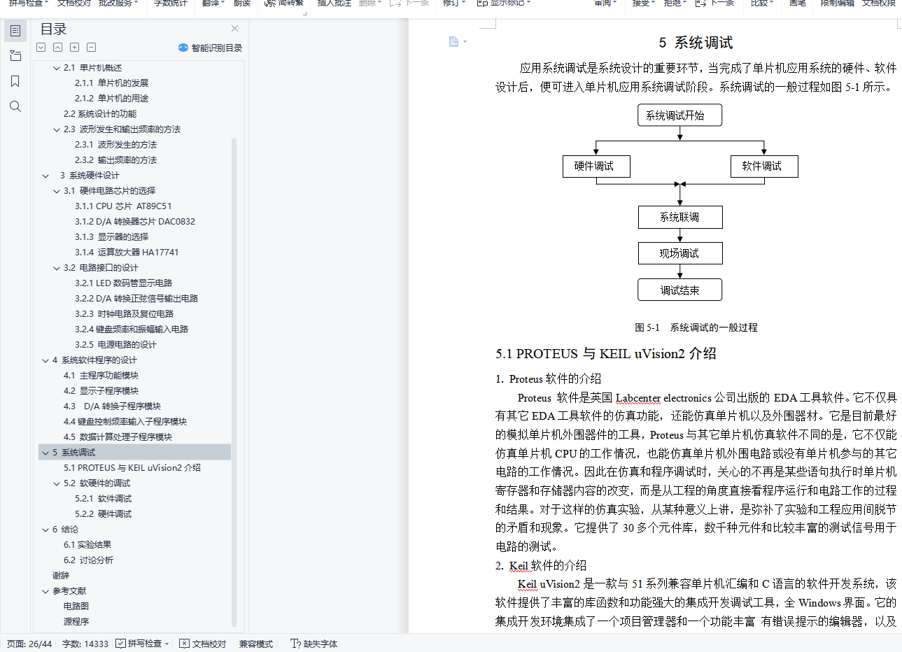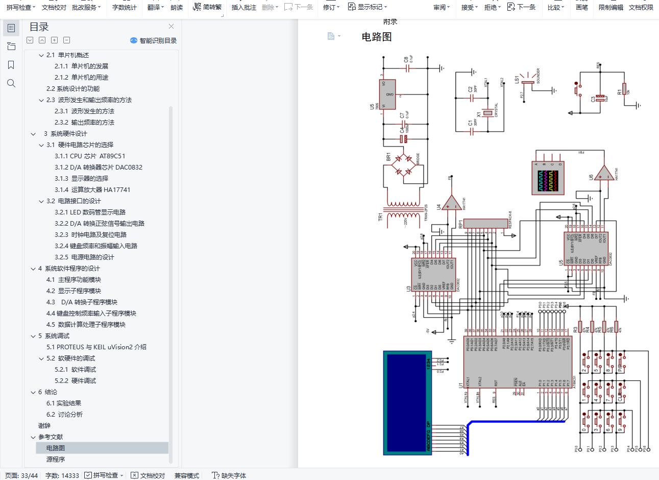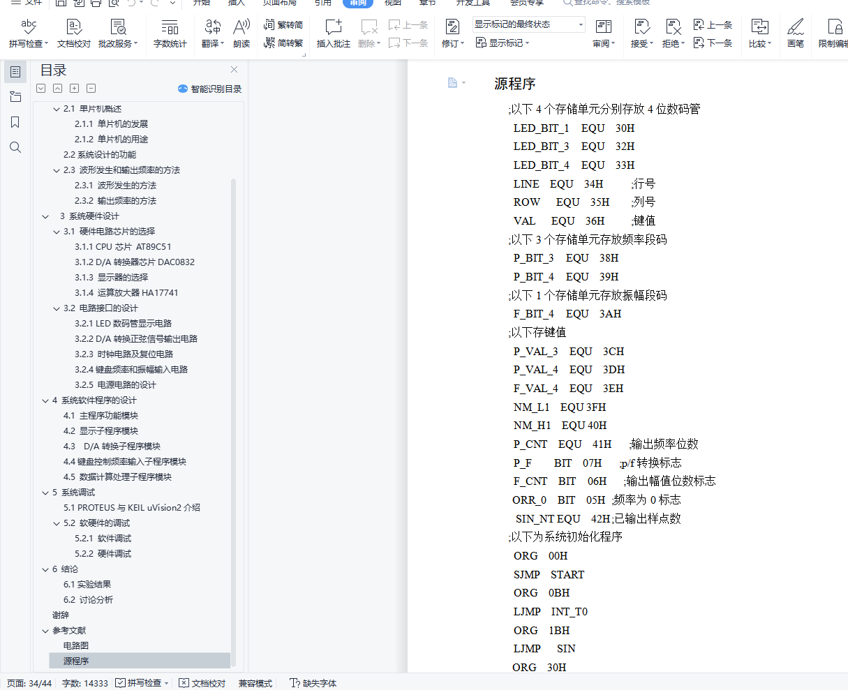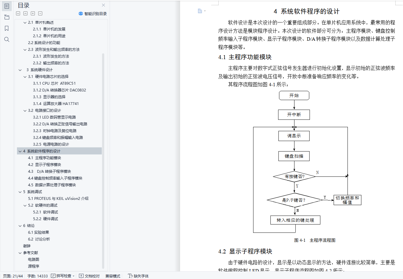 正弦信号发生器的设计摘 要正弦交流信号是一种应用极为广泛的信号。在许多测试仪中需要用标准的正弦信号检测一些物理量。正弦信号用作标准信号时,要求正弦信号必须有较高的精度、稳定度及较低的失真率。传统的正弦信号发生器的频率变动由机械驱动可变元件完成,当这种信号发生器用于低频信号输出往往需要的RC值很大,这样不但参数准确度难以保证,而且体积和功耗都很大。而基于单片机技术和D/A转换电路构成的正弦信号发生器就可以解决这些问题。本文主要介绍了数字式正弦信号发生器的波形产生原理和单片机控制原理。本次设计以单片机技术为基础,通过AT89C51芯片在一定时间内输出一系列的离散数字样点信号,然后通过D/A转换器转换成平滑的正弦波信号,最后通过运算放大器输出。本次设计采用模块化设计的方法,软硬件相结合,硬件设计包括:数码管频率和振幅显示电路、D/A转换正弦信号输出电路、时钟复位电路、键盘频率和振幅输入电路;软件设计包括:显示子程序、D/A转换子程序以及数据计算处理子程序、键盘频率输入子程序。通过软、硬件的结合,既可以实现波形参数的独立连续变化,又具有良好的人机对话界面,原理简单,使用方便。软硬件设计完成后利用KeilμVision2集成开发环境编译该最小系统的程序,利用Proteus仿真软件设计该系统的电路原理图,最后通过两个工具的完美结合对该课题进行系统的软件模拟仿真,结果满足设计要求。本次设计的数字式正弦信号发生器的参数可调,输出波形平滑规则、频率稳定、有较强的实用性。关键词: 单片机 正弦波 信号发生器AbstractThe sine signal is a very extensive application of the signal. the standard sinusoidal signal also beneeded in many tester to detect some physical quantities.Sinusoidal signal as a standard signal, demanded that sinusoidal signal must have a high accuracy, stability and low distortion rate .The traditional sine signal generator of variable frequency is drived by mechanical components, when this signal generator used for low frequency signal output often need RC value greatly, It is hard to ensure accuracy parameters,the volume and power consumption.But based on the single chip microcomputer and D/A transformation of sine signal generator circuit can solve these problems.This paper mainly introduces the sinusoidal signal generator of digital waveform principle and single-chip microcomputer control principle. Design with micro-controller technology as the foundation, by AT89C51 chip in A certain period of D/A number of discrete output series of converter, then wording point signal converting smooth sine signals, through the operational amplifier output. This design USES modular design method, combining software with hardware design, including: digital tube amplitude and frequency display circuit, D/A transformation sinusoidal output circuit, clocking circuit and reset circuit keyboard input frequency and amplitude, Software design includes: display subroutines, D/A transformation and the data processing procedure, keyboard input frequency subroutine subroutine. Through the combination of hardware and software, can achieve continuous variation of parameters, and is independent of good human-machine conversation interface, the principle of simple and easy to use. After the completion of the hardware and software design using Keil muon Vision2 integrated environmental compile the program using the minimum system, Proteus simulation software design of the system through the circuit principle diagram, the perfect combination of two tools on the system software simulation, the results can satisfy the design requirements. The design of digital sine signal generator parameters is adjustable and the output waveform is smooth, stable, and practical.Key words:Micro Controller Unit Sine wave Signal generator目 录1 引言 12 总体结构设计 22.1 单片机概述 22.1.1 单片机的发展 22.1.2 单片机的用途 32.2 系统设计的功能 32.3 波形发生和输出频率的方法 42.3.1 波形发生的方法 42.3.2 输出频率的方法 43 系统硬件设计 53.1 硬件电路芯片的选择 53.1.1 CPU芯片 AT89C51 53.1.2 D/A转换器芯片DAC0832 83.1.3 显示器的选择 93.1.4 运算放大器HA17741 103.2 电路接口的设计 113.2.1 LED数码管显示电路 113.2.2 D/A转换正弦信号输出电路 123.2.3 时钟电路及复位电路 133.2.4 键盘频率和振幅输入电路 153.2.5 电源电路的设计 154 系统软件程序的设计 174.1 主程序功能模块 174.2 显示子程序模块 174.3 D/A转换子程序模块 184.4 键盘控制频率输入子程序模块 194.5 数据计算处理子程序模块 205 系统调试 225.1 PROTEUS与KEIL uVision2介绍 225.2 软硬件的调试 235.2.1 软件调试 235.2.2 硬件调试 236 结论 256.1 实验结果 256.2 讨论分析 25谢辞 27参考文献 28附录 29电路图 29源程序 30