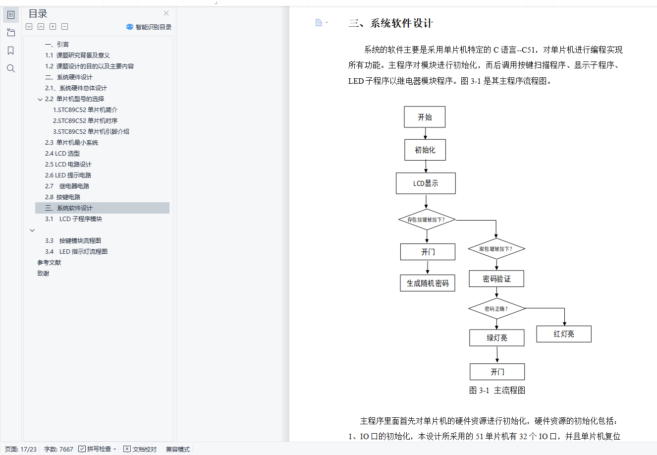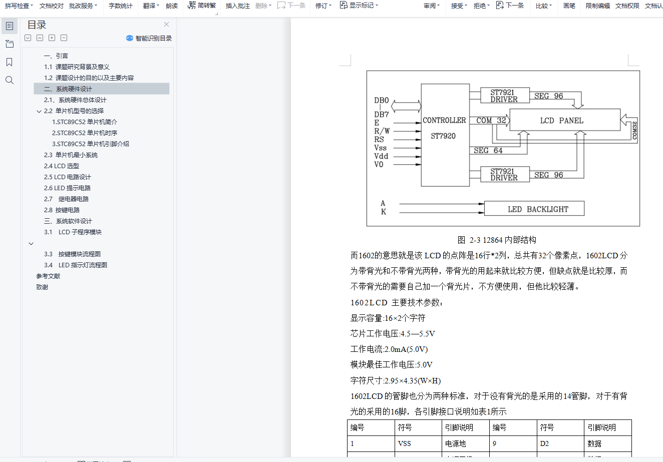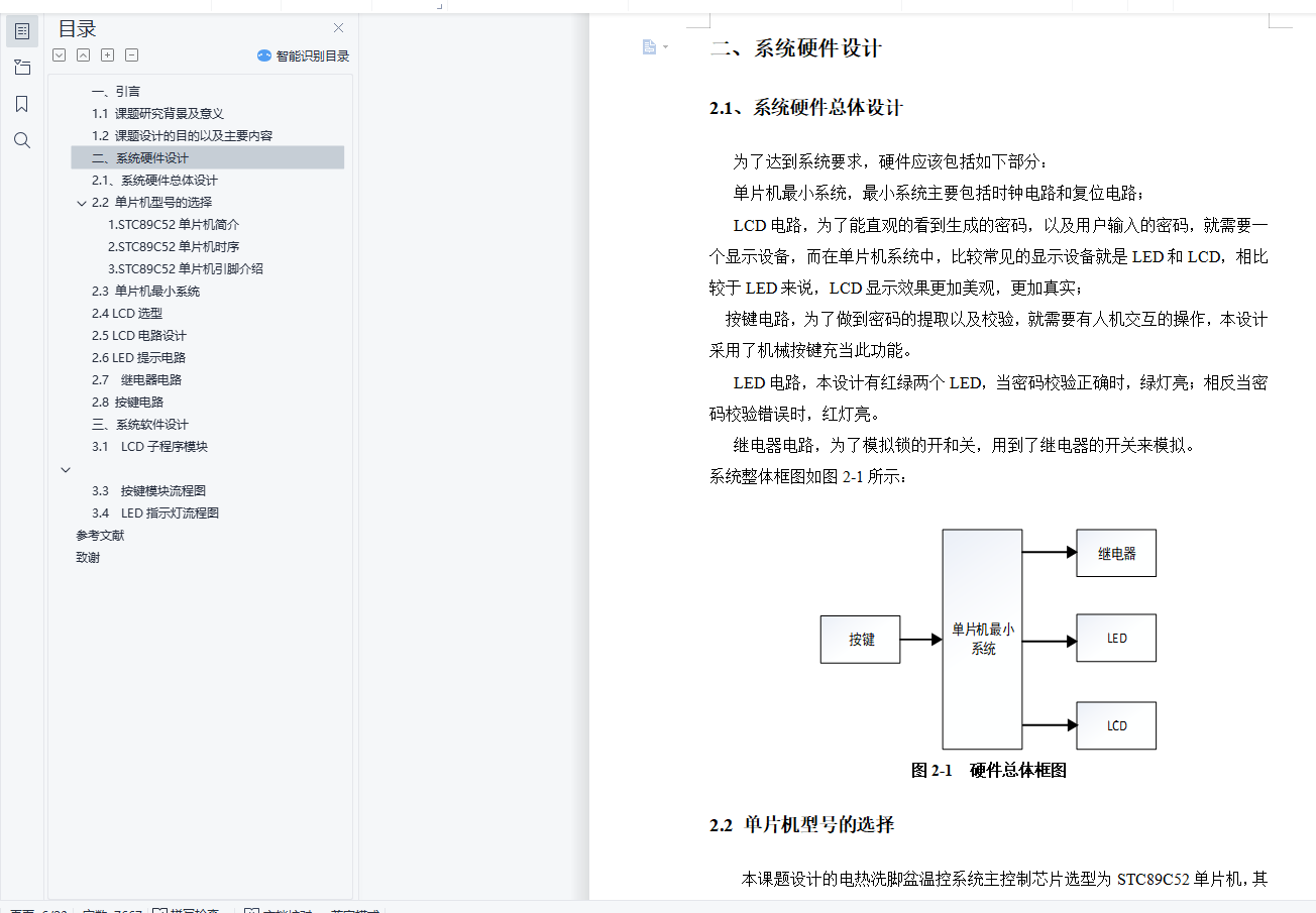 摘 要随着微机测量和控制技术的迅速发展与广泛应用,以单片机为核心的电子密码锁的设计研发与应用在很大程度上改善了人们的生活,尤其是在一些公共场合(比如大型超市)保存私人物品等方面起到了不可估量的作用。本设计论述了一种以STC89C52单片机为主控制单元,以LCD1602为显示器件的电密码锁系统。该控制系统可以每次随机生成四位数的密码,并显示在LCD上,用户记住改密码后进行输入并核对是否正确。系统设计了相关的硬件电路和相关应用程序。硬件电路主要包括STC89C52单片机最小系统,LCD显示电路、LED指示电路,按键电路等等。系统程序主要包括主程序,密码生成和校验程序、LCD显示程序以及按键模块程序等。关键词: 密码;单片机;LCD1602AbstractAlong with the rapid development and wide application of computer measurement and control technology, single-chip microcomputer as the core of the electronic code lock design development and application in a large extent improve the people's lives, especially in some public places (such as large supermarket) save private goods, to an immeasurable role. The design of a STC89C52 microcontroller based control unit, with LCD1602 as the display device of the electrical code lock system. The control system can be randomly generated four digit password, and displayed on the LCD, the user remember to change the password after the input and check whether the correct. The related hardware circuit and related applications are designed. The hardware circuit mainly includes STC89C52 MCU minimum system, LCD display circuit, LED indication circuit, key circuit and so on. System program mainly includes the main program, password generation and calibration procedures, LCD display program, as well as key module program, etc..[Keywords] : Password;MCU;LCD1602目 录一、引言 31.1 课题研究背景及意义 31.2 课题设计的目的以及主要内容 4二、系统硬件设计 52.1、系统硬件总体设计 52.2 单片机型号的选择 61.STC89C52单片机简介 62.STC89C52单片机时序 73.STC89C52单片机引脚介绍 72.3 单片机最小系统 92.4 LCD选型 112.5 LCD电路设计 132.6 LED提示电路 142.7 继电器电路 142.8 按键电路 14三、系统软件设计 163.1 LCD子程序模块 173.3 按键模块流程图 193.4 LED指示灯流程图 20参考文献 21致谢 22