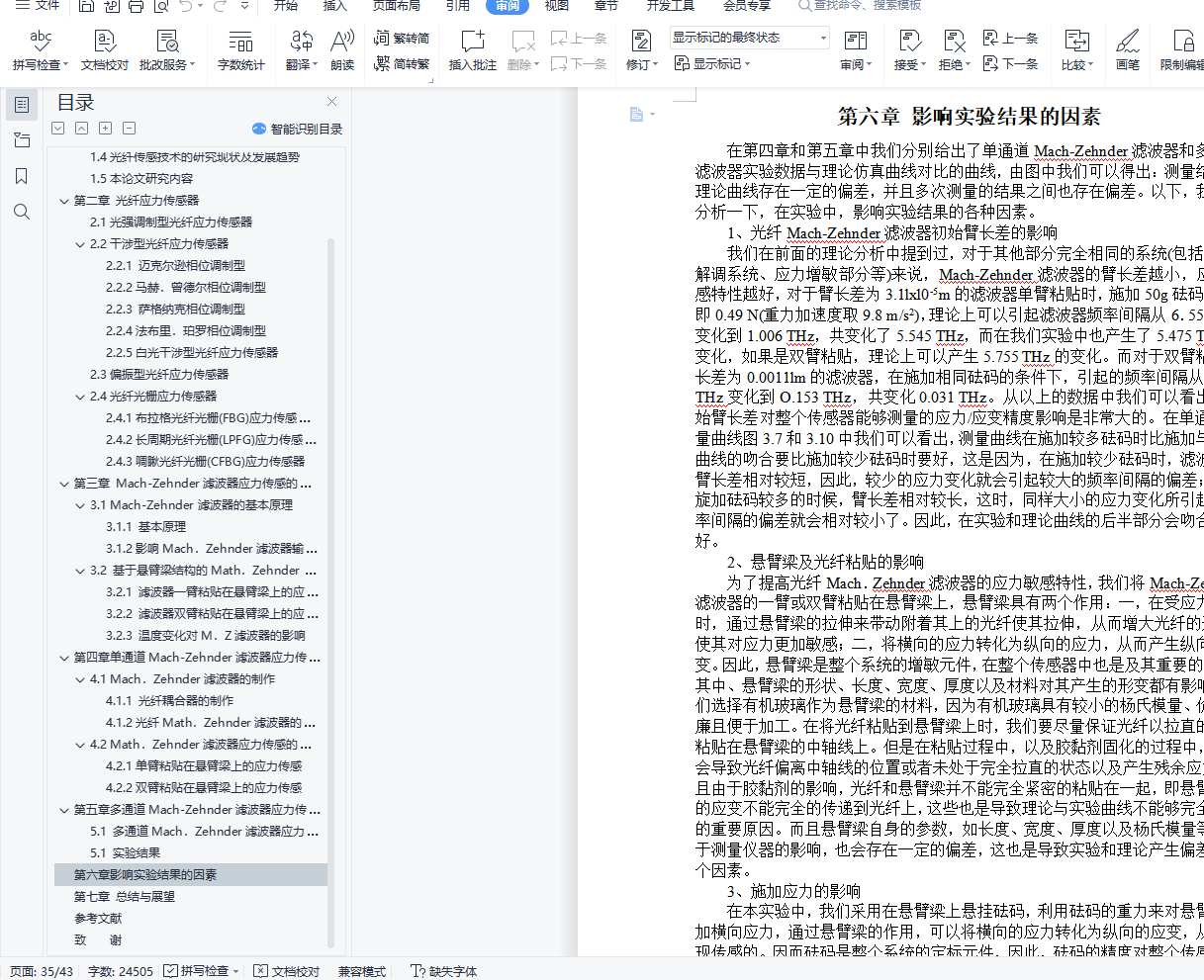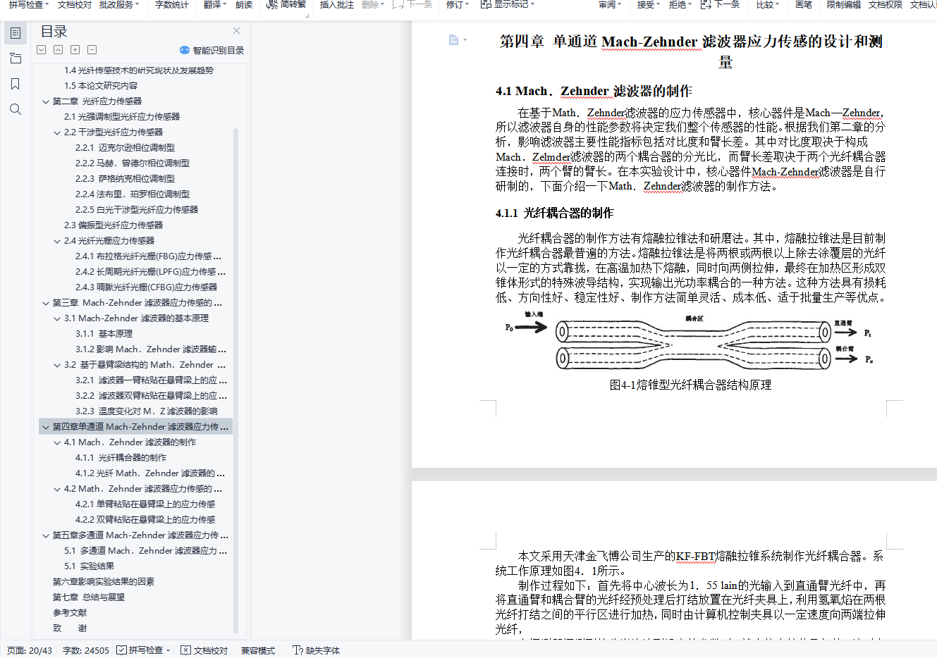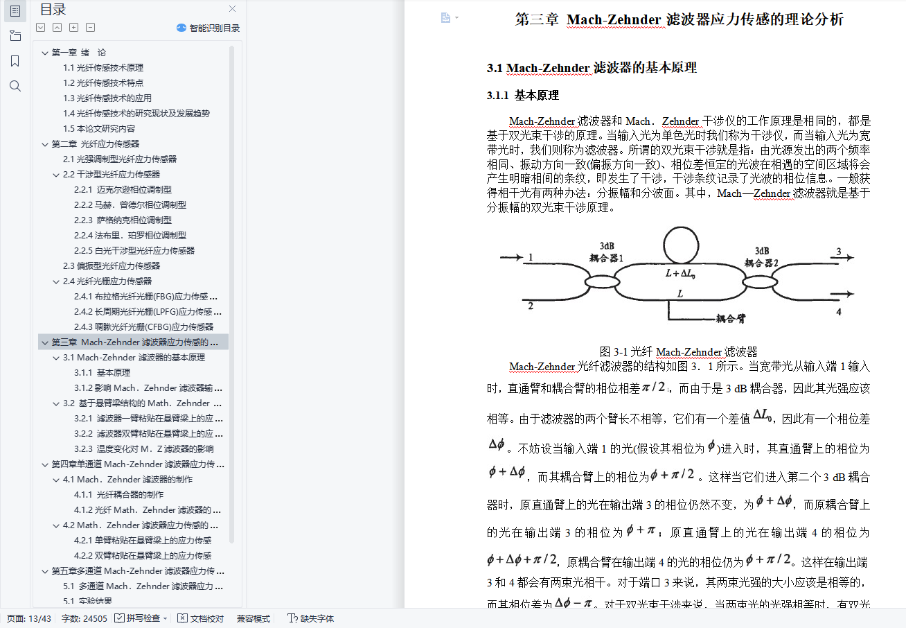 光纤传感器应力传感研究摘 要无论是在大型建筑工程还是精细结构的监测中,应力传感都是一个极为重要的部分。光纤应力传感器作为应力传感器的一种,展示出了强大的生命力和广阔的发展前景。而基于波长编码的光纤传感器,由于不受光强波动的影响,并且易于实现波分复用而在光纤传感器中脱颖而出。本文提出了一种基于Mach-Zehnder滤波器结构的光纤应力传感器。该传感器具有波长编码的特性。研究了它的单通道和多通道两种传感模型,而单通道传感模型又分为滤波器单臂粘贴在悬臂梁上和双臂粘贴的两种模型。其中多通道传感器就是一个小型的波分复用系统。本文从理论上分析了Mach-Zehnder滤波器的应力敏感特性,并对影响其敏感特性的因素进行讨论。在理论分析的基础上,搭建光路从实验上对其可行性进行验证,并对影响实验结果的因素进行了分析。关键词:光纤Mach.Zehnder滤波器;应力传感;波长编码;悬臂梁AbstractWhether in large construction projects or the fine structure of the monitoring, stress sensing is a very important part of. fiber stress sensor as a stress sensor, demonstrating a strong vitality and broad prospects for development. The fiber optic sensor based on wavelength encoding, the absence of any light intensity fluctuations, and easy to the achievement of WDM in fiber optic sensors stand out.This paper presents a filter structure based on Mach-Zehnder optical stress sensor. The sensor has a wavelength encoding features. Study of its single-channel and multi-channel two kinds of sensor models and the single sensor model is divided into the filter attached to the cantilever arm and the arms paste on two models. One sensor is a small multi-channel WDM system. In this paper, theoretical analysis of the Mach-Zehnder filter characteristics of the stress-sensitive, and the factors affecting the sensitive nature of discussions. In the theoretical analysis, based on the structures on the light path from the experimental verification of its feasibility, and the factors that affect the experimental results were analyzed.Keywords: fiber optic Mach. Zehnder filter; stress sensor; wavelength encoding; cantilever目 录第一章 绪 论 41.1光纤传感技术原理 41.2光纤传感技术特点 51.3光纤传感技术的应用 51.4光纤传感技术的研究现状及发展趋势 61.5本论文研究内容 7第二章 光纤应力传感器 82.1光强调制型光纤应力传感器 82.2干涉型光纤应力传感器 82.2.1 迈克尔逊相位调制型 92.2.2马赫.曾德尔相位调制型 92.2.3 萨格纳克相位调制型 92.2.4法布里.珀罗相位调制型 102.2.5白光干涉型光纤应力传感器 102.3偏振型光纤应力传感器 112.4光纤光栅应力传感器 112.4.1布拉格光纤光栅(FBG)应力传感器 112.4.2长周期光纤光栅(LPFG)应力传感器 122.4.3啁瞅光纤光栅(CFBG)应力传感器 12第三章 Mach-Zehnder滤波器应力传感的理论分析 133.1 Mach-Zehnder滤波器的基本原理 133.1.1 基本原理 133.1.2影响Mach.Zehnder滤波器输出功率谱的因素 143.2 基于悬臂梁结构的Math.Zehnder滤波器应力传感原理 153.2.1 滤波器一臂粘贴在悬臂梁上的应力传感 153.2.2 滤波器双臂粘贴在悬臂梁上的应力传感 163.2.3 温度变化对M.Z滤波器的影响 18第四章 单通道Mach-Zehnder滤波器应力传感的设计和测量 204.1 Mach.Zehnder滤波器的制作 204.1.1 光纤耦合器的制作 204.1.2光纤Math.Zehnder滤波器的构成 224.2 Math.Zehnder滤波器应力传感的实现 224.2.1单臂粘贴在悬臂梁上的应力传感 224.2.2双臂粘贴在悬臂梁上的应力传感 27第五章多通道Mach-Zehnder滤波器应力传感研究 305.1 多通道Mach.Zehnder滤波器应力传感器的系统构成 305.1 实验结果 32第六章 影响实验结果的因素 34第七章 总结与展望 37参考文献 38致 谢 42