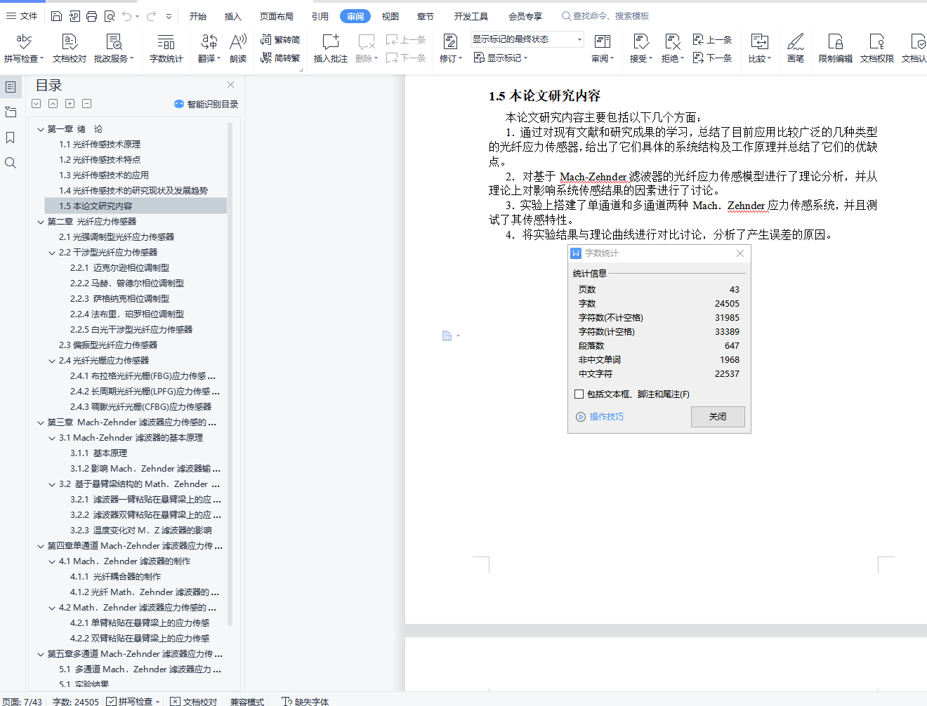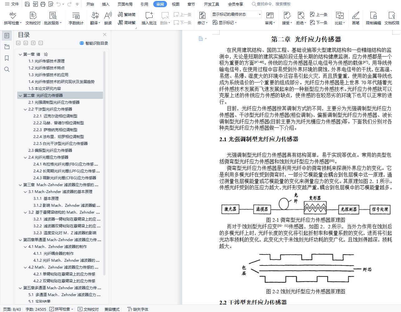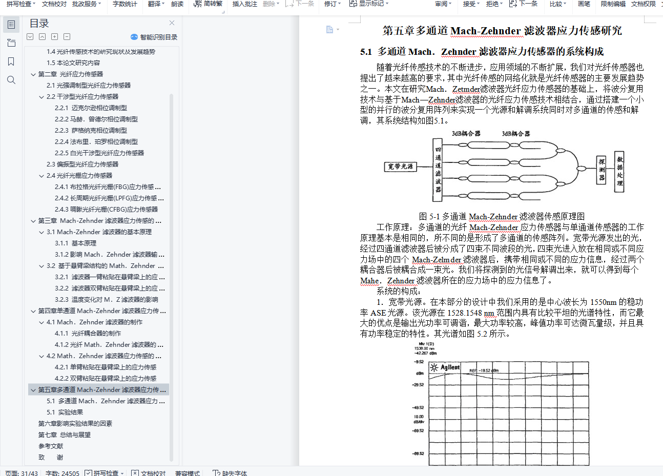 光纤传感器应力传感研究摘 要无论是在大型建筑工程还是精细结构的监测中,应力传感都是一个极为重要的部分。光纤应力传感器作为应力传感器的一种,展示出了强大的生命力和广阔的发展前景。而基于波长编码的光纤传感器,由于不受光强波动的影响,并且易于实现波分复用而在光纤传感器中脱颖而出。本文提出了一种基于Mach-Zehnder滤波器结构的光纤应力传感器。该传感器具有波长编码的特性。研究了它的单通道和多通道两种传感模型,而单通道传感模型又分为滤波器单臂粘贴在悬臂梁上和双臂粘贴的两种模型。其中多通道传感器就是一个小型的波分复用系统。本文从理论上分析了Mach-Zehnder滤波器的应力敏感特性,并对影响其敏感特性的因素进行讨论。在理论分析的基础上,搭建光路从实验上对其可行性进行验证,并对影响实验结果的因素进行了分析。关键词:光纤Mach.Zehnder滤波器;应力传感;波长编码;悬臂梁AbstractWhether in large construction projects or the fine structure of the monitoring, stress sensing is a very important part of. fiber stress sensor as a stress sensor, demonstrating a strong vitality and broad prospects for development. The fiber optic sensor based on wavelength encoding, the absence of any light intensity fluctuations, and easy to the achievement of WDM in fiber optic sensors stand out.This paper presents a filter structure based on Mach-Zehnder optical stress sensor. The sensor has a wavelength encoding features. Study of its single-channel and multi-channel two kinds of sensor models and the single sensor model is divided into the filter attached to the cantilever arm and the arms paste on two models. One sensor is a small multi-channel WDM system. In this paper, theoretical analysis of the Mach-Zehnder filter characteristics of the stress-sensitive, and the factors affecting the sensitive nature of discussions. In the theoretical analysis, based on the structures on the light path from the experimental verification of its feasibility, and the factors that affect the experimental results were analyzed.Keywords: fiber optic Mach. Zehnder filter; stress sensor; wavelength encoding; cantilever目 录第一章 绪 论 41.1光纤传感技术原理 41.2光纤传感技术特点 51.3光纤传感技术的应用 51.4光纤传感技术的研究现状及发展趋势 61.5本论文研究内容 7第二章 光纤应力传感器 82.1光强调制型光纤应力传感器 82.2干涉型光纤应力传感器 82.2.1 迈克尔逊相位调制型 92.2.2马赫.曾德尔相位调制型 92.2.3 萨格纳克相位调制型 92.2.4法布里.珀罗相位调制型 102.2.5白光干涉型光纤应力传感器 102.3偏振型光纤应力传感器 112.4光纤光栅应力传感器 112.4.1布拉格光纤光栅(FBG)应力传感器 112.4.2长周期光纤光栅(LPFG)应力传感器 122.4.3啁瞅光纤光栅(CFBG)应力传感器 12第三章 Mach-Zehnder滤波器应力传感的理论分析 133.1 Mach-Zehnder滤波器的基本原理 133.1.1 基本原理 133.1.2影响Mach.Zehnder滤波器输出功率谱的因素 143.2 基于悬臂梁结构的Math.Zehnder滤波器应力传感原理 153.2.1 滤波器一臂粘贴在悬臂梁上的应力传感 153.2.2 滤波器双臂粘贴在悬臂梁上的应力传感 163.2.3 温度变化对M.Z滤波器的影响 18第四章 单通道Mach-Zehnder滤波器应力传感的设计和测量 204.1 Mach.Zehnder滤波器的制作 204.1.1 光纤耦合器的制作 204.1.2光纤Math.Zehnder滤波器的构成 224.2 Math.Zehnder滤波器应力传感的实现 224.2.1单臂粘贴在悬臂梁上的应力传感 224.2.2双臂粘贴在悬臂梁上的应力传感 27第五章多通道Mach-Zehnder滤波器应力传感研究 305.1 多通道Mach.Zehnder滤波器应力传感器的系统构成 305.1 实验结果 32第六章 影响实验结果的因素 34第七章 总结与展望 37参考文献 38致 谢 42