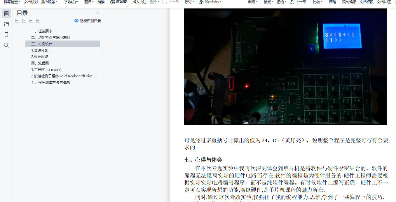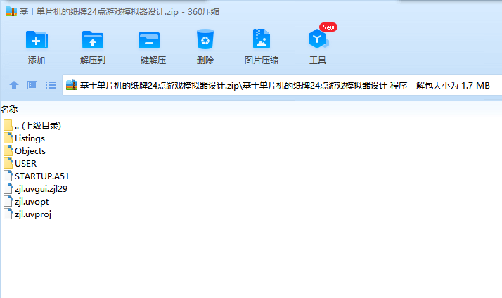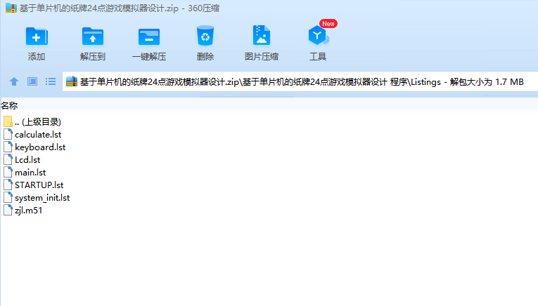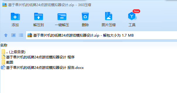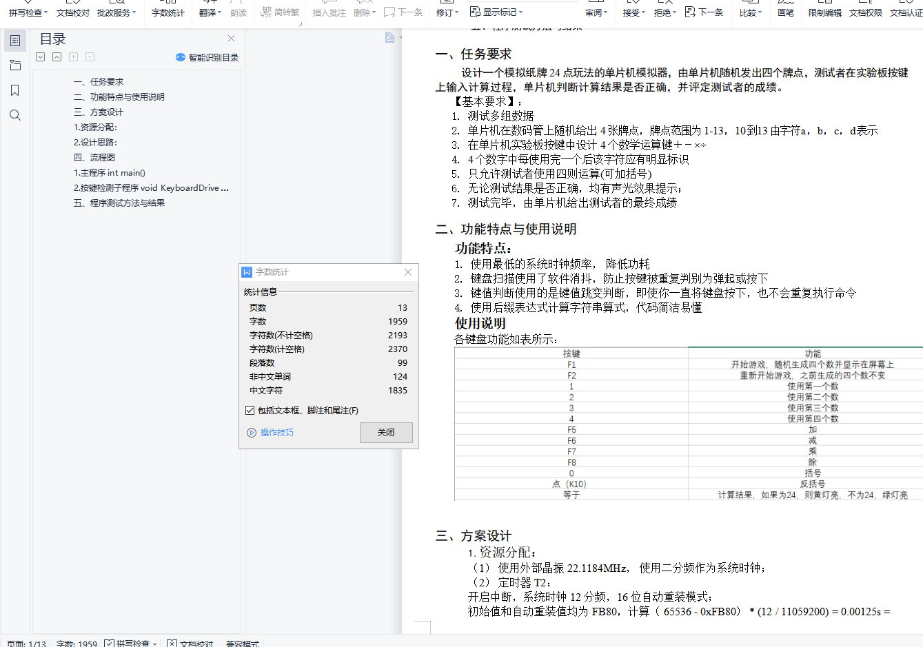 目录一、任务要求 1二、功能特点与使用说明 1三、方案设计 11. 资源分配: 12. 设计思路: 3四、流程图 41. 主程序 int main() 52. 按键检测子程序 void KeyboardDriver() 6五、程序测试方法与结果 11一、任务要求设计一个模拟纸牌 24 点玩法的单片机模拟器,由单片机随机发出四个牌点,测试者在实验板按键上输入计算过程,单片机判断计算结果是否正确,并评定测试者的成绩。【基本要求】:1.测试多组数据2.单片机在数码管上随机给出 4 张牌点,牌点范围为 1-13,10 到 13 由字符 a,b,c,d 表示3.在单片机实验板按键中设计 4 个数学运算键+-×÷4.4 个数字中每使用完一个后该字符应有明显标识5.只允许测试者使用四则运算(可加括号)6.无论测试结果是否正确,均有声光效果提示;7.测试完毕,由单片机给出测试者的最终成绩