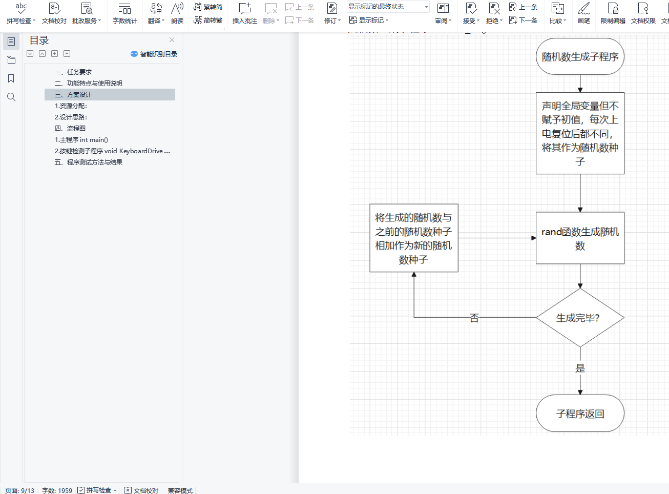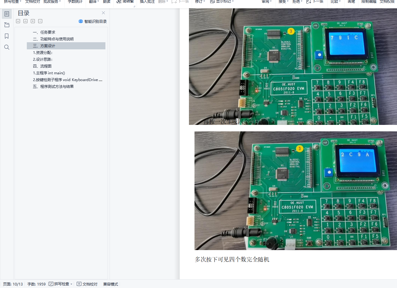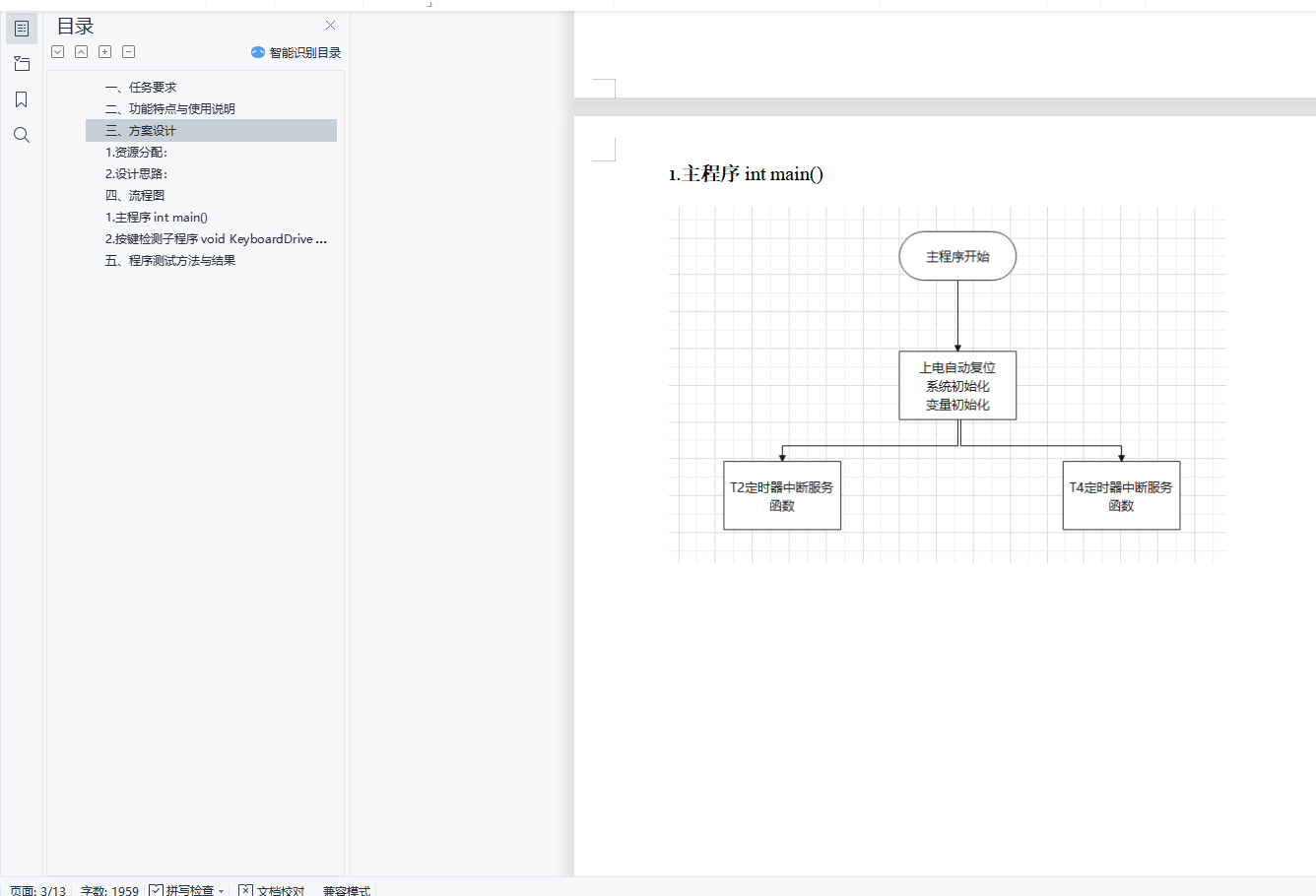 目录一、任务要求 1二、功能特点与使用说明 1三、方案设计 11. 资源分配: 12. 设计思路: 3四、流程图 41. 主程序 int main() 52. 按键检测子程序 void KeyboardDriver() 6五、程序测试方法与结果 11一、任务要求设计一个模拟纸牌 24 点玩法的单片机模拟器,由单片机随机发出四个牌点,测试者在实验板按键上输入计算过程,单片机判断计算结果是否正确,并评定测试者的成绩。【基本要求】:1.测试多组数据2.单片机在数码管上随机给出 4 张牌点,牌点范围为 1-13,10 到 13 由字符 a,b,c,d 表示3.在单片机实验板按键中设计 4 个数学运算键+-×÷4.4 个数字中每使用完一个后该字符应有明显标识5.只允许测试者使用四则运算(可加括号)6.无论测试结果是否正确,均有声光效果提示;7.测试完毕,由单片机给出测试者的最终成绩