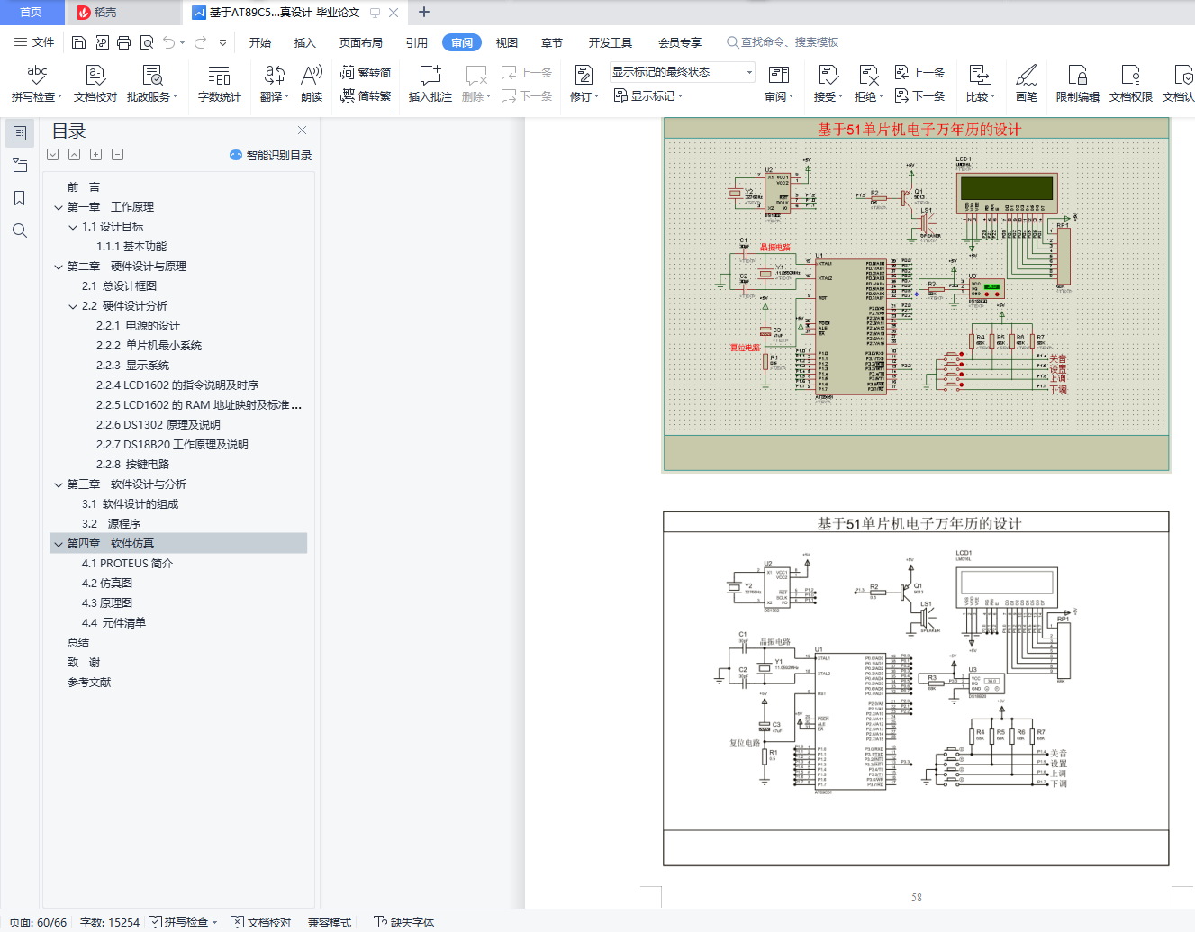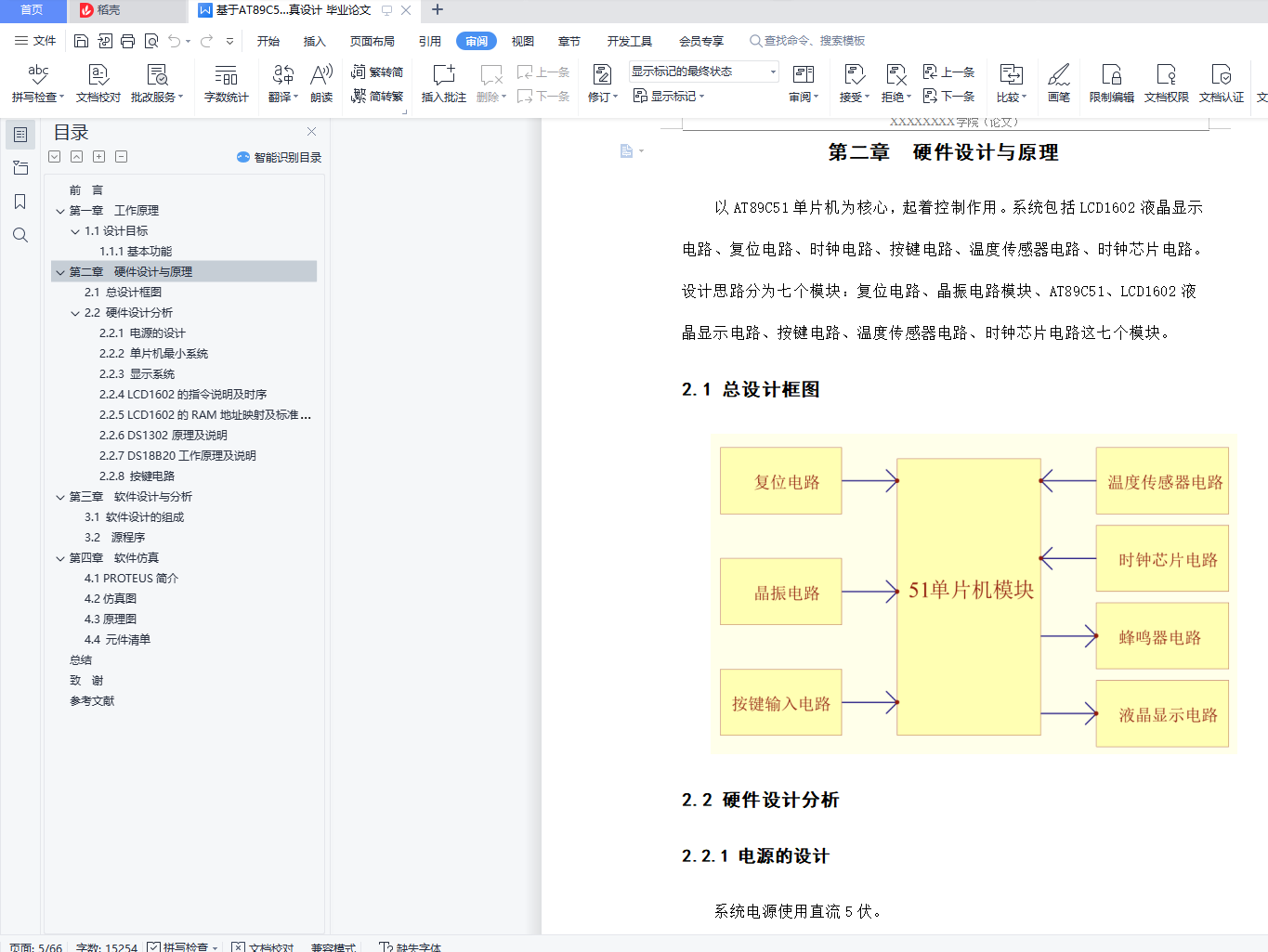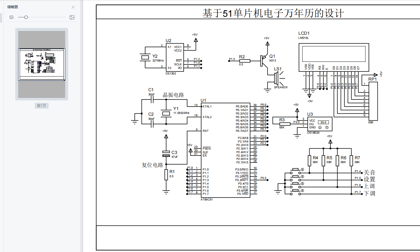 摘 要电子万年历是一种应用非常广泛日常计时工具,对现代社会越来越重要。此电子万年历在硬件方面主要采用AT89C51单片机作为主控核心,由DS1302时钟芯片提供时钟、LCD1602液晶显示屏显示。AT89C51单片机是由STC公司推出的,功耗小,电压可选用4~6V电压供电;DS1302时钟芯片是美国DALLAS公司推出的低功耗实时时钟芯片,它可以对年、月、日、星期、时、分、秒进行计时,还具有闰年补偿等多种功能,而且DS1302的使用寿命长,误差小;对于数字电子万年历采用直观的数字显示,数字显示是采用的LCD1602液晶显示屏来显示,可以同时显示年、月、日、星期、时、分、秒等信息。此外,该电子万年历还具有时间校准等功能。在软件方面,主要包括日历程序、时间调整程序,显示程序等。所有程序编写完成后,在Keil软件中进行调试,确定没有问题后,烧写到单片机上进行测试。此设计主要由时钟芯片DS1302和温度传感器DS18B20采集数据到单片机进行处理再通过LCD1602显示出来,本论文主要研究了液晶显示器LCD1602及时钟芯片DS1302,温度传感器DS18B20与单片机之间的硬件互联及通信,对数种硬件连接方案进行了详尽的比较,在软件方面对日历算法也进行了论述。【关键词】AT89C51 LCD1602 DS18B20 DS1302 按键目录前 言 1第一章 工作原理 21.1设计目标 21.1.1基本功能 2第二章 硬件设计与原理 32.1 总设计框图 32.2 硬件设计分析 32.2.1 电源的设计 32.2.2 单片机最小系统 42.2.3 显示系统 102.2.4 LCD1602的指令说明及时序 122.2.5 LCD1602的RAM地址映射及标准字库表 142.2.6 DS1302原理及说明 162.2.7 DS18B20工作原理及说明 192.2.8 按键电路 20第三章 软件设计与分析 223.1 软件设计的组成 223.2 源程序 26第四章 软件仿真 564.1 PROTEUS简介 564.2仿真图 584.3原理图 594.4 元件清单 60总结 61致 谢 63参考文献 64
