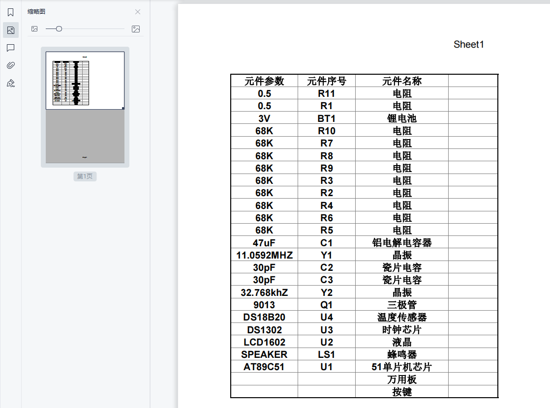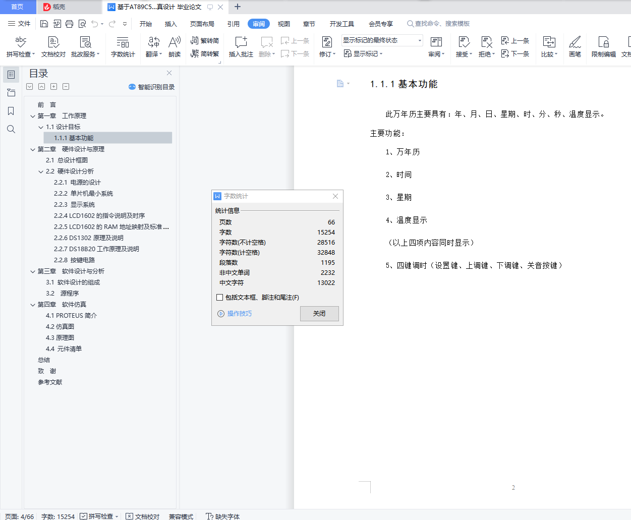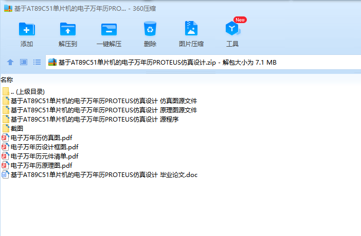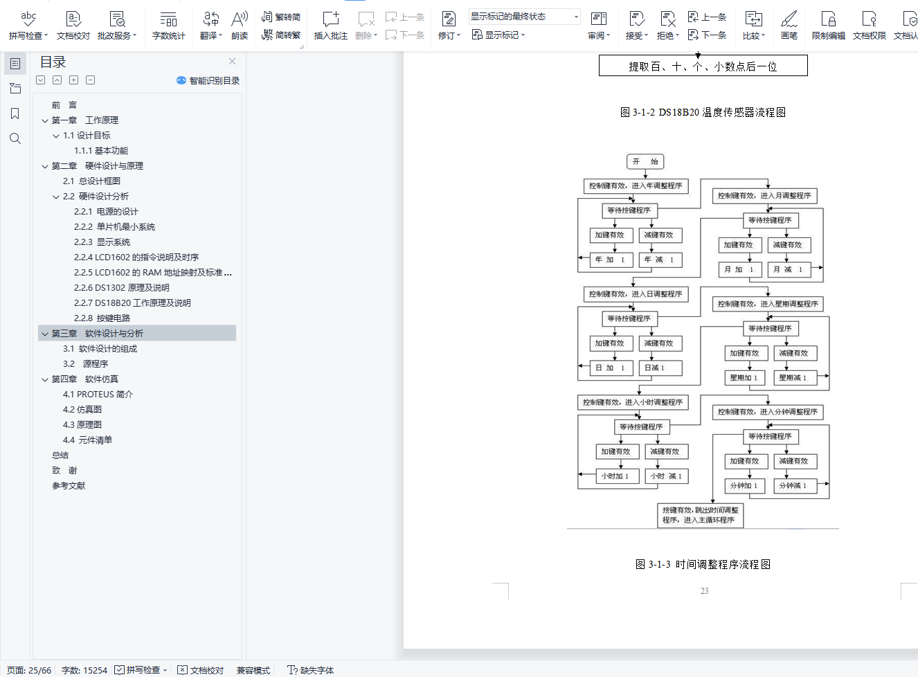 摘 要电子万年历是一种应用非常广泛日常计时工具,对现代社会越来越重要。此电子万年历在硬件方面主要采用AT89C51单片机作为主控核心,由DS1302时钟芯片提供时钟、LCD1602液晶显示屏显示。AT89C51单片机是由STC公司推出的,功耗小,电压可选用4~6V电压供电;DS1302时钟芯片是美国DALLAS公司推出的低功耗实时时钟芯片,它可以对年、月、日、星期、时、分、秒进行计时,还具有闰年补偿等多种功能,而且DS1302的使用寿命长,误差小;对于数字电子万年历采用直观的数字显示,数字显示是采用的LCD1602液晶显示屏来显示,可以同时显示年、月、日、星期、时、分、秒等信息。此外,该电子万年历还具有时间校准等功能。在软件方面,主要包括日历程序、时间调整程序,显示程序等。所有程序编写完成后,在Keil软件中进行调试,确定没有问题后,烧写到单片机上进行测试。此设计主要由时钟芯片DS1302和温度传感器DS18B20采集数据到单片机进行处理再通过LCD1602显示出来,本论文主要研究了液晶显示器LCD1602及时钟芯片DS1302,温度传感器DS18B20与单片机之间的硬件互联及通信,对数种硬件连接方案进行了详尽的比较,在软件方面对日历算法也进行了论述。【关键词】AT89C51 LCD1602 DS18B20 DS1302 按键目录前 言 1第一章 工作原理 21.1设计目标 21.1.1基本功能 2第二章 硬件设计与原理 32.1 总设计框图 32.2 硬件设计分析 32.2.1 电源的设计 32.2.2 单片机最小系统 42.2.3 显示系统 102.2.4 LCD1602的指令说明及时序 122.2.5 LCD1602的RAM地址映射及标准字库表 142.2.6 DS1302原理及说明 162.2.7 DS18B20工作原理及说明 192.2.8 按键电路 20第三章 软件设计与分析 223.1 软件设计的组成 223.2 源程序 26第四章 软件仿真 564.1 PROTEUS简介 564.2仿真图 584.3原理图 594.4 元件清单 60总结 61致 谢 63参考文献 64