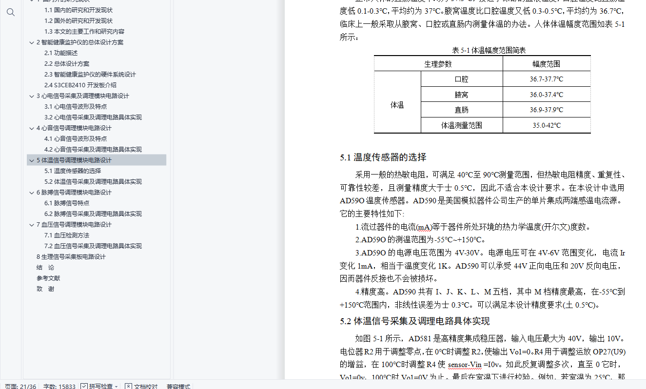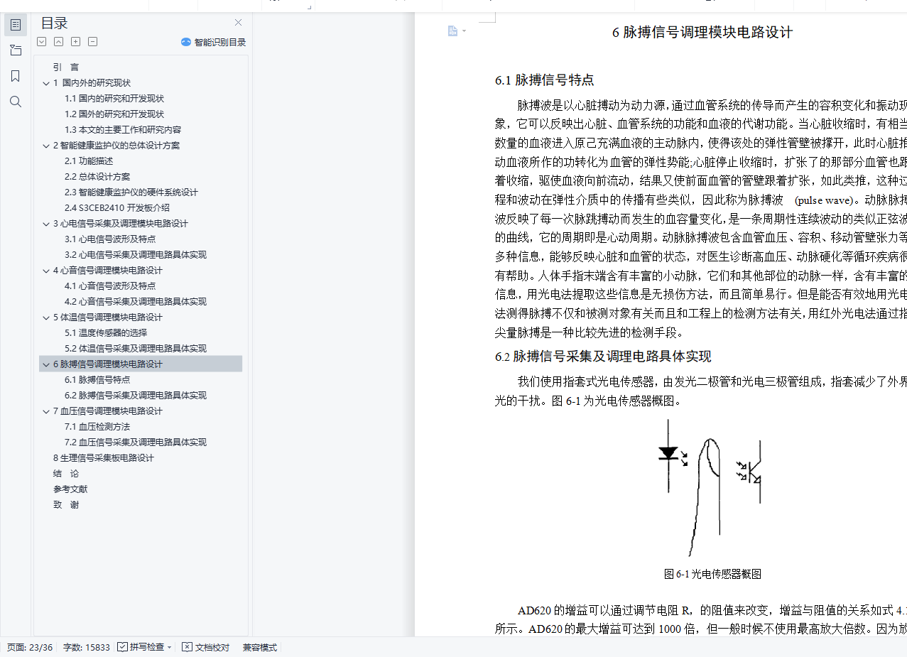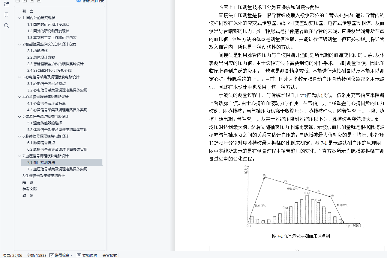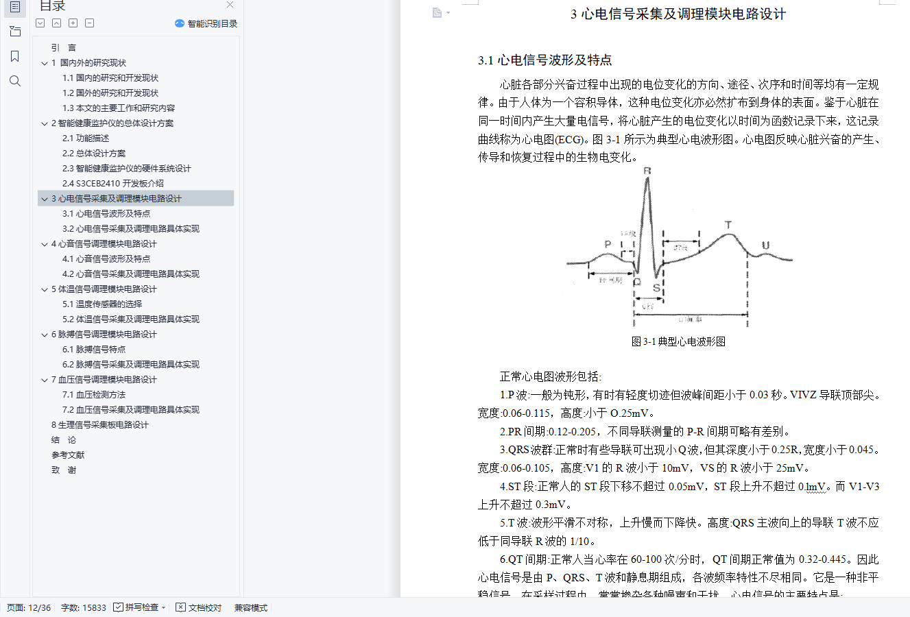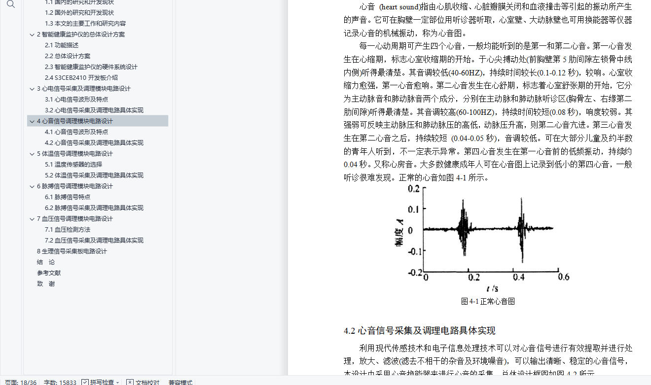 摘 要随着生活水平的不断提高,人们对健康保健和常规检查越来越重视。而且社会老龄化的不断加剧,老年人健康问题也成为了深受社会关注的问题。但是目前的医疗设施水平还远远不能满足社会需求。因此,研究一种新的医疗设备势在必行。智能健康监护仪就成为解决上述问题的有效途径。本文研究的智能健康监护仪可以实现对病人血压、体温、心电、心音、脉搏等参数的实时监护,具有良好的可扩展性和灵活性。本智能健康监护仪可对多项人体生理参数(体温、血压、脉搏、心电、心音)进行采集和分析,从中得到关于用户健康状况的信息。同时,本系统还可通过多种接口将信息传送至PC,并可以通过5G网络将信息发送至手机等移动式设备。本产品扩展性强、便携、易用,在个人保健等方面有较好的发展前景。本文研发的智能健康监护仪克服了传统监护仪体积大、附件多、有线检测传输方式、组网不方便、检测参数单一等缺点。其主要功能包括人体血压、心率、体温、脉搏、心音等生理参数的检测和显示,并提供无线接口,用户可以转发监护仪上传的健康数据。关键词:监护仪;5G网络;生理参数;心音测量;检测传输ABSTRACTWith the continuous improvement of living standards, people pay more attention to the health and regular examination . And the growing aging society, the elderly health problems have become a popular social concerns. However, the current level of health care facilities can not satisfy the needs of society. Therefore, the study of a new medical equipment is imperative. Intelligent health monitor has become an effective way to resolve these issues. In this paper, intelligent health monitor allows the patient blood pressure, body temperature,heart sounds, pulse and other parameters of the real-time monitoring, has good scalability and flexibility.The intelligent health monitor can a number of physiological parameters (body temperature, blood pressure, pulse, ECG, heart sound) for collection and analysis, derive information on the health status of the user. At the same time, the system can transmit the information through a variety of interfaces to the PC, and can send information through the 5G network to the mobile phone or mobile device. This product is extensible, portable, easy to use, in the personal care such as better prospects for development.This paper, the intelligent health monitor to overcome the traditional bulky monitors, accessories and more, cable test transmission, networking is not convenient, single test parameters and other shortcomings. Its main functions include human blood pressure, heart rate, body temperature, pulse, heart sound detection and other physiological parameters and display, and wireless interfaces, the user can transmit monitor upload health data.Keywords: Monitor; 5G network; physiological parameters; heart sound measurement;test transmission目 录引言 11 国内外的研究现状 31.1国内的研究和开发现状 31.2国外的研究和开发现状 31.3本文的主要工作和研究内容 42智能健康监护仪的总体设计方案 52.1功能描述 52.2总体设计方案 52.3智能健康监护仪的硬件系统设计 62.4 S3CEB2410开发板介绍 73心电信号采集及调理模块电路设计 93.1心电信号波形及特点 93.2心电信号采集及调理电路具体实现 104心音信号调理模块电路设计 144.1心音信号波形及特点 144.2心音信号采集及调理电路具体实现 145体温信号调理模块电路设计 175.1温度传感器的选择 175.2体温信号采集及调理电路具体实现 176脉搏信号调理模块电路设计 196.1脉搏信号特点 196.2脉搏信号采集及调理电路具体实现 197血压信号调理模块电路设计 217.1血压检测方法 217.2血压信号采集及调理电路具体实现 228生理信号采集板电路设计 27结 论 29参考文献 30致 谢 32