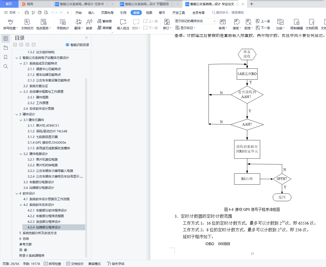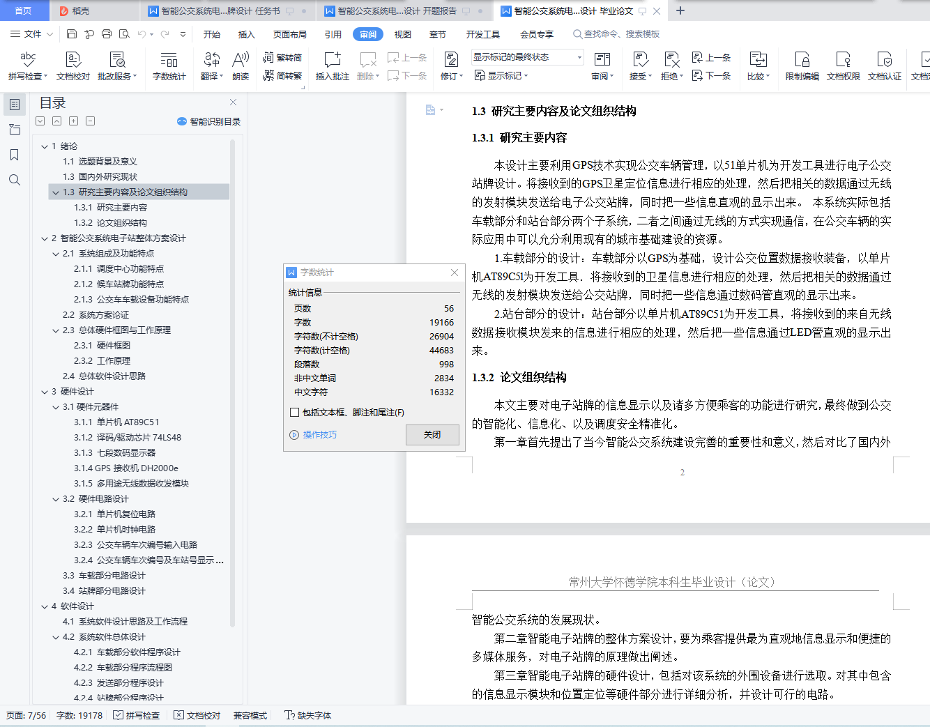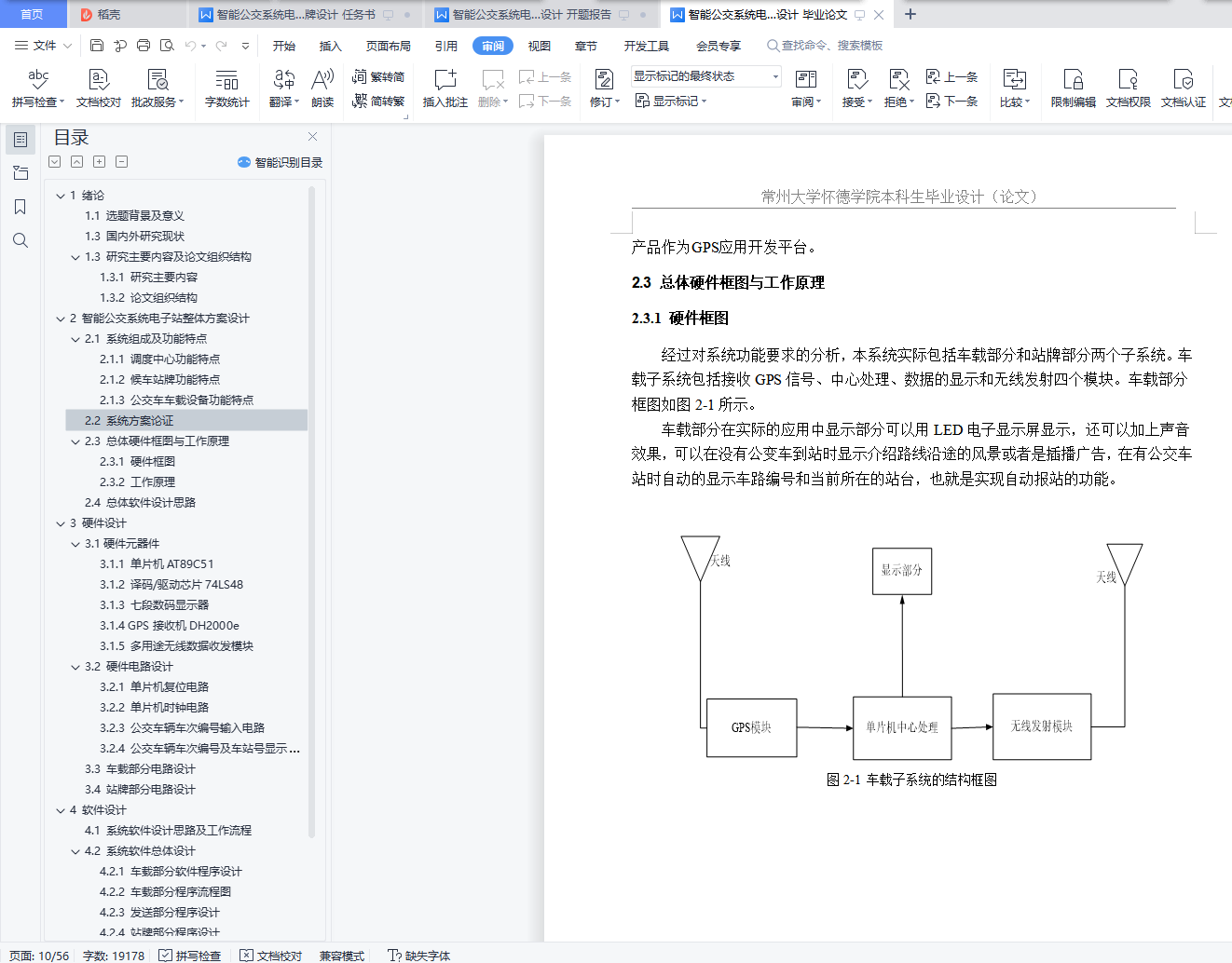 摘 要:智能公交系统的建设可以提高人们出行对公共交通的选择,减少了私家车的使用,降低了环境污染,节约了能源的消耗,而且智能公交车运载量大,人均占用道路面积小,减小了城市拥堵问题,便利了人们的出行。本文主要对电子站牌的信息显示以及诸多方便乘客的功能进行研究,最终做到公交的智能化、信息化、以及调度安全精准化的目标。研究内容对智能电子站牌的整体方案设计,具体设计工作包括车载部分设计和站台部分设计。车载部分设计以单片机AT89C51为开发工具,并利用GPS为基础,将接收到的卫星信息进行处理,然后将数据通过无线发射模块发送给公交站牌。整个系统包括接收GPS信号、中心处理、数据的显示和无线发射四个模块。站台部分设计以单片机AT89C5l为开发工具,将接收到的来自无线数据接收模块发来的信息进行相应的处理,然后把一些信息通过数码管和发光二极管直观的显示出来。