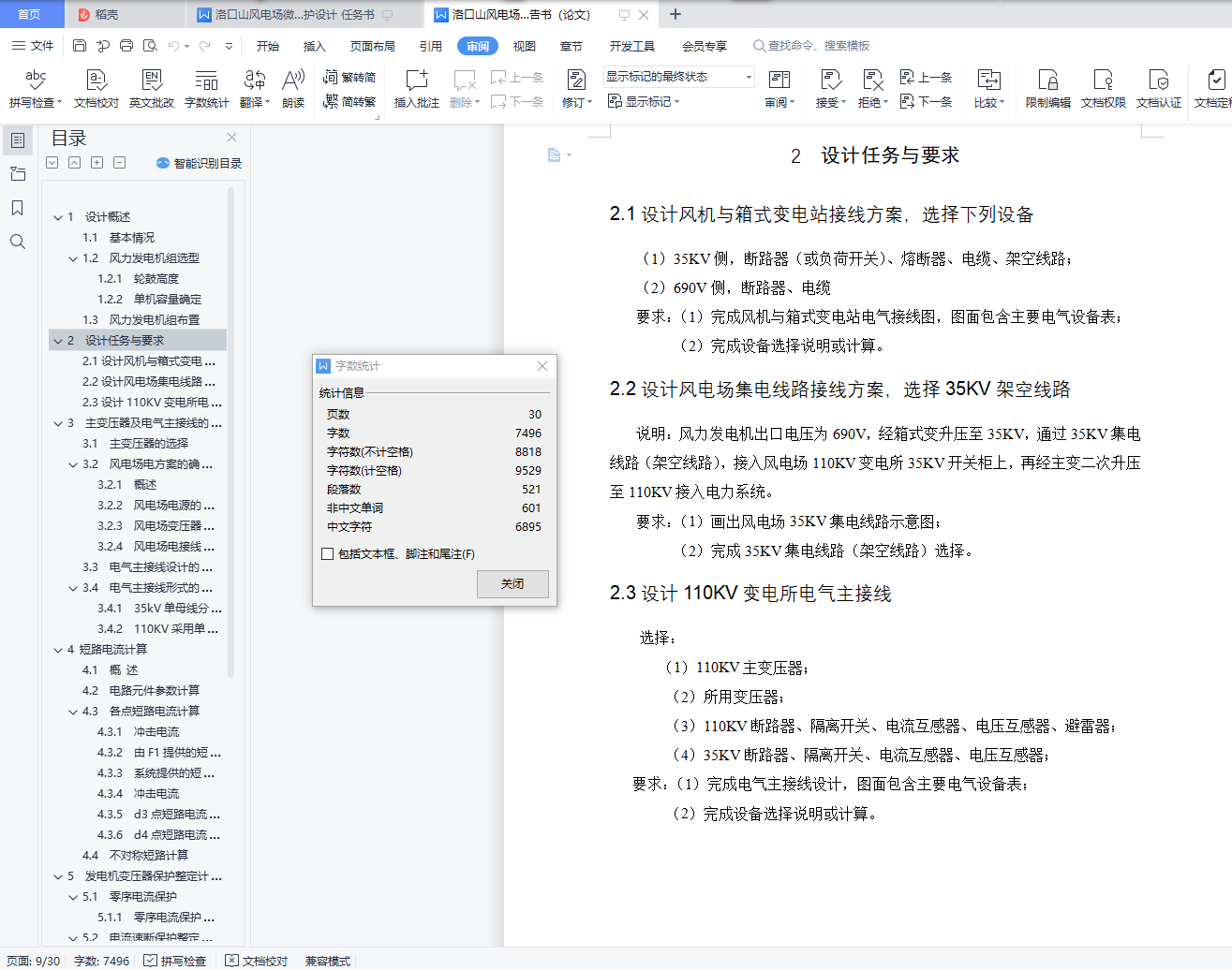 本次设计洛口山风电场装机规模为48MW,共安装24台容量为2MW的风力发电机组。根据接入系统方案论证,拟以1回110kV线路T接鲤鱼井~水湾110kV线路,导线型号定为LGJ-240,线路长度约为1km。本工程风力发电机―箱变的组合方式采用一机一变单元接线方式。风力发电机组出口电压为0.69kV,采用低压电缆接至箱式变电站,经箱变升压至35kV,通过35kV集电线路汇至110kV升压站。35kV 场内集电线路采用架空和电缆混合线路,架空线长度约30.9km,电缆长度约2.3km。确定电气一次主接线方案,进行电气一次短路电流计算和电气设备选型,绘制电气主接线图。由同组负责电气一次设计的同学完成。确定线路微机保护配置、短路电流计算、保护整定计算。绘制线路保护配置图、保护接线图。确定主变压器微机保护配置、短路电流计算、保护整定计算。绘制主变压器保护配置图、保护接线图。撰写设计说明书,详细说明保护配置方案、保护整定计算过程等。