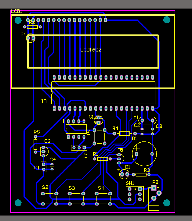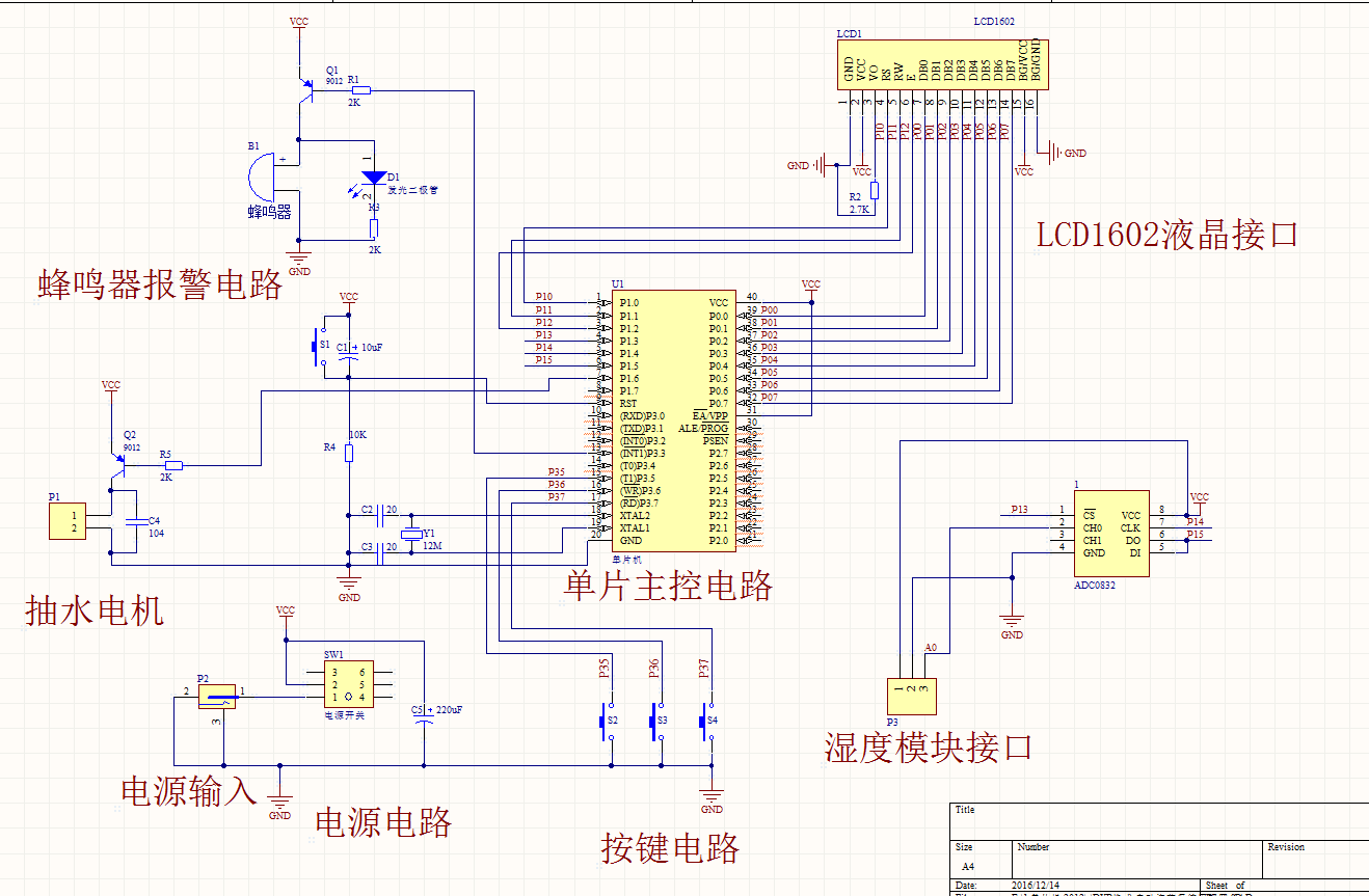 本系统主要由AT89C51单片机、电源、电磁继电器、YL-69土壤湿度传感器、LCD1602显示屏五大模块组成。首先由YL-69土壤湿度传感器把检测到的土壤湿度值发送给AT89C51单片机,然后用LCD1602显示屏来显示当前数值,再经AT89C51单片机将湿度传感器输入的数据与提前设定好的湿度上下限阈值做比较;若土壤湿度值低于设定的"最小阈值",蜂鸣器发出蜂鸣警报土壤干燥需要浇灌,此时单片机输出口给继电器发出信号让线圈通电,常开触点闭合,水泵电路的电源导通,开始对植物进行浇灌。当浇水到一定程度后,土壤当前湿度值大于我们设定的湿度"最大阈值"时,单片机会输出信号使继电器的常开触点断开,水泵电路电源关闭,停止对植物浇灌。