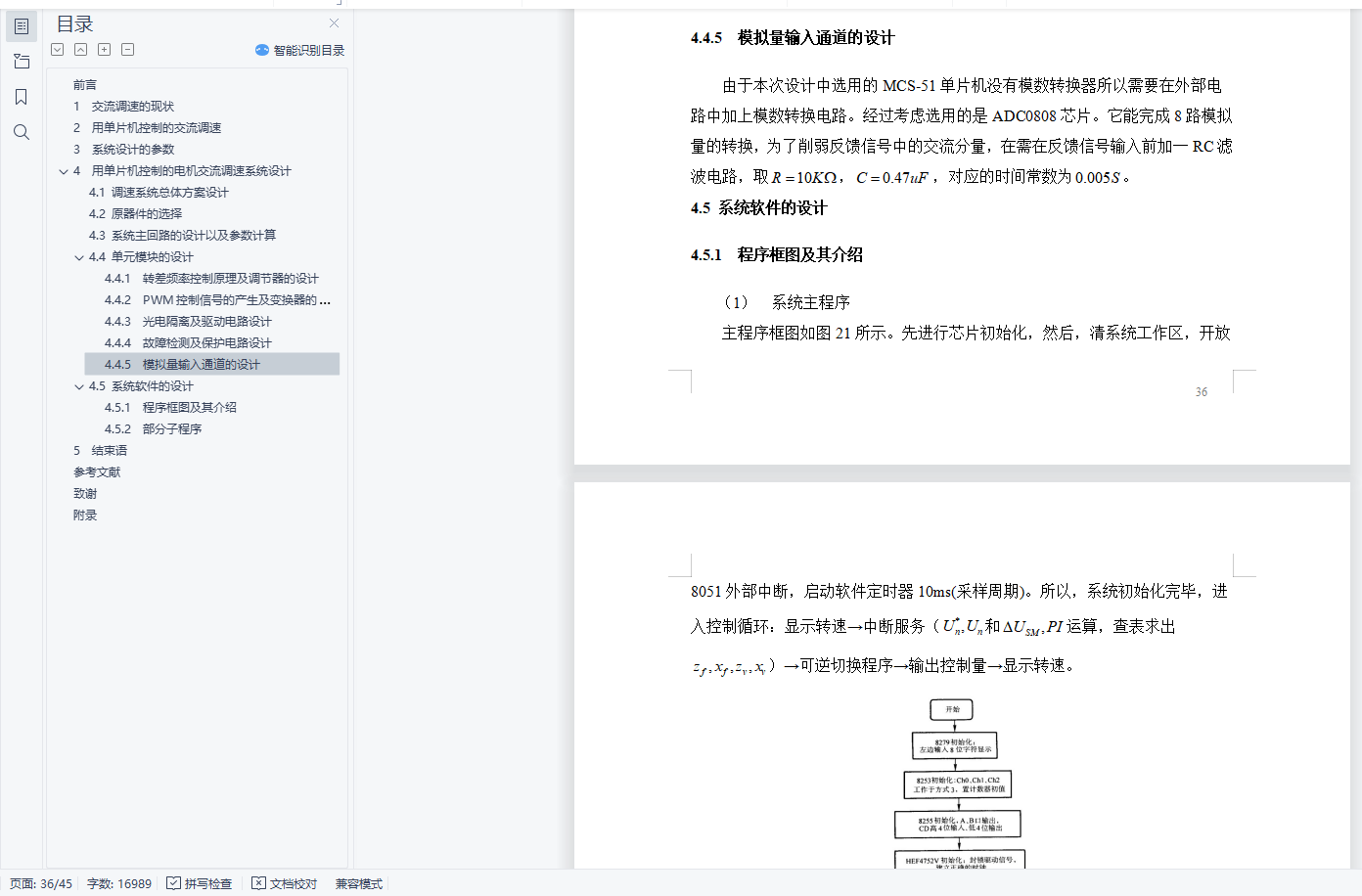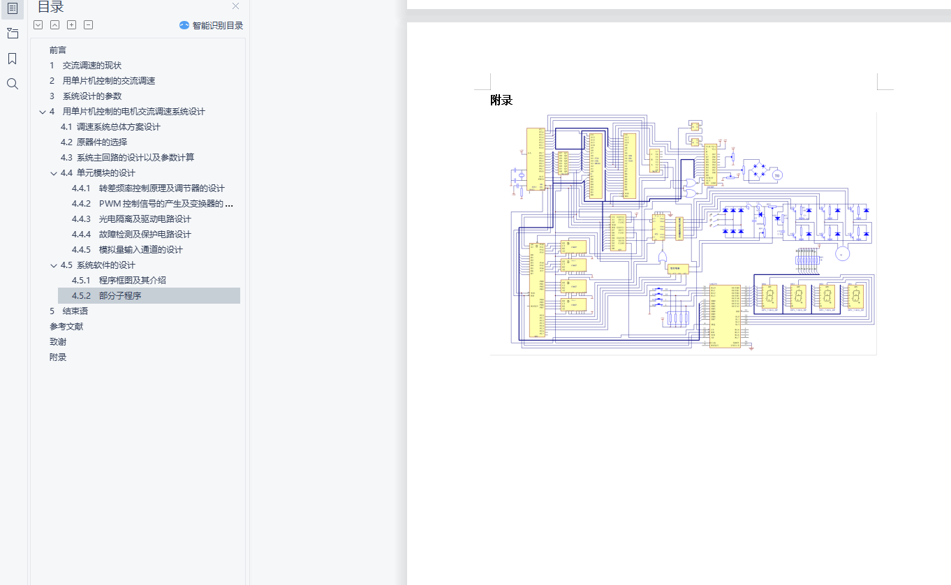 文 摘 单片机控制的变频调速系统设计思想是用转差频率进行控制。通过改变程序来达到控制转速的目的。由于设计中电动机功率不大,所以整流器采用不可控电路,电容器滤波;逆变器采用电力晶体管三相逆变器。系统的总体结构主要由主回路,驱动电路,光电隔离电路,HEF4752大规模集成电路,保护电路,Intel系列单片机,Intel8253定时/记数器,Intel8255可编程接口芯片,Intel8279通用键盘/显示器,I/O接口芯片,CD4527比例分频器和测速发电机等组成。回路中有了检测保护电路就可以使整个系统运行的可靠性有了保障。