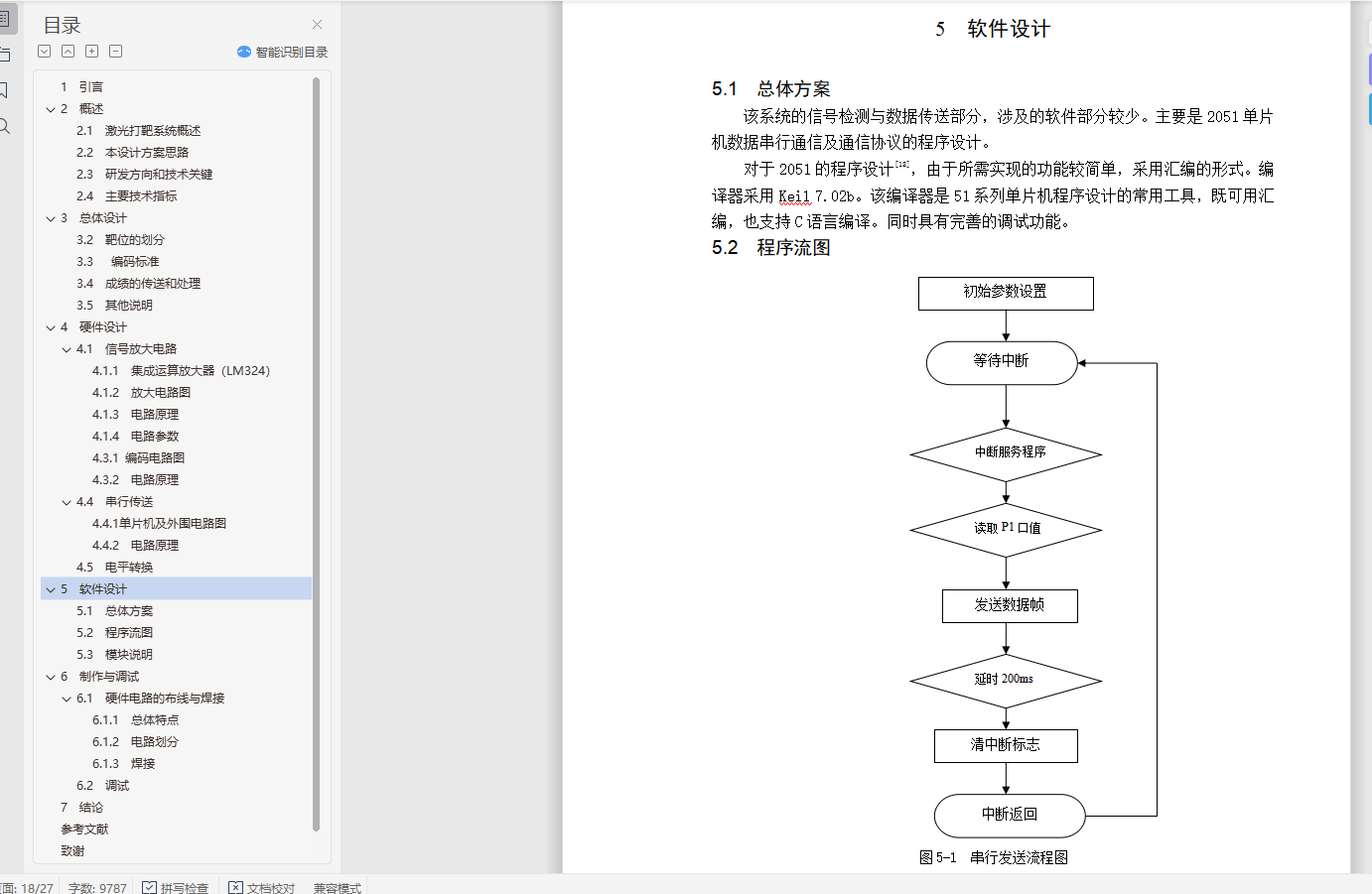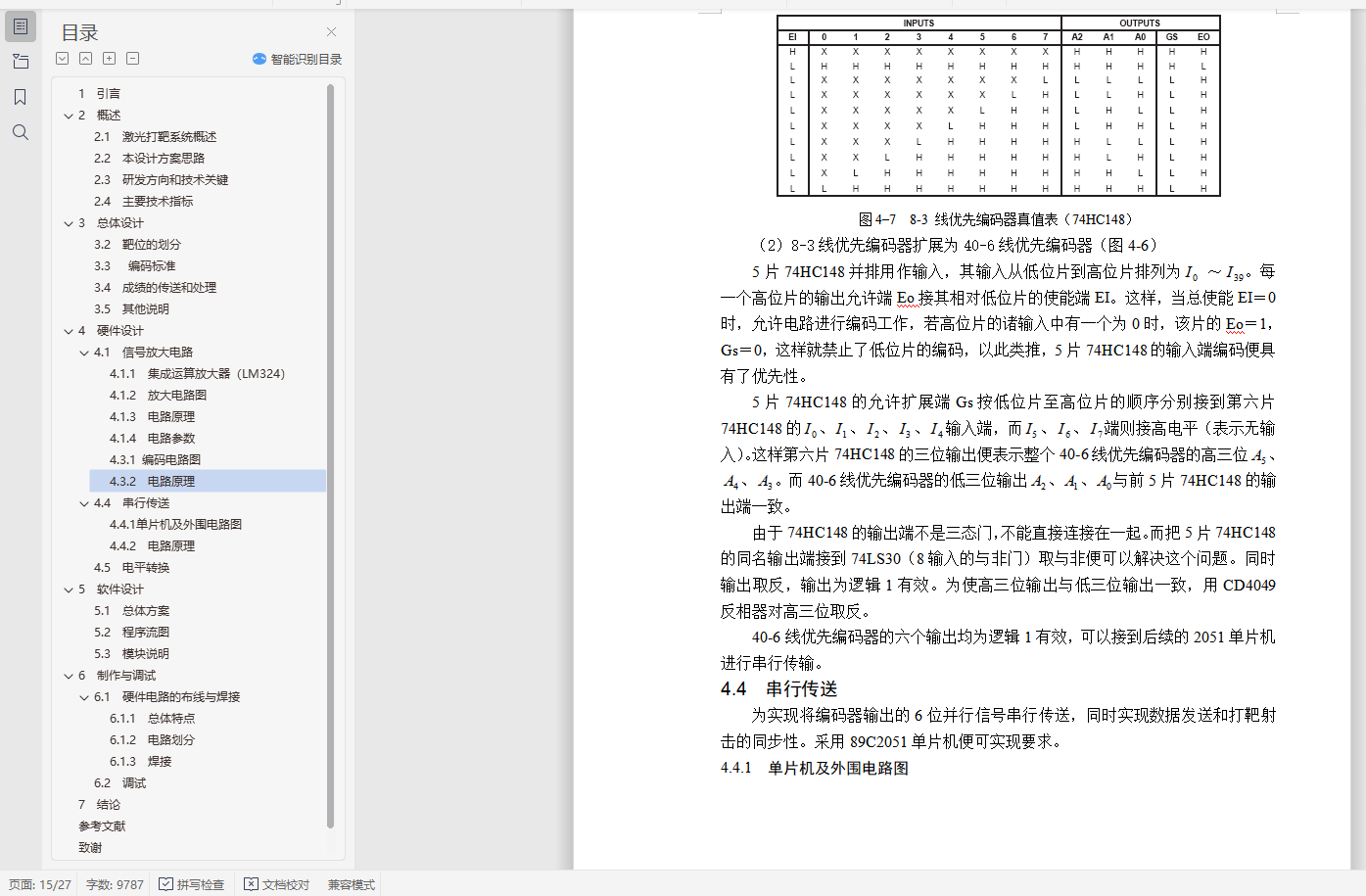 激光打靶系统的主要信号处理过程包括:信号的放大、编码和数据传输。信号由光电探测器检测后传送到相应的放大电路,放大电路采用集成运算放大器。按原先对光电探测器的编码规则采用多路优先编码器对信号进行编码。最后把编码值以串口的形式传送到计算机,利用计算机的强大功能对打靶结果进行各种处理。与计算机之间的串行数据传输由89C2051单片机实现。89C2051单片机的程序,使用keil编译器进行设计和调试完成,其主要功能是控制数据的串行传送,实现与计算机的串口通信。