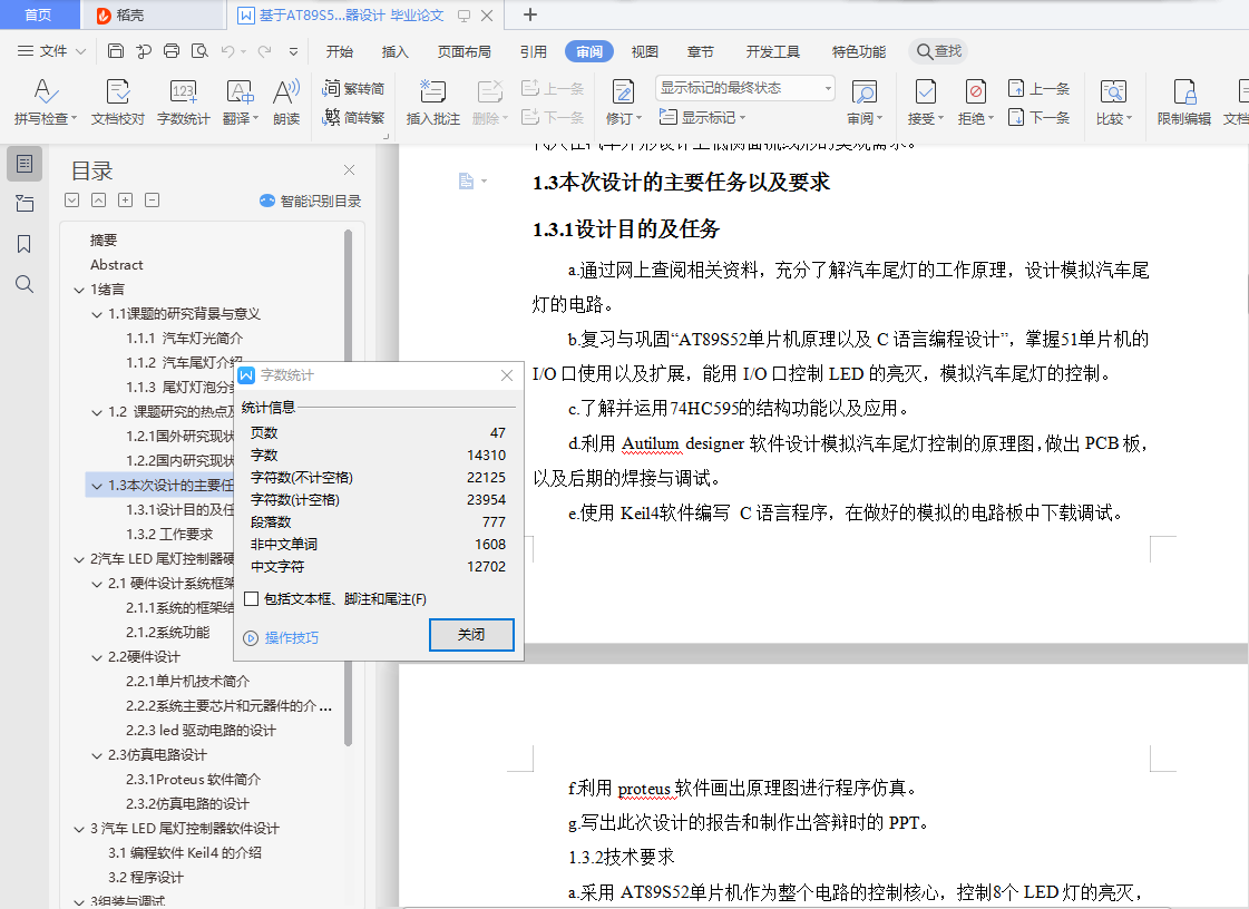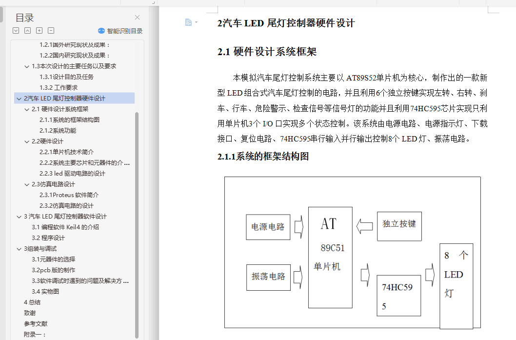 本次论文主要利用AT89S52单片机模拟汽车尾灯进行智能控制的控制器,用8个LED灯模拟汽车尾灯,6个独立按键分别对应了右转、左转、危险警示、夜间模式切换、检查信号、刹车不同的状态,在实际设计模拟电路中,我加入了74HC595芯片,减少了使用51单片机的I/0口的使用,在复杂的电路中,这是一种很好的方式实现一种芯片控制多个不同电路的优点。在实际设计模拟汽车尾灯控制电路中,了解了LED驱动电路特性,提出相应解决方案,进行可靠性的设计。在这次设计模拟汽车尾灯控制电路,能很好的综合运用我们在课程中学习到的51单片机的功能与运用,还有C语言编程,模拟电子电路基础,以及数字电路基础,在实际应用中,有许多种方法设计汽车尾灯的控制,在本次设计模拟电路中,我用的是AT89S52单片机作为整个电路的设计核心来控制整个电路的模拟功能,整个电路变的简单、直观,制作方便,而且容易操作,51单片机可反复擦写,性能可靠等优点。