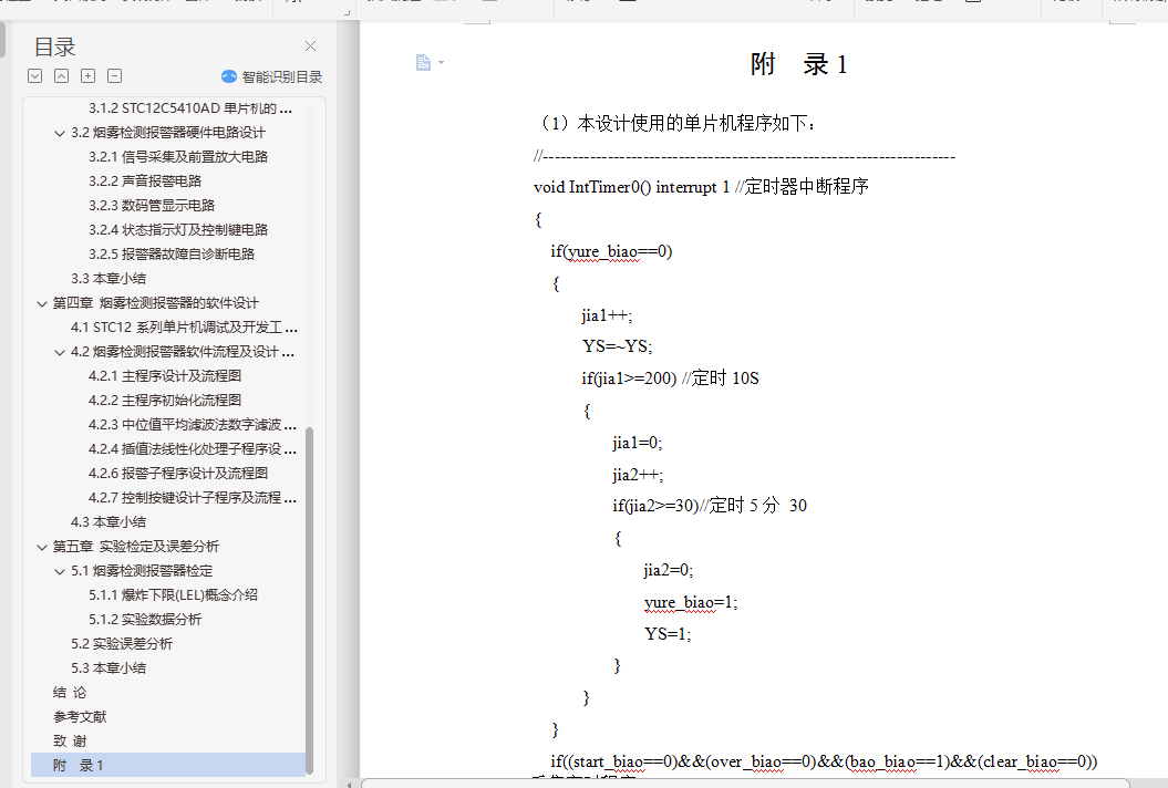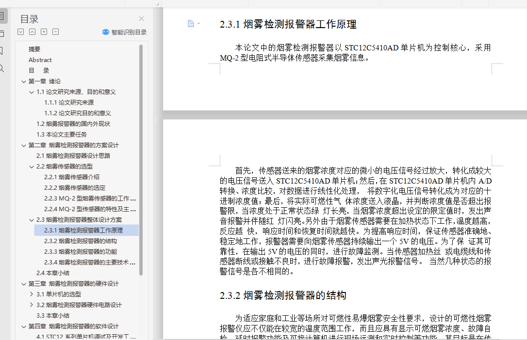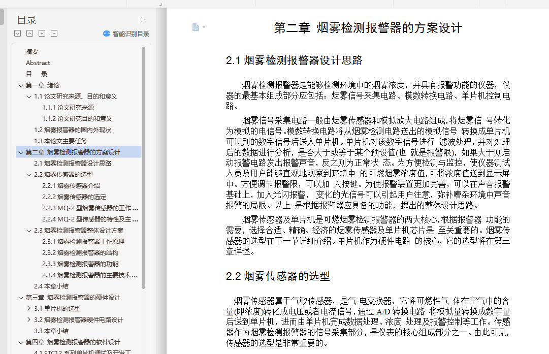 本论文以电阻式烟雾传感器和单片机技术为核心并与其他电子技术相结合, 设计出一种技术水平较好的烟雾报警器。其中选用MQ-2型半导体可燃气体敏感元件烟雾传感器实现烟雾的检测,具有灵敏度高、响应快、抗干扰能力强等优点,而且价格低廉,使用寿命长。选用的STC12C5410AD单片机,其整合了A/D转换、硬件乘法器、硬件脉宽调制器等资源,具 有高速、低功耗、超强抗干扰等优点,是目前同类技术中性价比较高的产 品。