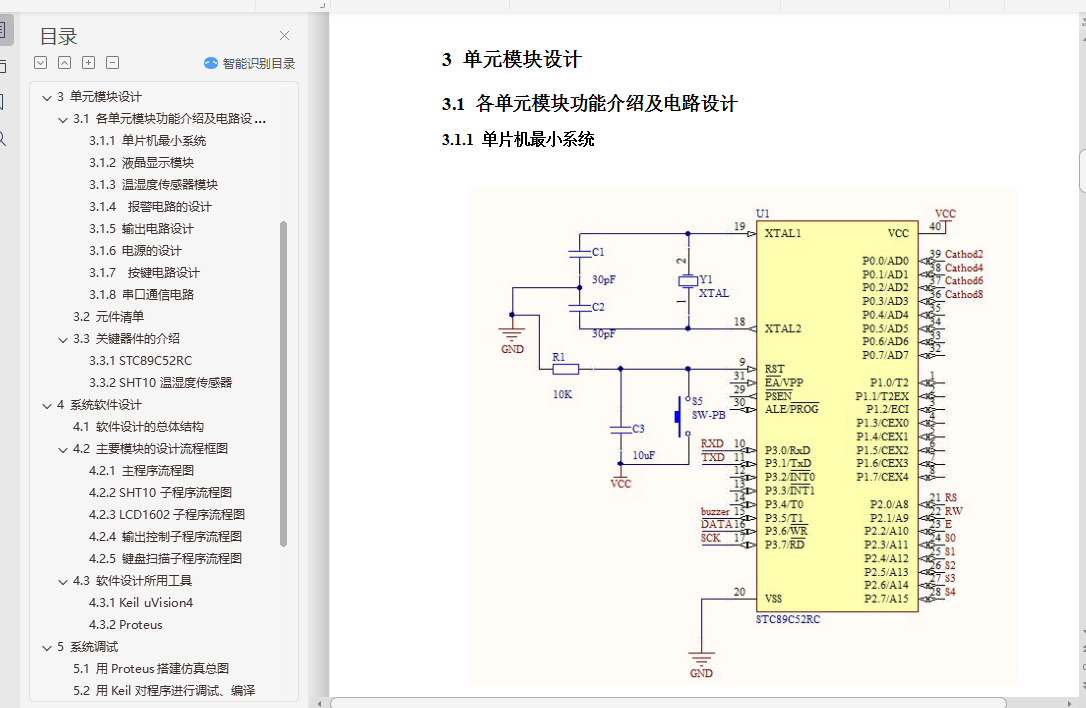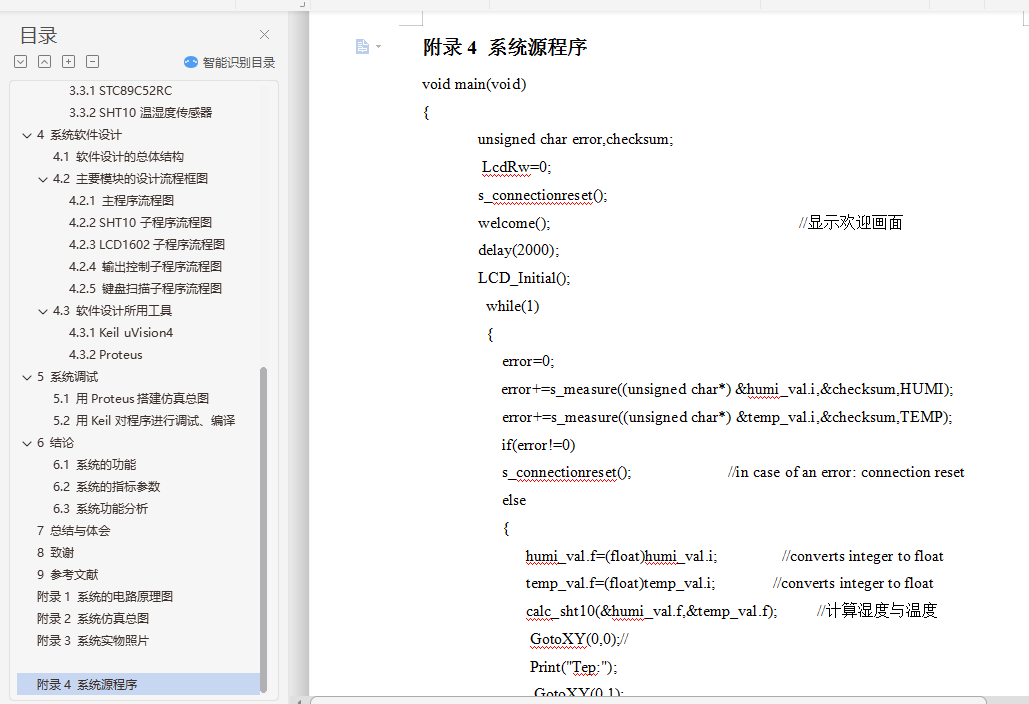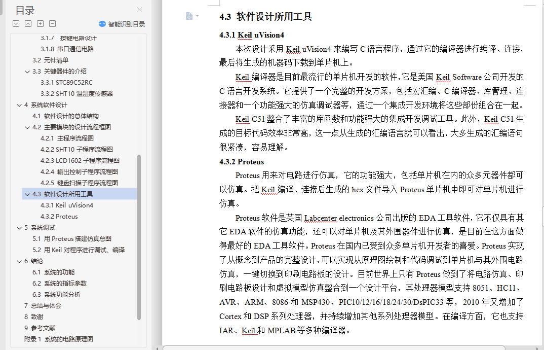 大棚温湿度自动控制系统设计摘 要:本设计是基于STC89C52RC单片机的大棚温湿度自动控制系统,采用SHT10作为温湿度传感器,LCD1602液晶屏进行显示。SHT10使用类似于I2C总线的时序与单片机进行通信,由于它高度集成,已经包括A/D转换电路,所以使用方便,而且准确、耐用。LCD1602能够分两行显示数据,第一行显示温度,第二行显示湿度。这个控制系统能够测量温室大棚中的温度和湿度,将其显示在液晶屏LCD1602上,同时将其与设定值进行对比,如果超出上下限,将进行报警并启动温湿度调节设备。此外,还可以通过独立式键盘对设定的温湿度进行修改。通过设计系统原理图、用Proteus软件进行仿真,证明了该系统的可行性。关键词:STC89C52RC,SHT10,I2C总线,独立式键盘,温湿度自动控制Abstract: This design is an automatic temperature and humidity controller for greenhouses, with the STC89C52RC MCU being its main controller. It uses the SHT10 as the temperature and humidity sensor, and the LCD1602 to display the messages. The SHT10 uses a timing sequence much like the I2C to communicate with the micro-controller. Because it’s a highly integrated chip, it already includes an analog to digital converter. Therefore, it’s quite convenient to use, and also accurate and durable. The LCD1602 can display two lines of messages, with the first line for temperature and the second line for humidity. The design can measure the temperature and humidity in a greenhouse, and then display it on a LCD1602. Meanwhile, it compares the data with the set limit. If the limit is exceeded, then the system will send out a warning using a buzzer and activate the temperature and humidity controlling equipment. Besides, the set limit can be modified with the independent keyboard. Through schematic design and Proteus simulation, the feasibility of this design has been proved.Keywords: STC89C52RC, SHT10, I2C bus, independent keyboard, temperature and humidity control目 录1 前言 12 总体方案设计 32.1 温湿度控制系统的设计指标要求 32.2 系统设计的原则 32.2.1 可靠性 32.2.2 性价比 32.3 方案比较 42.3.1 方案一 42.3.2 方案二 42.4 方案论证 52.5 方案选择 53 单元模块设计 63.1 各单元模块功能介绍及电路设计 63.1.1 单片机最小系统 63.1.2 液晶显示模块 83.1.3 温湿度传感器模块 83.1.4 报警电路的设计 93.1.5 输出电路设计 103.1.6 电源的设计 123.1.7 按键电路设计 133.1.8 串口通信电路 143.2 元件清单 153.3 关键器件的介绍 173.3.1 STC89C52RC 173.3.2 SHT10温湿度传感器 194 系统软件设计 224.1 软件设计的总体结构 224.2 主要模块的设计流程框图 244.2.1 主程序流程图 244.2.2 SHT10子程序流程图 254.2.3 LCD1602子程序流程图 274.2.4 输出控制子程序流程图 284.2.5 键盘扫描子程序流程图 294.3 软件设计所用工具 314.3.1 Keil uVision4 314.3.2 Proteus 315 系统调试 325.1 用Proteus搭建仿真总图 325.2 用Keil对程序进行调试、编译 336 结论 366.1 系统的功能 366.2 系统的指标参数 366.3 系统功能分析 367 总结与体会 388 致谢 399 参考文献 40附录1 系统的电路原理图 41附录2 系统仿真总图 42附录3 系统实物照片 43附录4 系统源程序 44