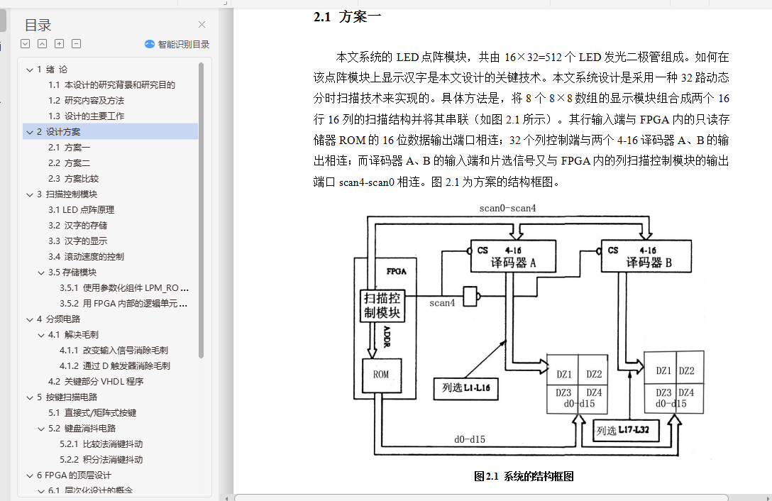 本系统由扫描控制模块、只读存储器ROM和FPGA外面的LED点阵显示模块、一个反相器和两个4-16译码器构成。其中:扫描控制模块和只读存储器ROM集成在FPGA芯片内部。两个4-16译码器(74LS154)和一个反相器配合FPGA中的列扫描控制模块共同完成了两块16×16点阵显示模块的32列的扫描控制。FPGA定义的只读存储器ROM中保存了要显示的汉字的数据,并以16位的数据宽度输出到LED阵显示模块的行端,配合列扫描控制共同完成汉字的滚动显示。