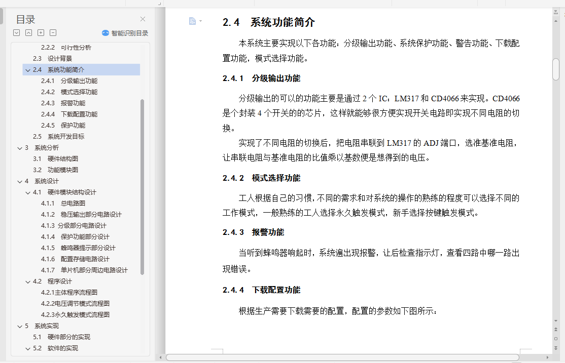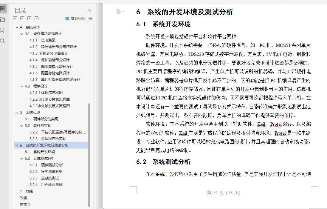 本文介绍了该分级输出四路带保护直流电源系统的具体开发过程,通过对程控电源的实验测试和保护电源的研究,实现了2.0V-4.0V范围内任何一级的稳定输出,分级输出四路带保护直流电源系统可以根据生产的需要通过USB配置程序加载自己需要的配置,同时系统具有保护功能,当出现电流过大的各种情况(遥控器出现短路),该路会制动断开,直到下一轮测试才恢复,系统设计部分主要介绍了单片机硬件及软件的具体设计,包括可行性分析、设计方案等;系统实现部分主要介绍了电压分级输出及控制模块的实现。