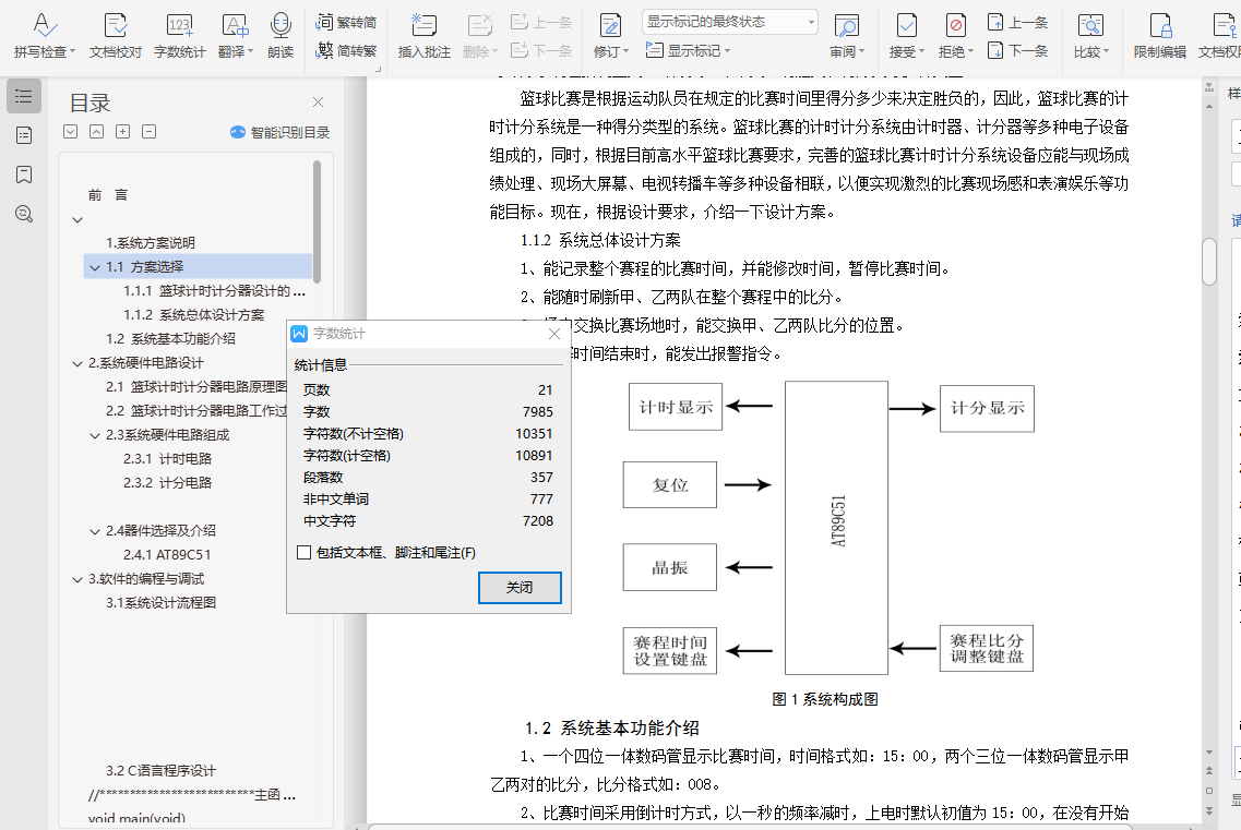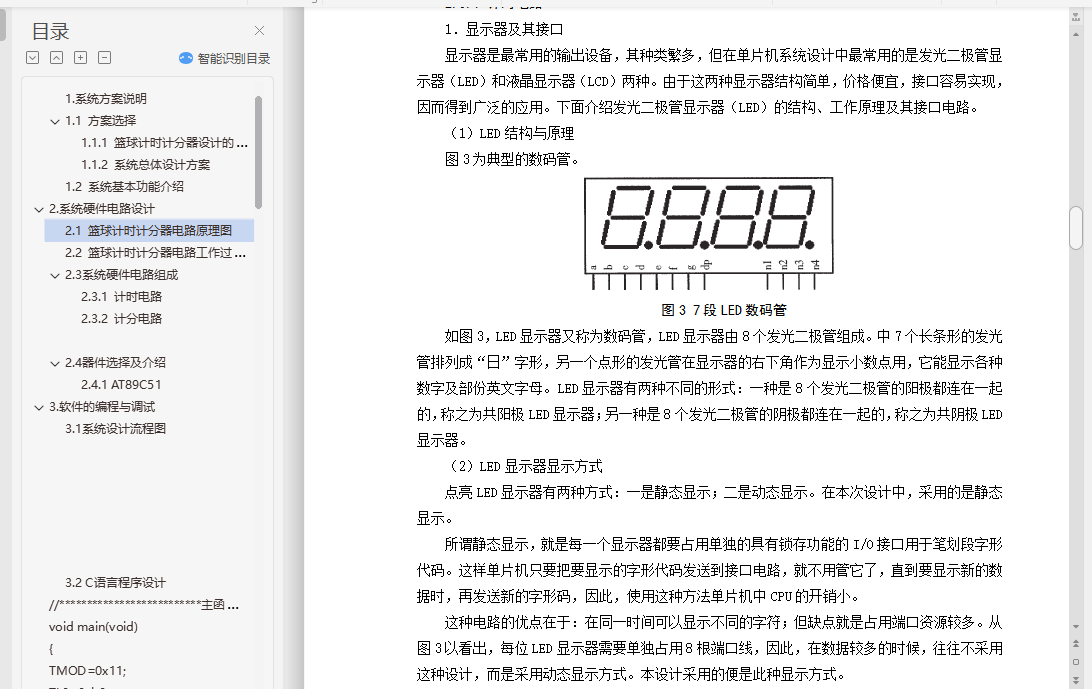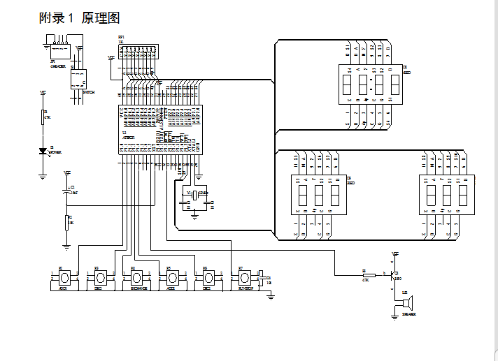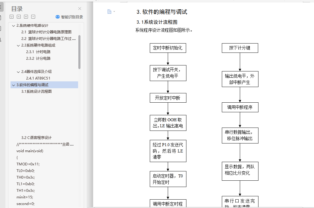 系统采用模块化设计,主体分为计时显示模块、计分显示模块、定时报警、按键控制键盘模块。每个模块的程序结构简单、任务明确,易于编写、调试和修改。程序可读性好,对程序的修改可局部进行,其他部分可保持不变。编程后利用Keil C51软件来进行编译,再将生成的HEX文件装入芯片中,采用Proteus软件仿真,检验功能是否能够正常实现,随后可用Protel99画出硬件电路图。本设计中系统硬件电路主要由以下几个部分组成:单片机AT89C51、计时电路、计分电路、报警电路和按键开关。