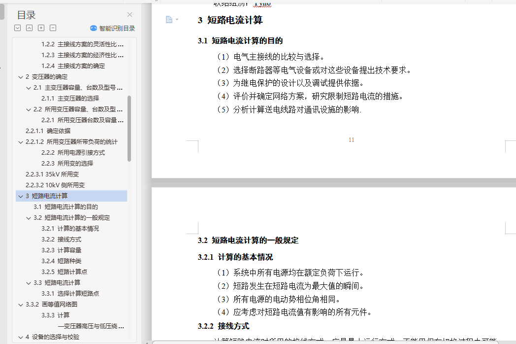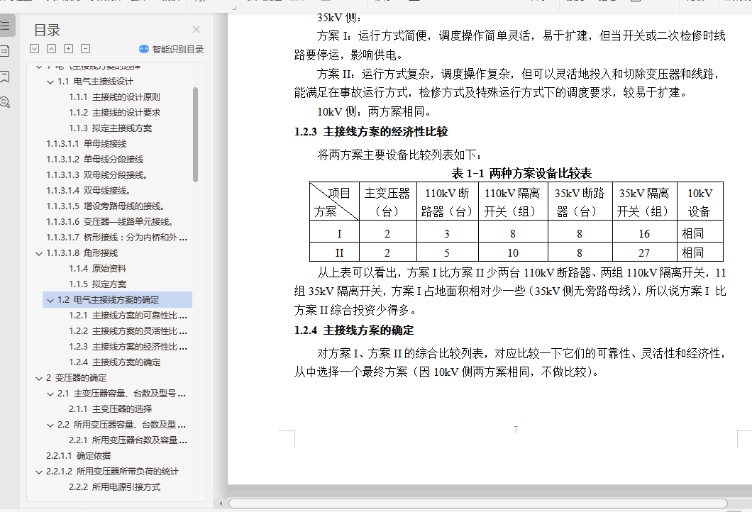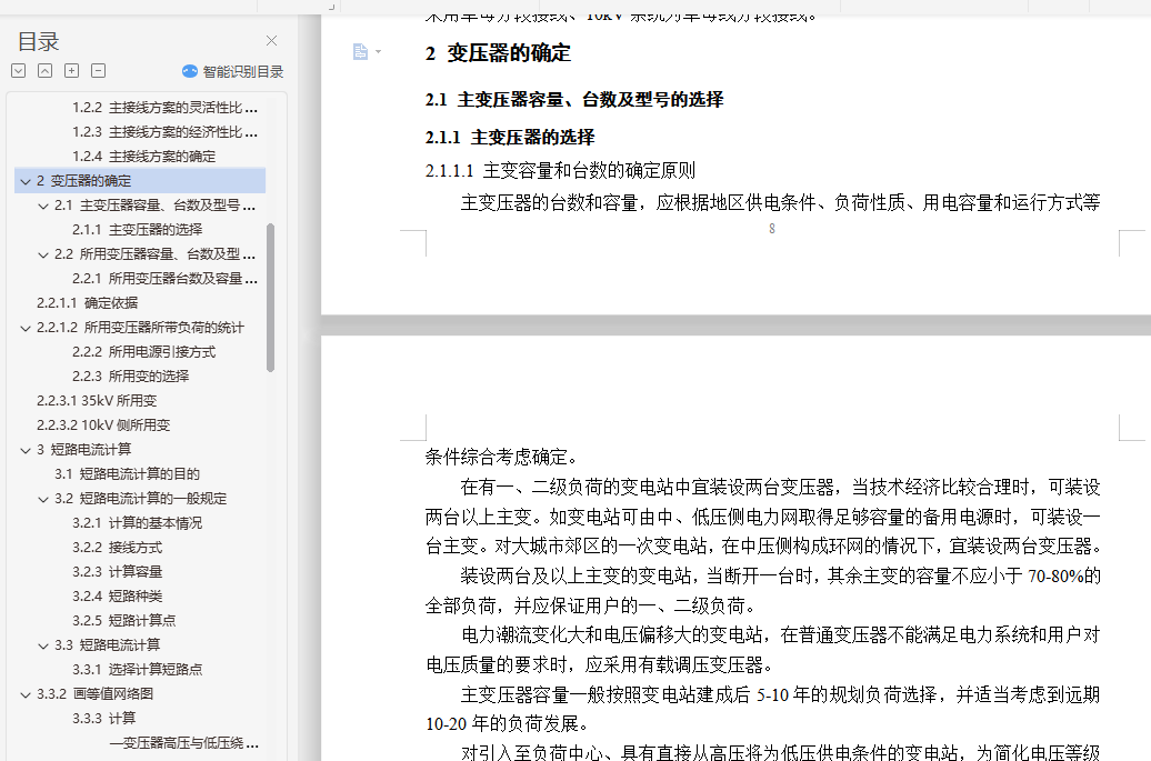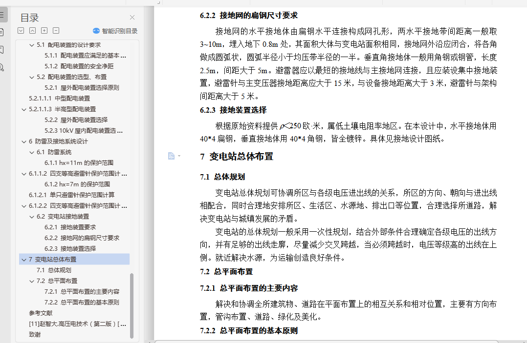 摘要:本文是对110kV 变电站电力系统进行总体分析,然后进行计算和初步设计,确定了变电站电气一次系统主接线的形式。该变电站设有两台主变压器,站内主接线分为 110kV、35kV 和 10kV 三个电压等级。本次设计进行了电气主接线的设计和选择、短路电流计算、主要电气设备选择及校验(包括断路器、隔离开关、互感器、避雷器等)、各电压等级配电装置设计、防雷保护接地系统设计和变电站总体布置。本设计以《电力工程电气设计手册》、《35~110kV高压配电装置设计规范》等规范规程为依据,设计的内容符合国家有关经济技术政策,所选设备全部为国家推荐的新型产品,技术先进、运行可靠、经济合理。