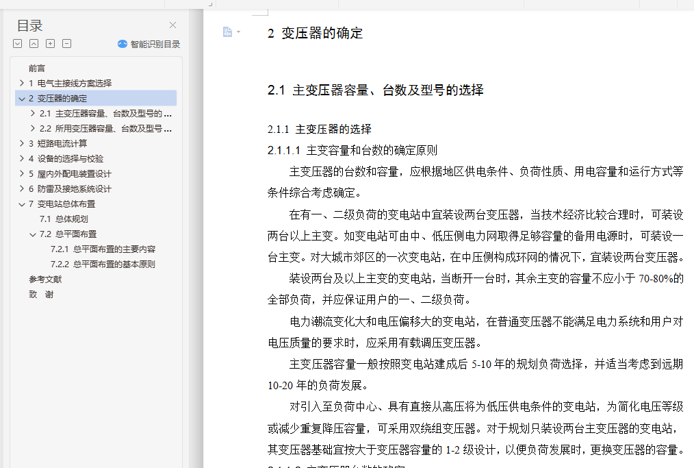 摘 要:变电站是电力系统中变换电压、接受和分配电能、控制电力能源的流向和调整电压的电力设施,它通过其变压器将各级电压的电网联系起来。直接影响整个电力系统的安全与经济运行。变电所电器主接线是电力系统接线组成的一个重要部分,而且电气主接线的选择直接关系到全站各种电气设备的选择,配电装置的布置等方面,是变电站电气部分投资大小的决定性因素。本次设计为某郊区110kv变电站一次初步设计,从主接线、短路电流计算、主要电气设备的选择等几个方面对变电站设计进行了阐述,并绘制了电气主接线图和布置图。设有两台主变压器,站内主接线分为110kV、35kV和10kV 三个电压等级。设计进行了电气主接线的设计和选择、短路电流计算、主要电气设备选择及校验(包括断路器、隔离开关、互感器、避雷器等)、各电压等级配电装置设计、防雷保护接地系统设计和变电站总体布置。本设计内容符合国家有关经济技术政策,所选设备全部为国家推荐的新型产品,技术先进、运行可靠、经济合理。