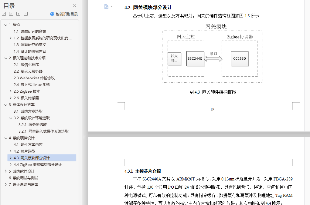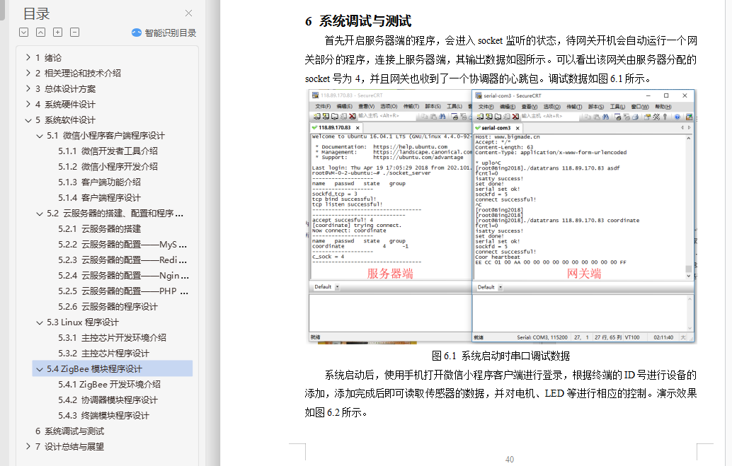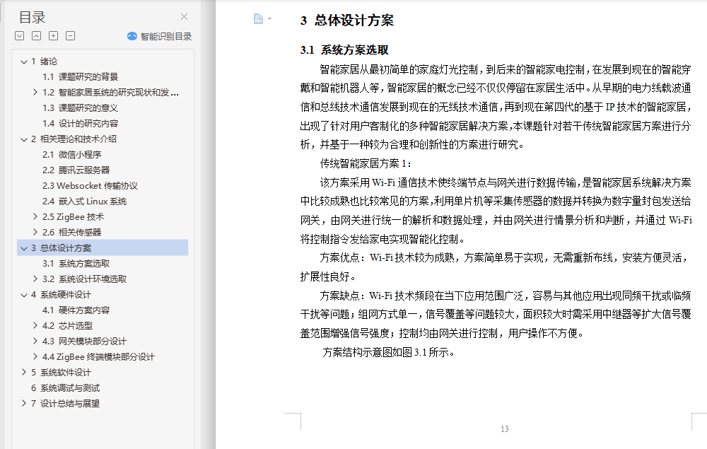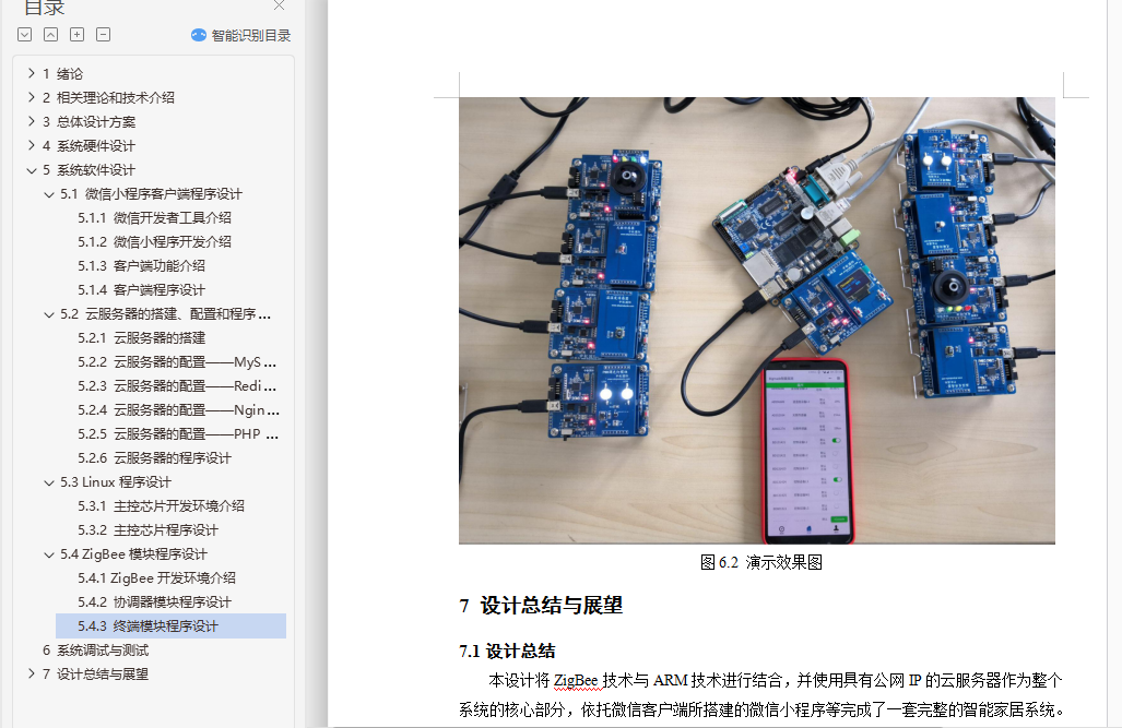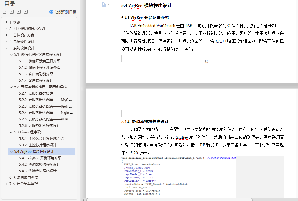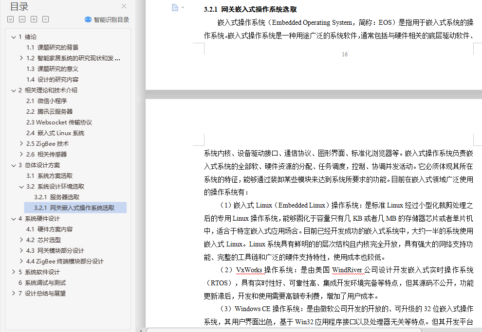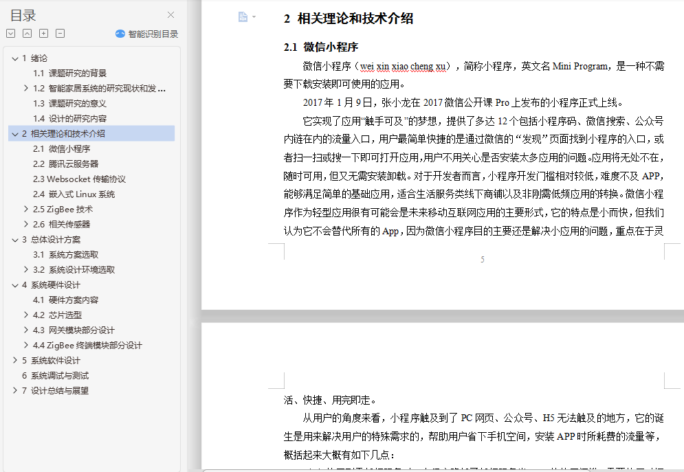 基于微信的智能家居控制系统的设计与实现目 录1 绪论 61.1 课题研究的背景 61.2 智能家居系统的研究现状和发展前景 61.3 课题研究的意义 71.4 设计的研究内容 82 相关理论和技术介绍 82.1 微信小程序 82.2 腾讯云服务器 102.3 Websocket传输协议 112.4 嵌入式Linux系统 122.5 ZigBee技术 122.6 相关传感器 143 总体设计方案 163.1 系统方案选取 163.2 系统设计环境选取 184 系统硬件设计 204.1 硬件方案内容 204.2 芯片选型 204.3 网关模块部分设计 224.4 ZigBee终端模块部分设计 245 系统软件设计 275.1 微信小程序客户端程序设计 275.2 云服务器的搭建、配置和程序设计 325.3 Linux程序设计 395.4 ZigBee模块程序设计 416 系统调试与测试 437 设计总结与展望 447.1设计总结 447.2设计展望 45